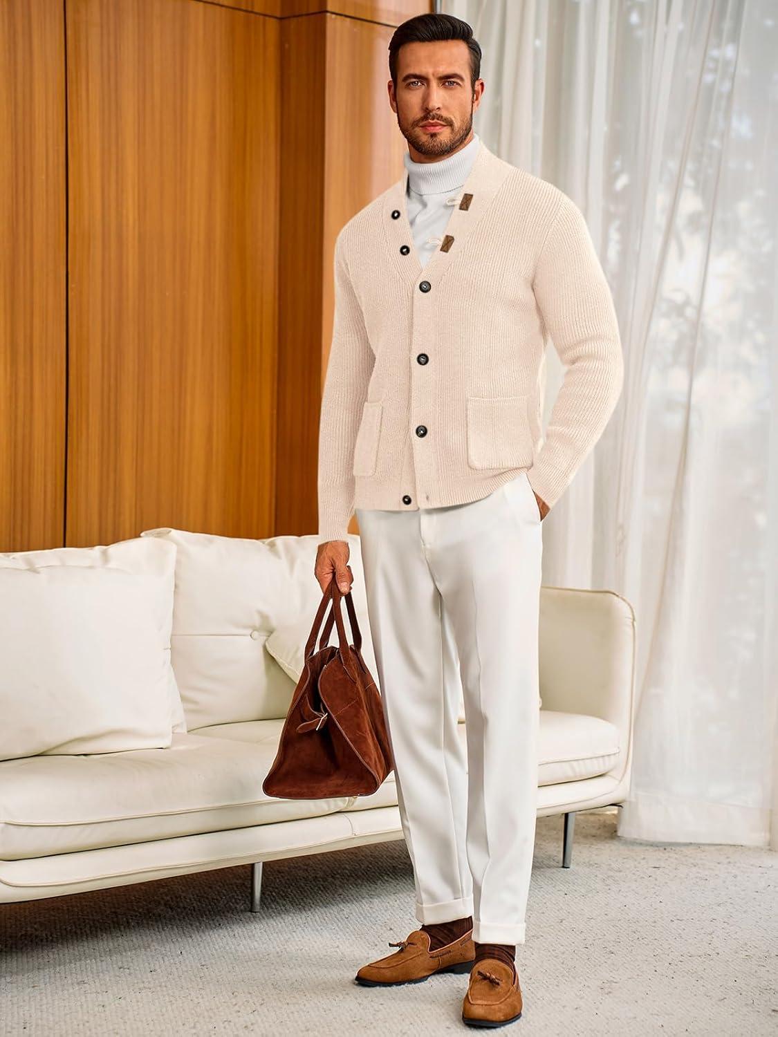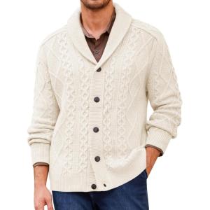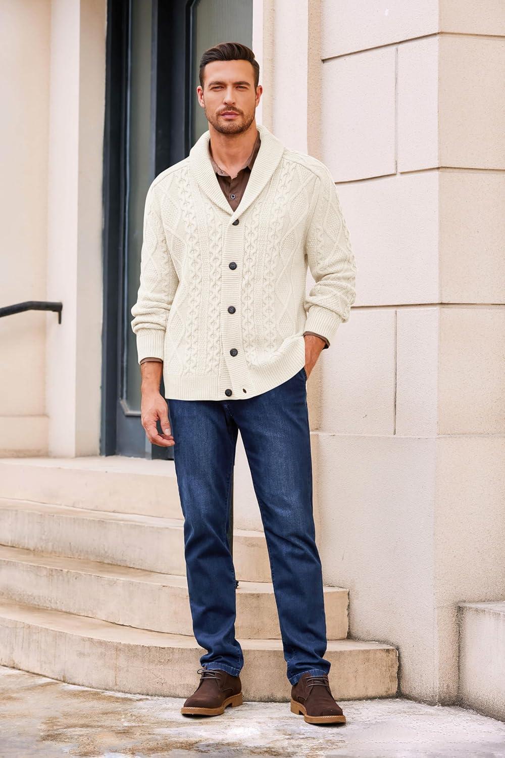 Runcati Mens Cable Knit Cardigan Sweater Shawl Collar Casual Button Down Long Sleeve Sweaters(White)