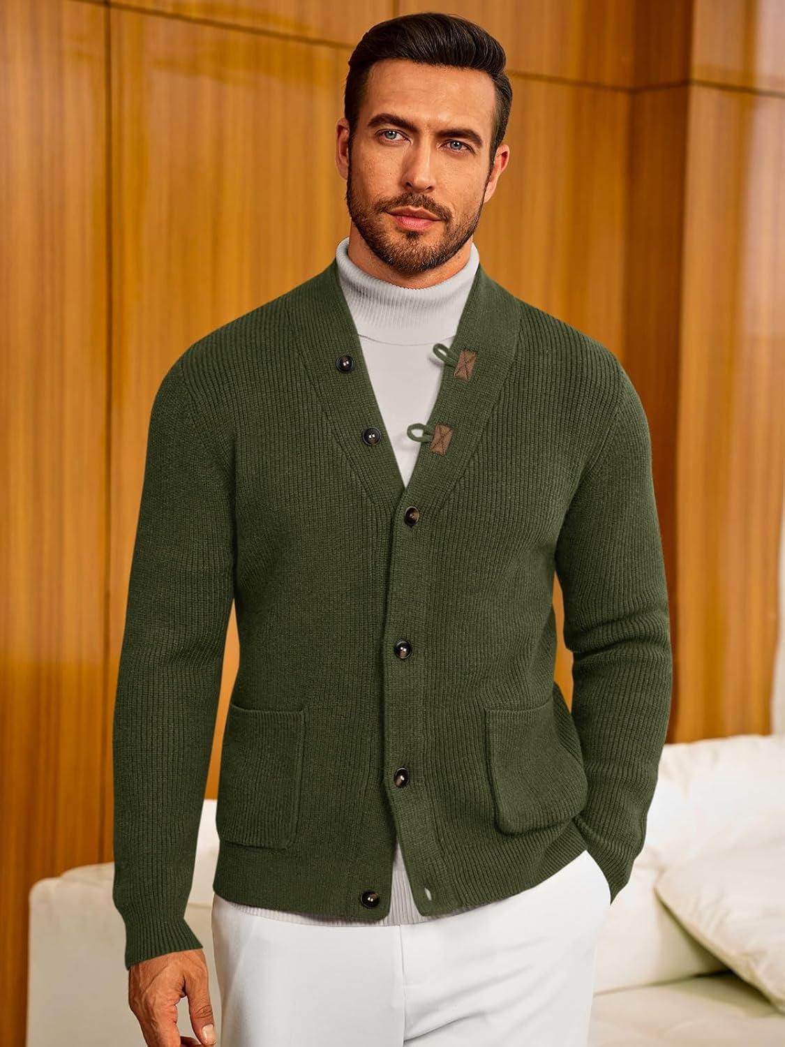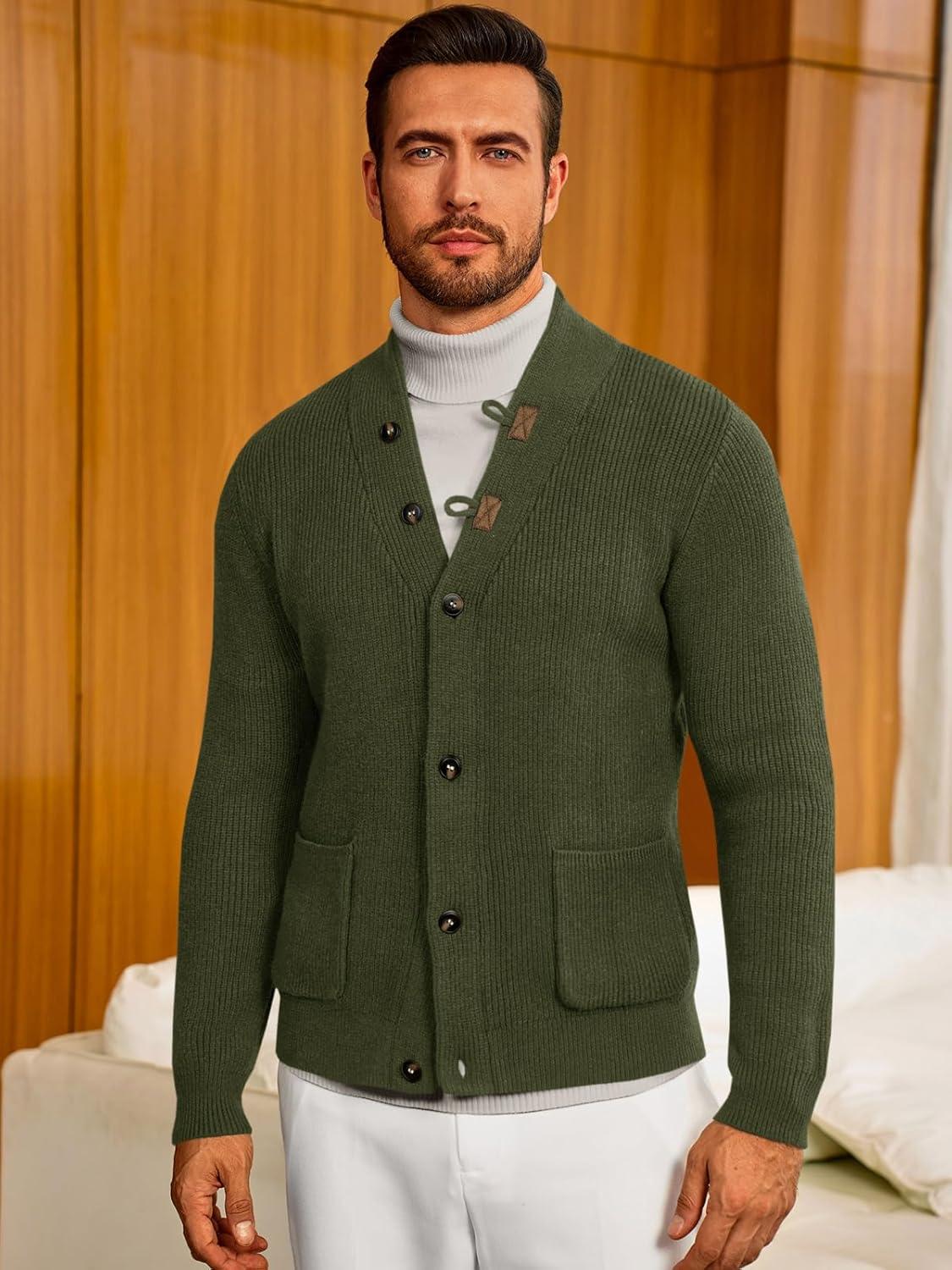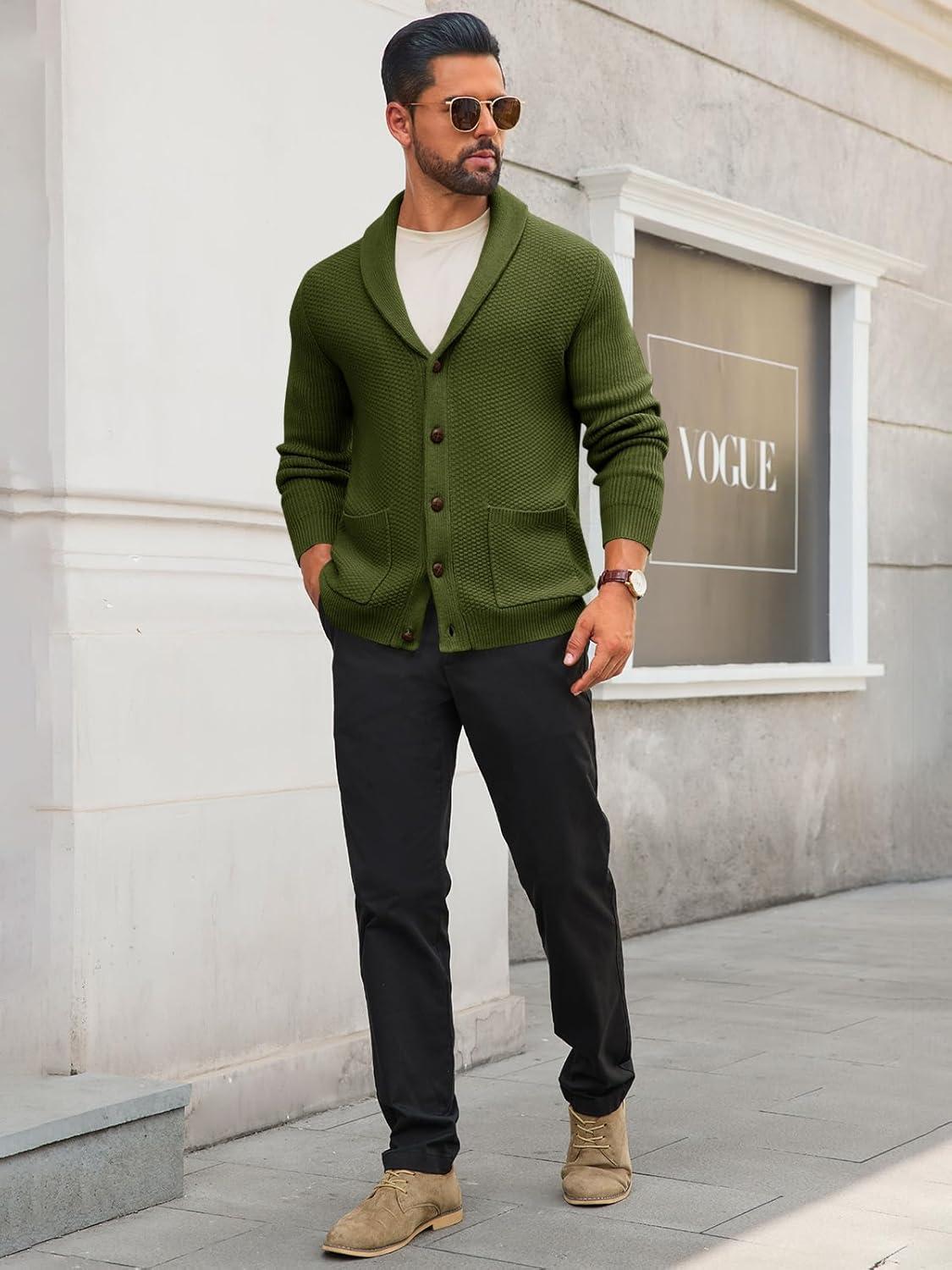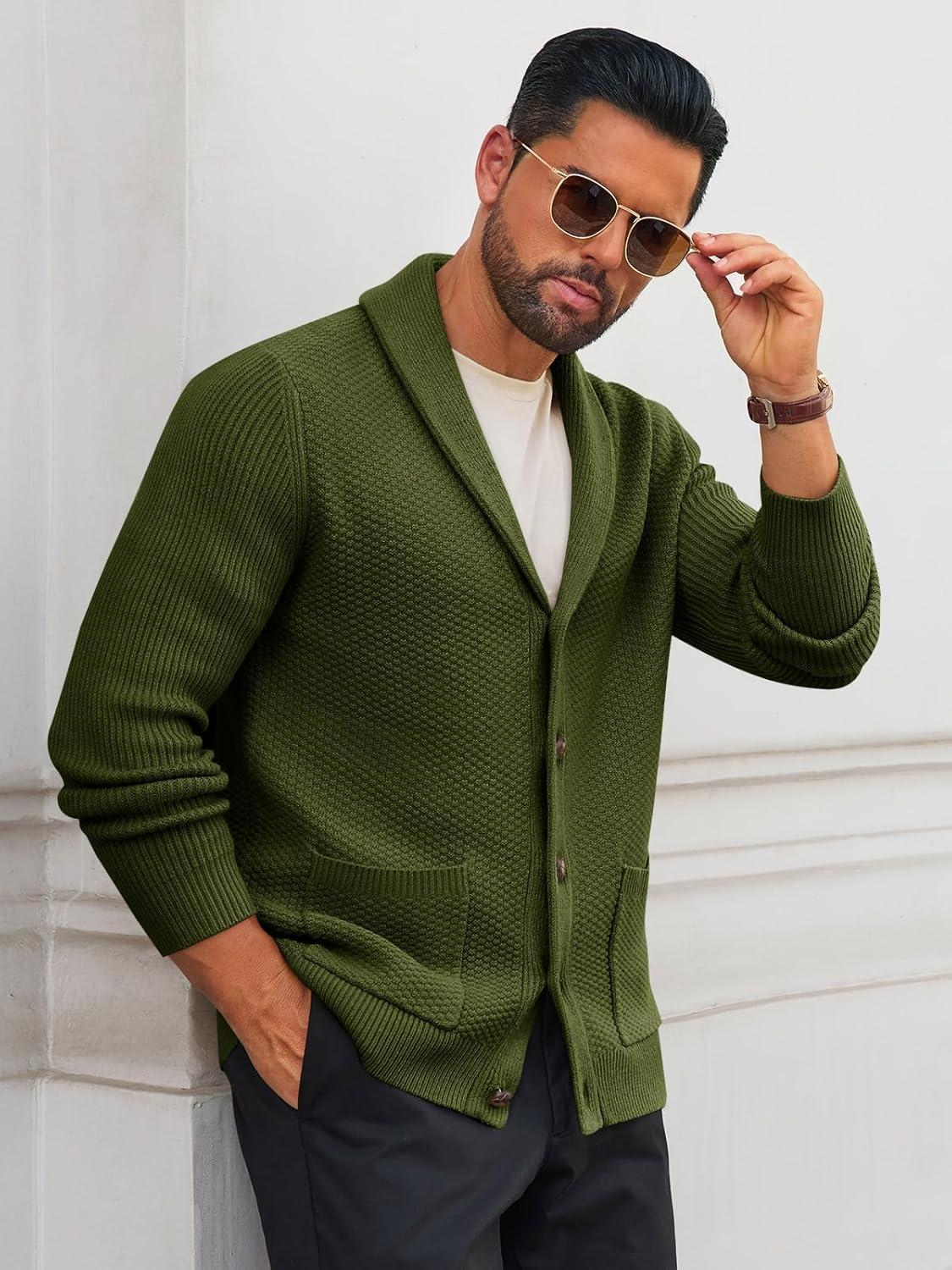 Runcati Mens Shawl Collar Cardigan Sweater Button Down Textured Knit Sweaters Casual Chunky Cardigan with Pockets(Army Green)