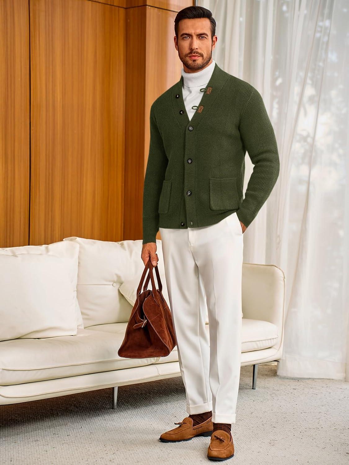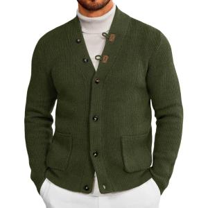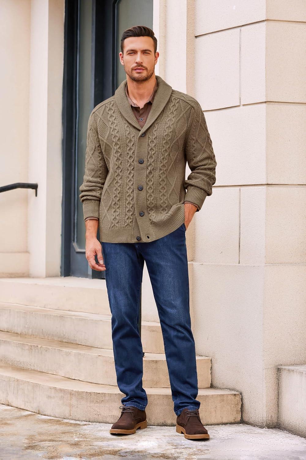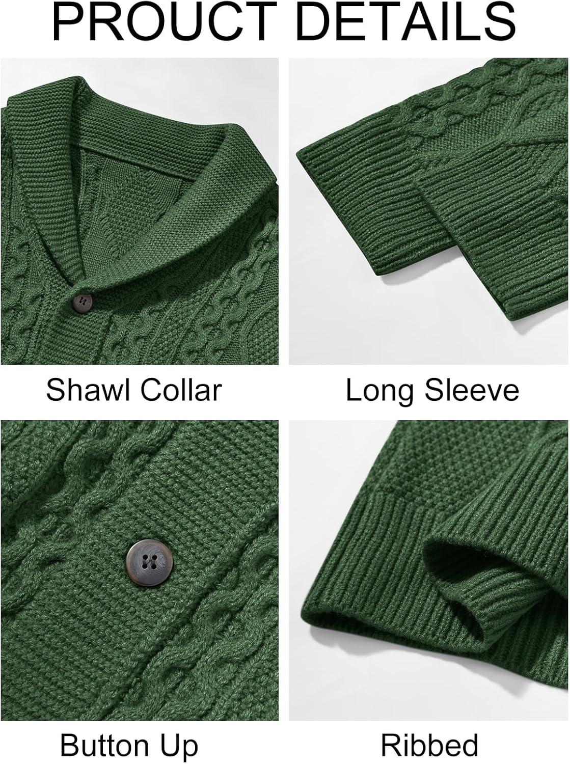 Runcati Mens Cable Knit Cardigan Sweater Shawl Collar Casual Button Down Long Sleeve Sweaters(Army Green)