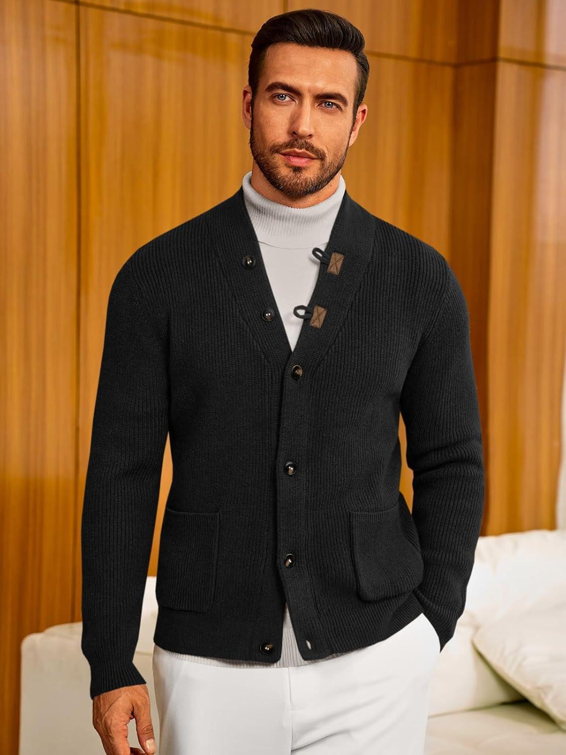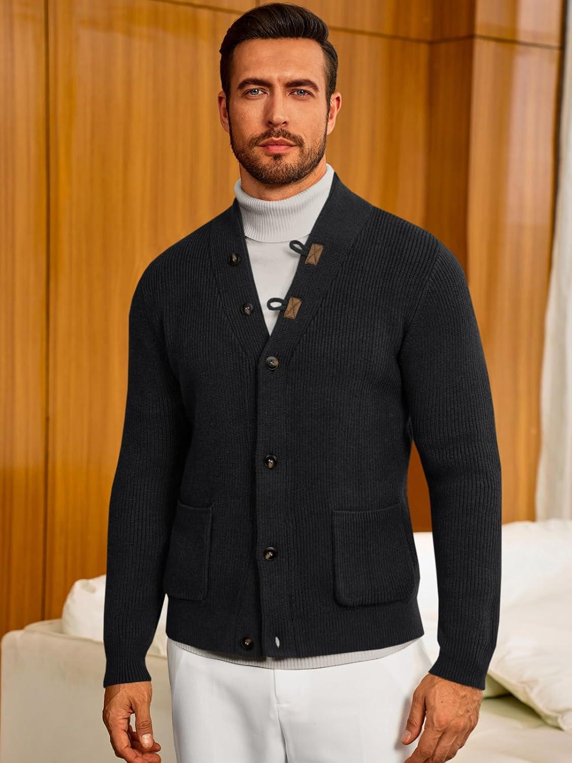 Runcati Mens Cardigan Sweater Casual V Neck Button Down Cardigan Ribbed Knitted Winter Chunky Sweaters with Pockets(Black)