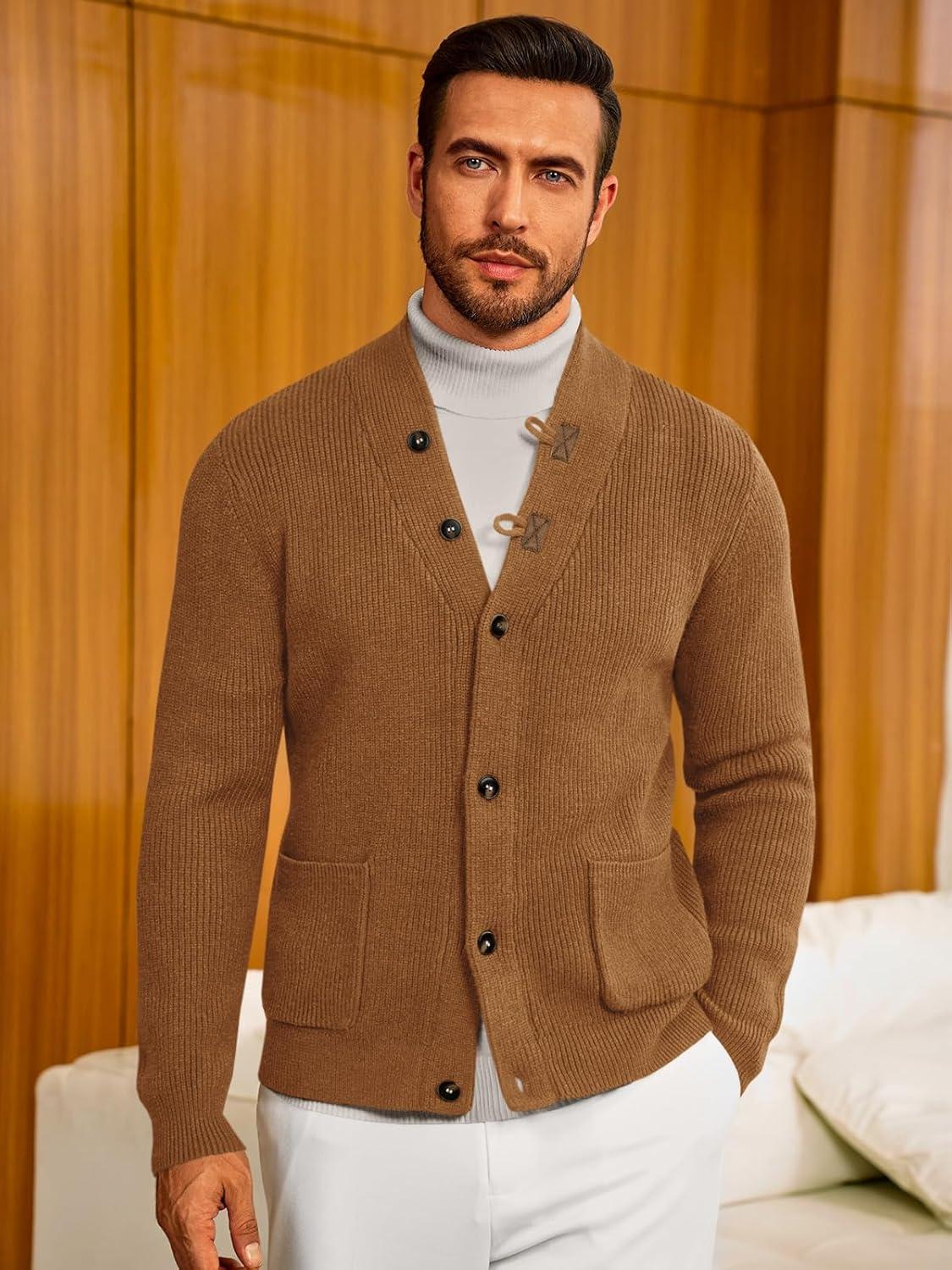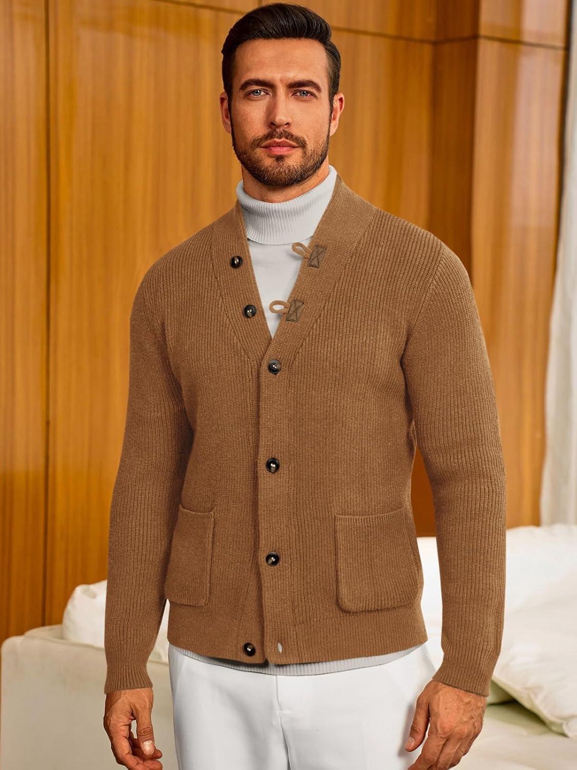 Runcati Mens Cardigan Sweater Casual V Neck Button Down Cardigan Ribbed Knitted Winter Chunky Sweaters with Pockets(Brown)