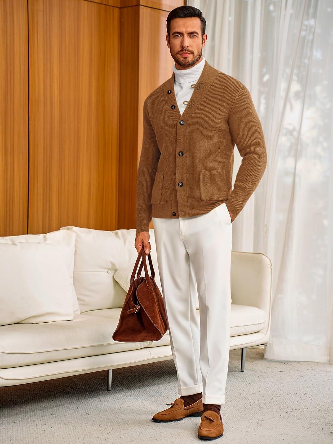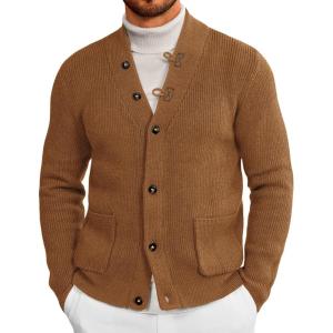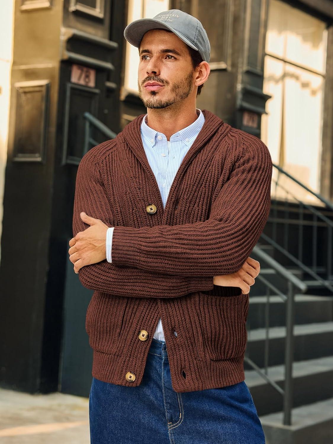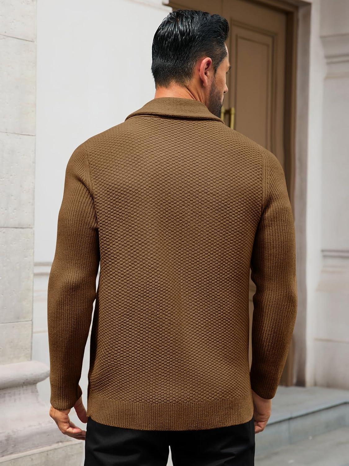 Runcati Mens Shawl Collar Cardigan Sweaters Button Down Open Front Knitwear Cable Knitted Ribbed Jackets Outwear(Brown)