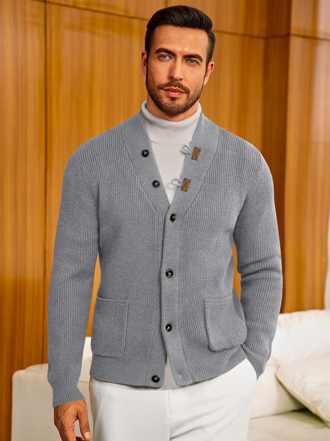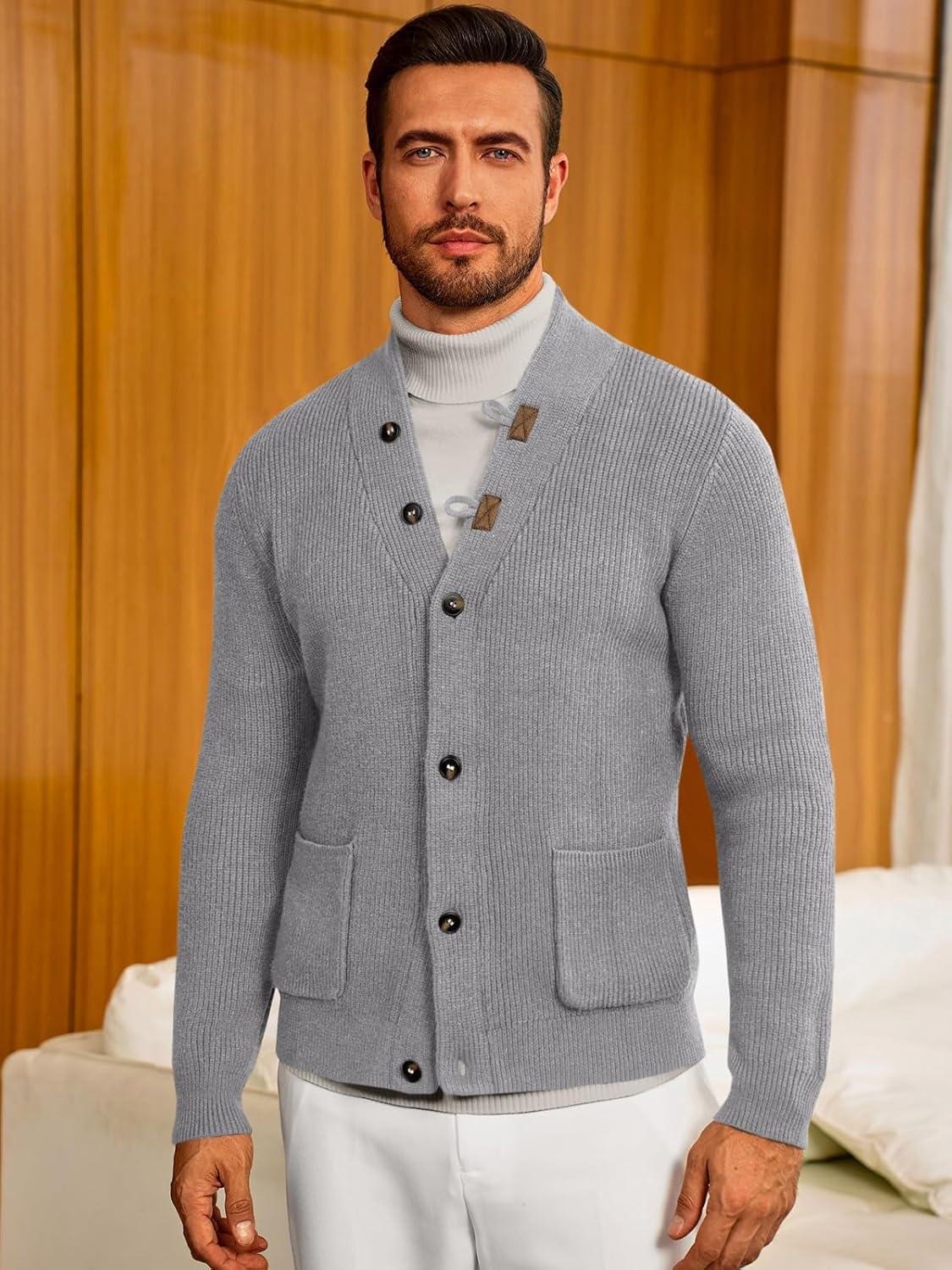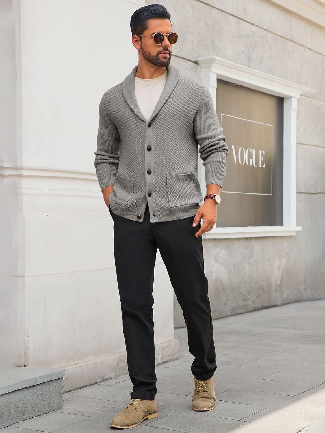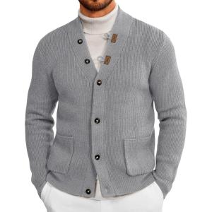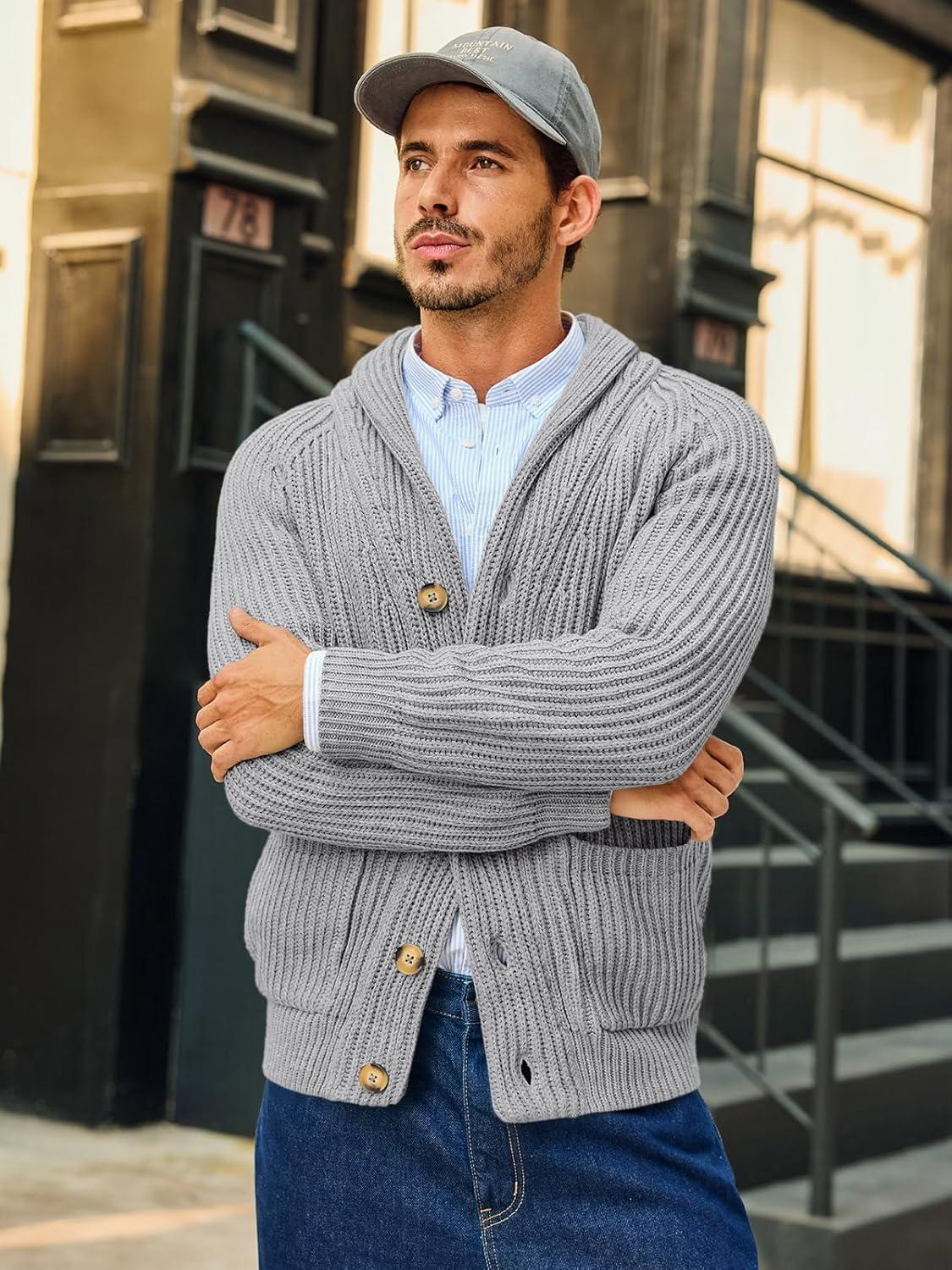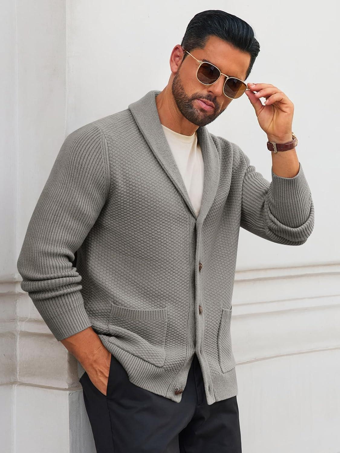 Runcati Mens Shawl Collar Cardigan Sweater Button Down Textured Knit Sweaters Casual Chunky Cardigan with Pockets(Grey)