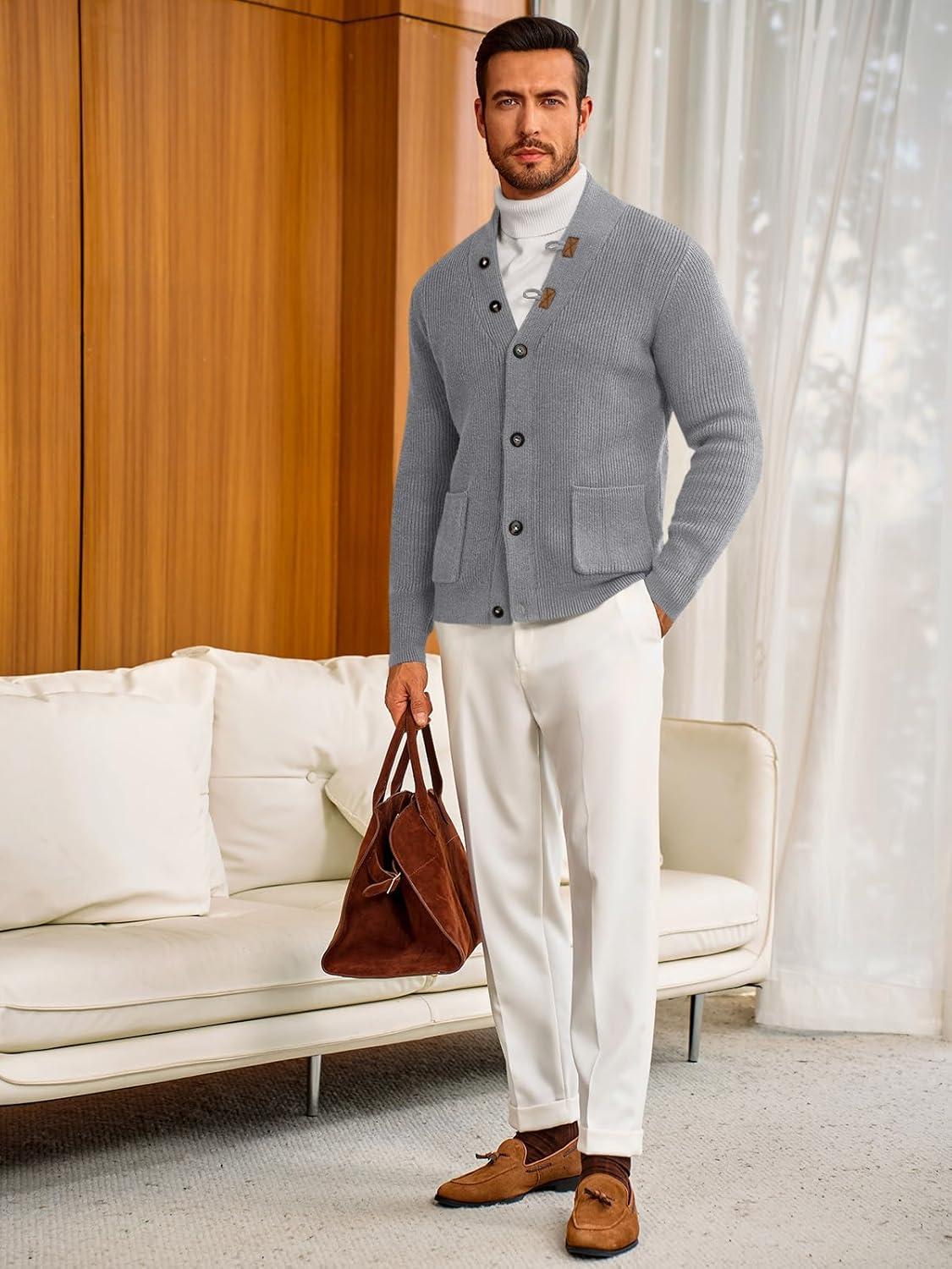 Runcati Mens Shawl Collar Cardigan Sweaters Button Down Open Front Knitwear Cable Knitted Ribbed Jackets Outwear(Gray)