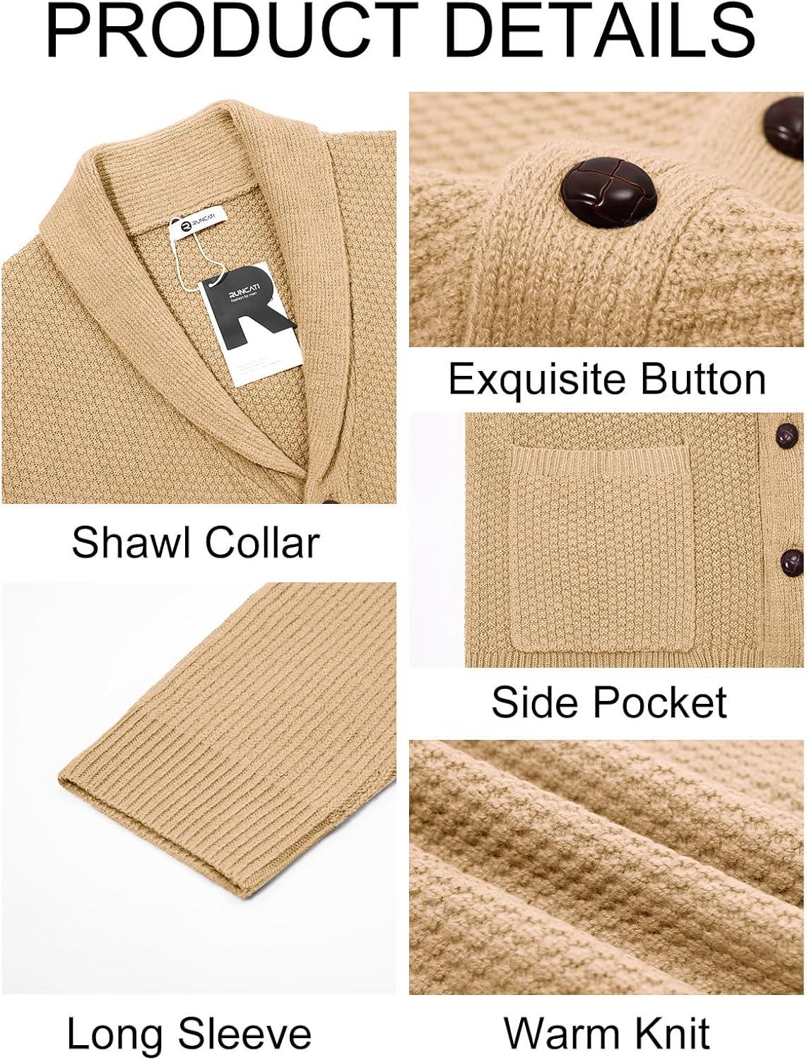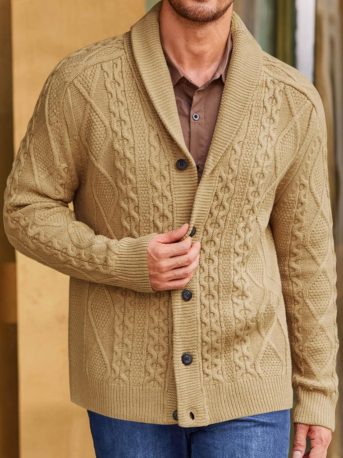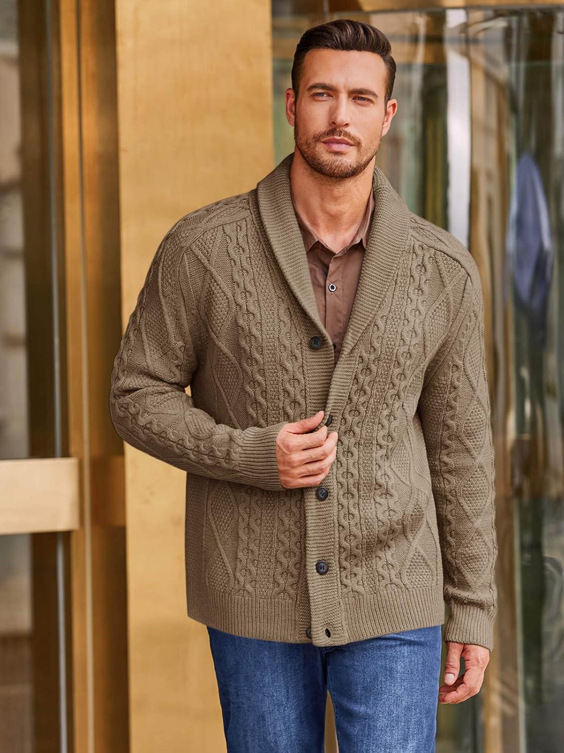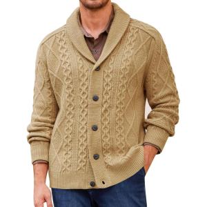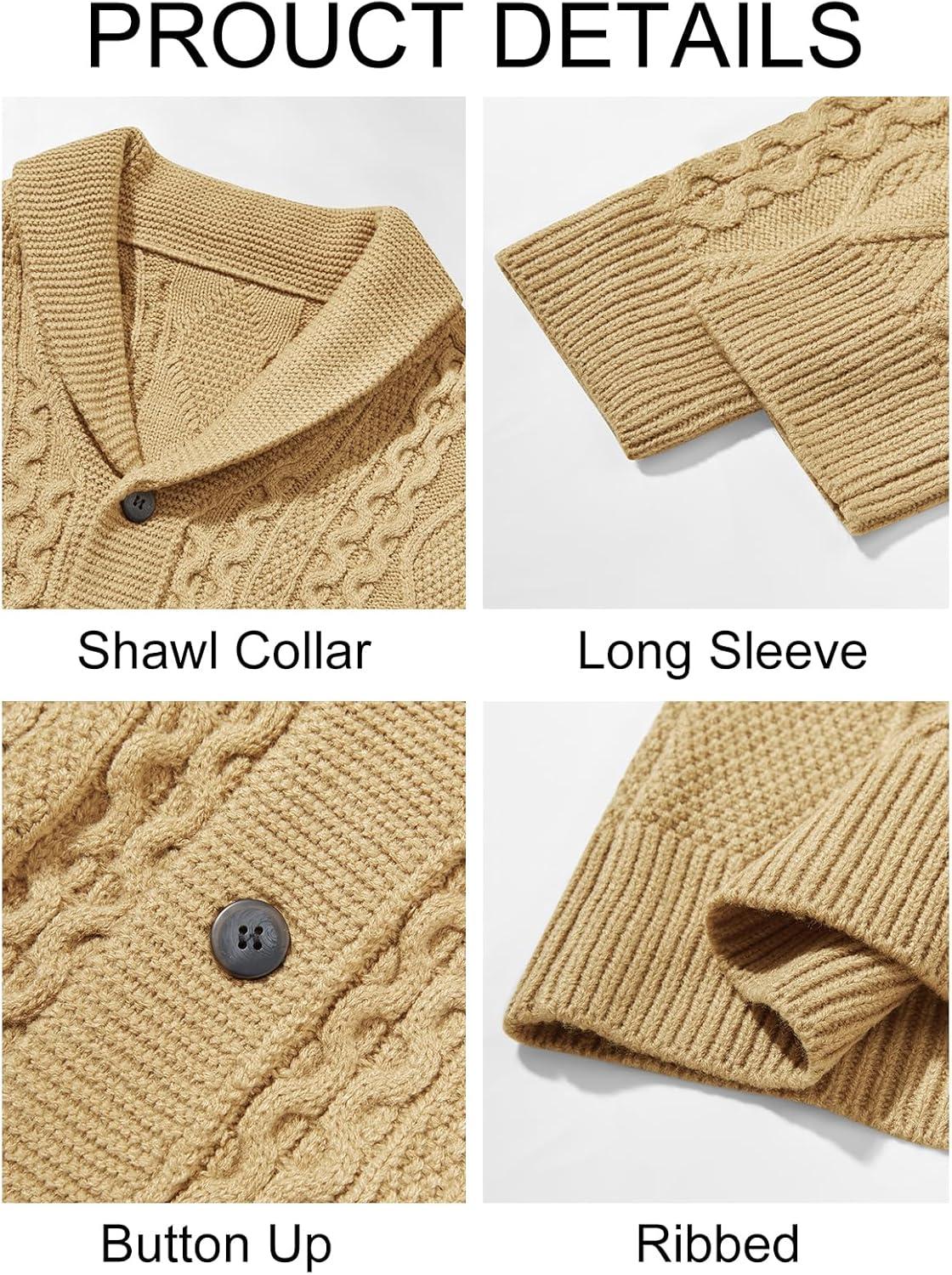 Runcati Mens Cable Knit Cardigan Sweater Shawl Collar Casual Button Down Long Sleeve Sweaters(Khaki)