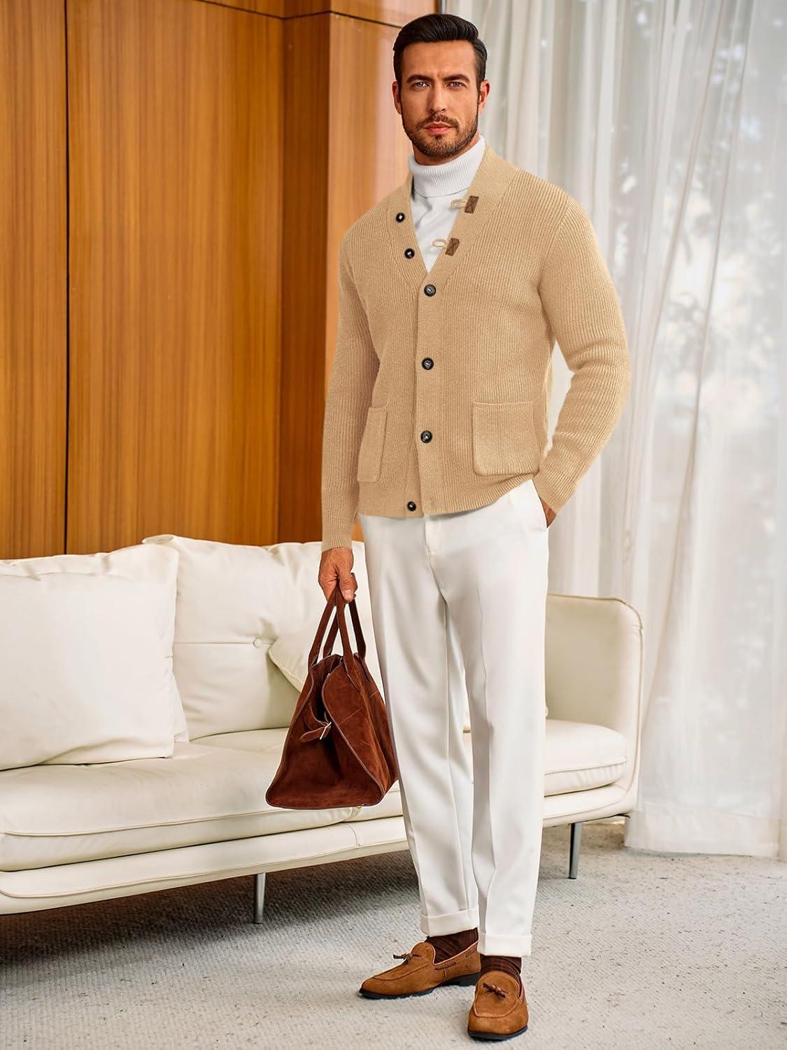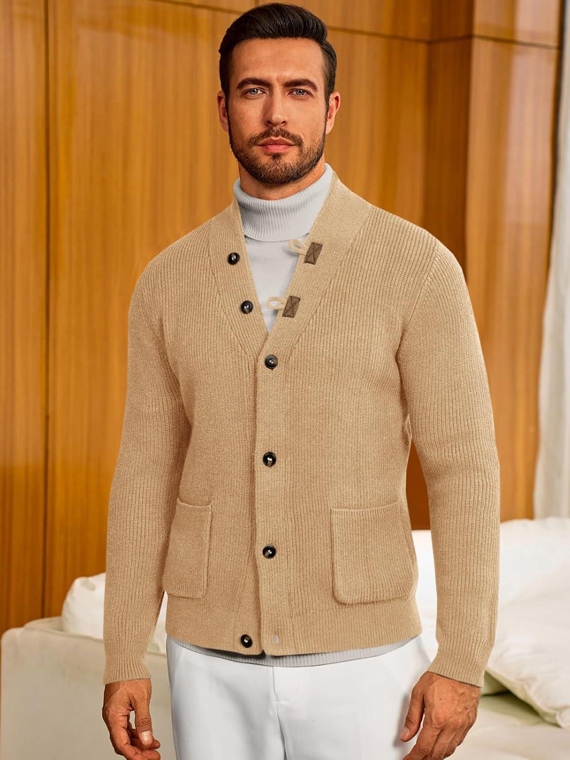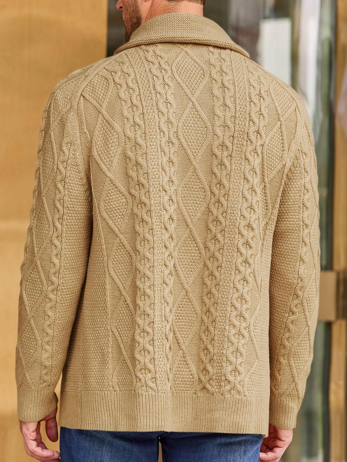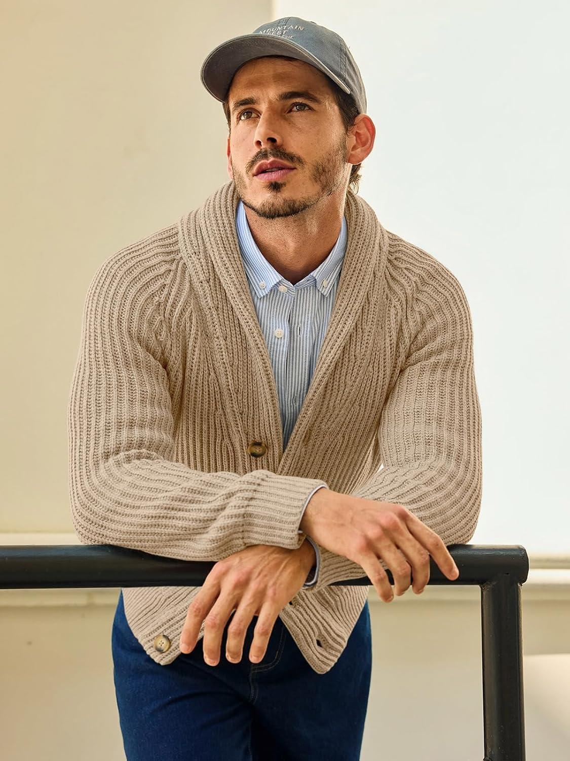 Runcati Mens Cable Knit Cardigan Sweater Shawl Collar Casual Button Down Long Sleeve Sweaters(Khaki)