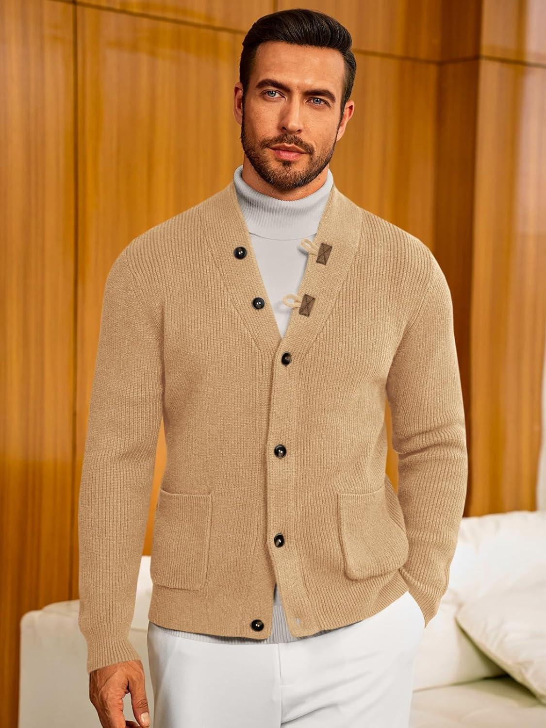 Runcati Mens Cardigan Sweater Casual V Neck Button Down Cardigan Ribbed Knitted Winter Chunky Sweaters with Pockets(Apricot)