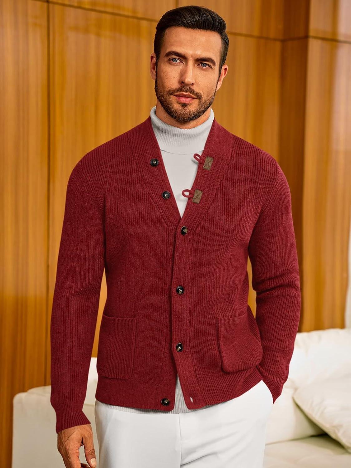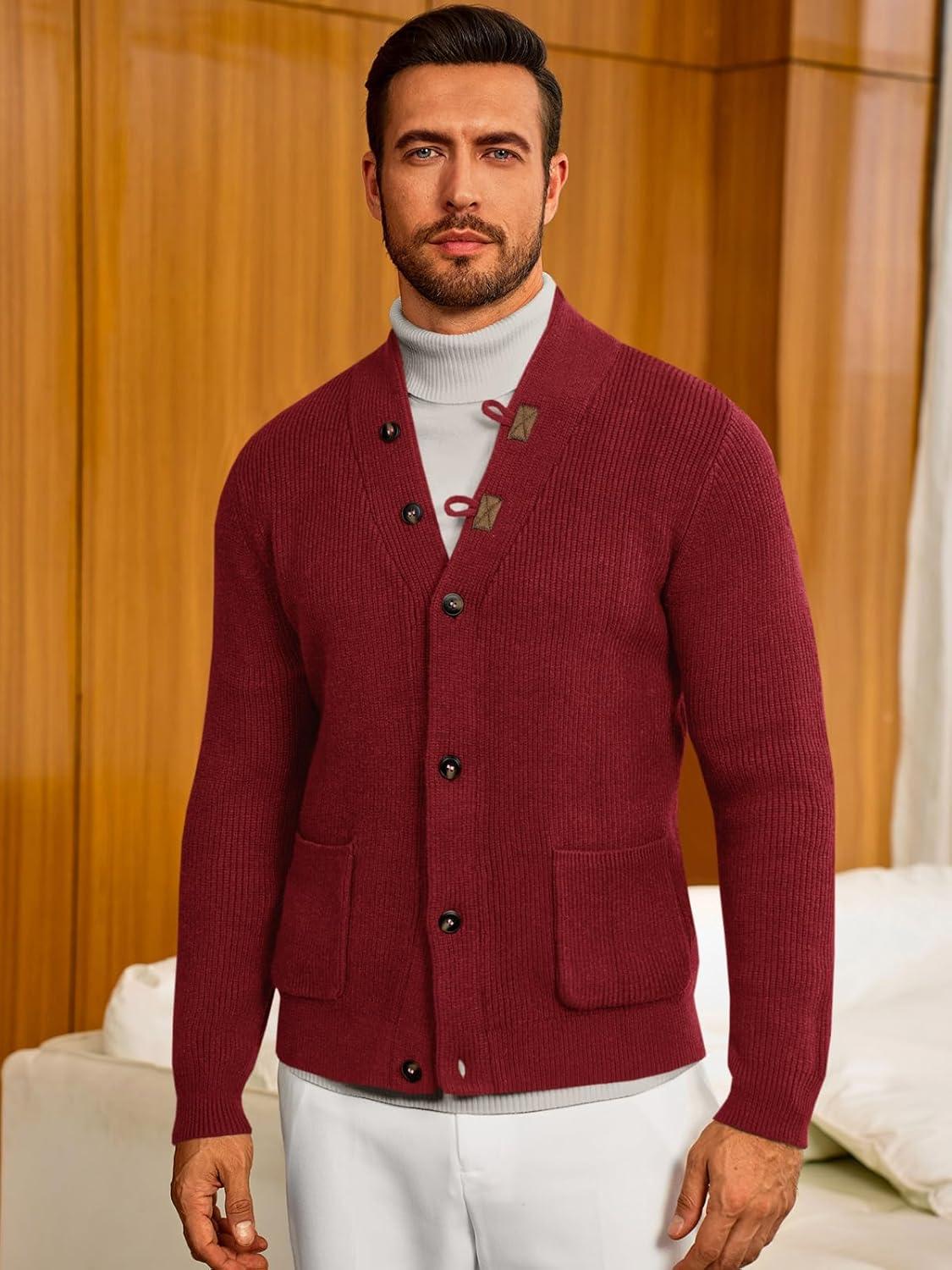 Runcati Mens Cardigan Sweater Casual V Neck Button Down Cardigan Ribbed Knitted Winter Chunky Sweaters with Pockets(Wine Red)