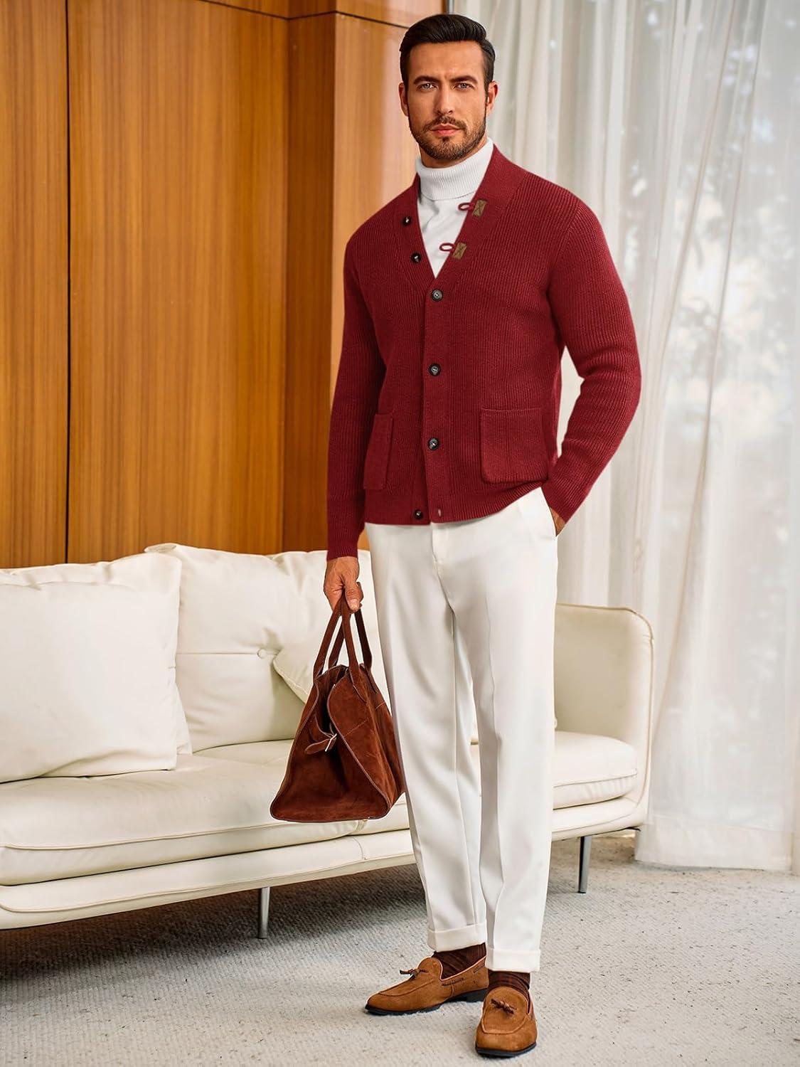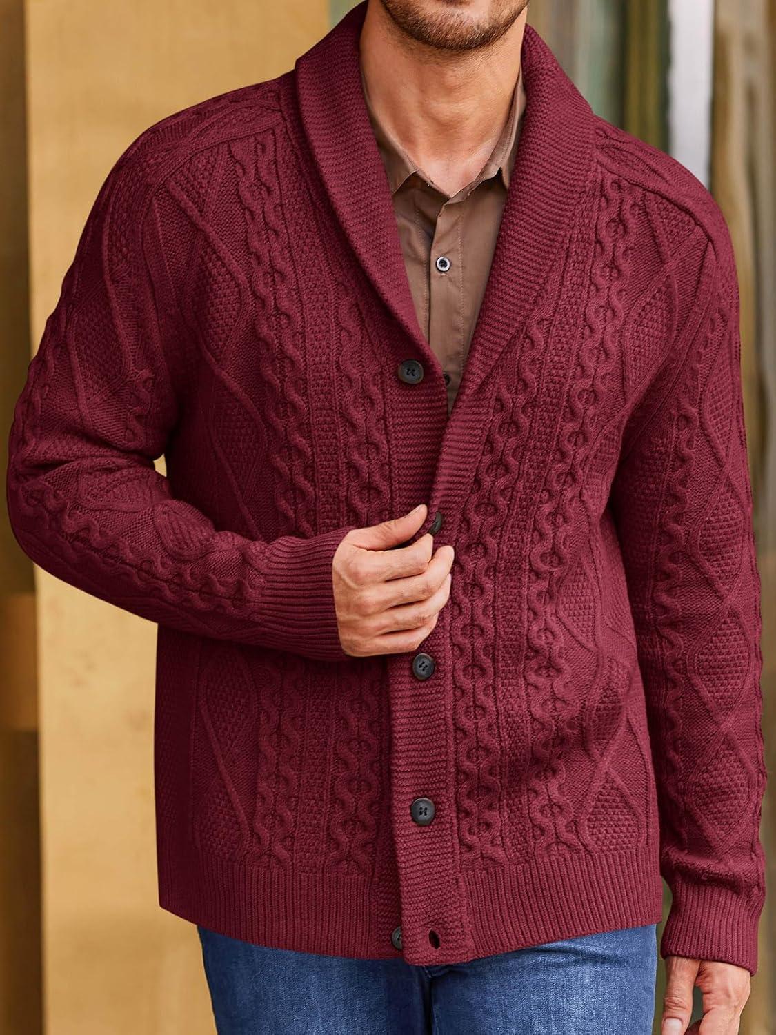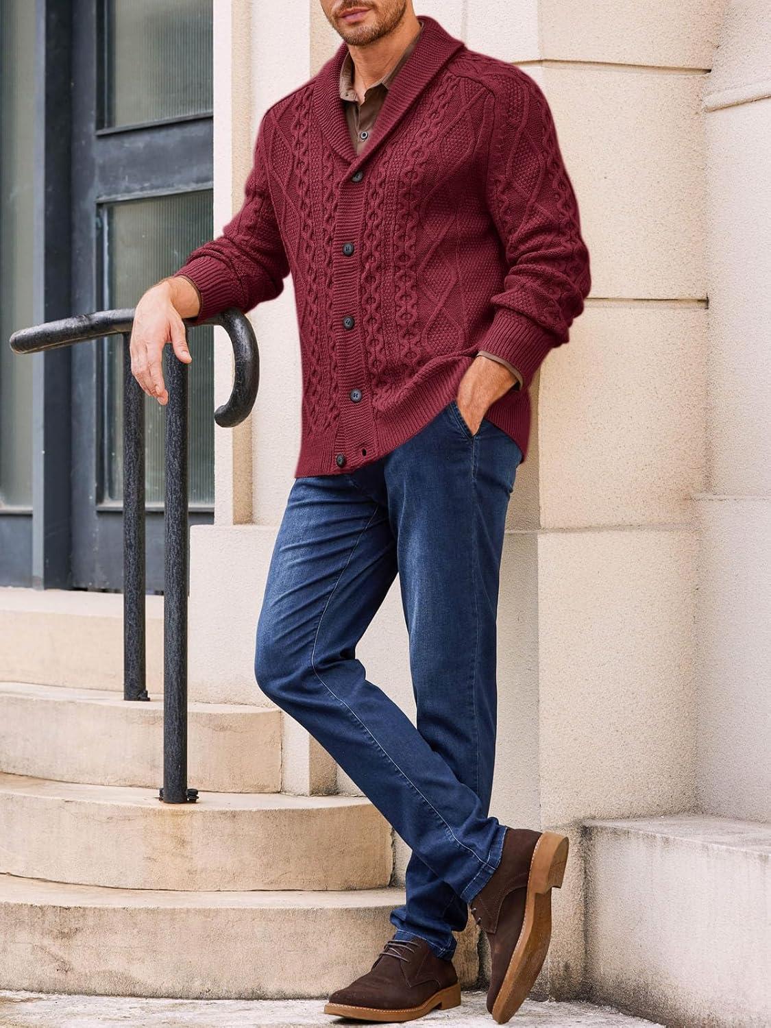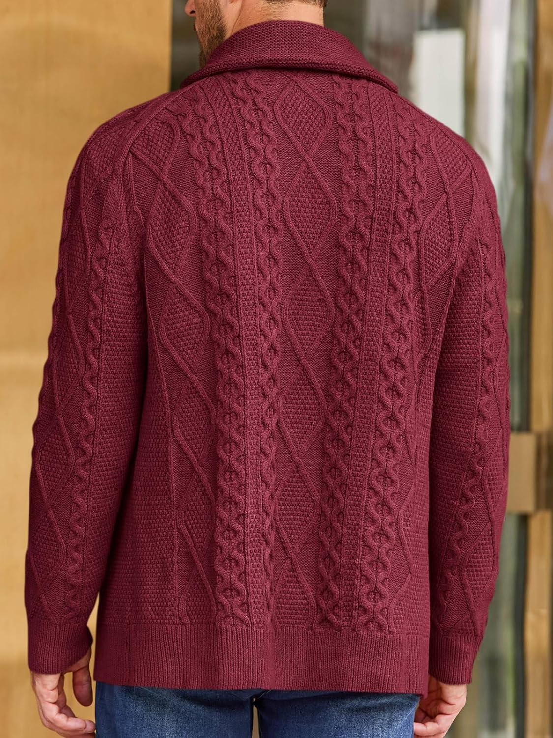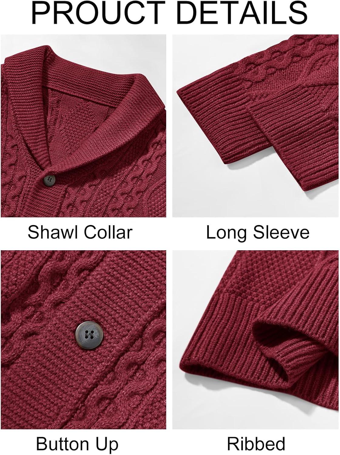 Runcati Mens Shawl Collar Cardigan Sweater Cable Knitted Button Down Sweaters Chunky Fall Winter Outwear(Burgundy)