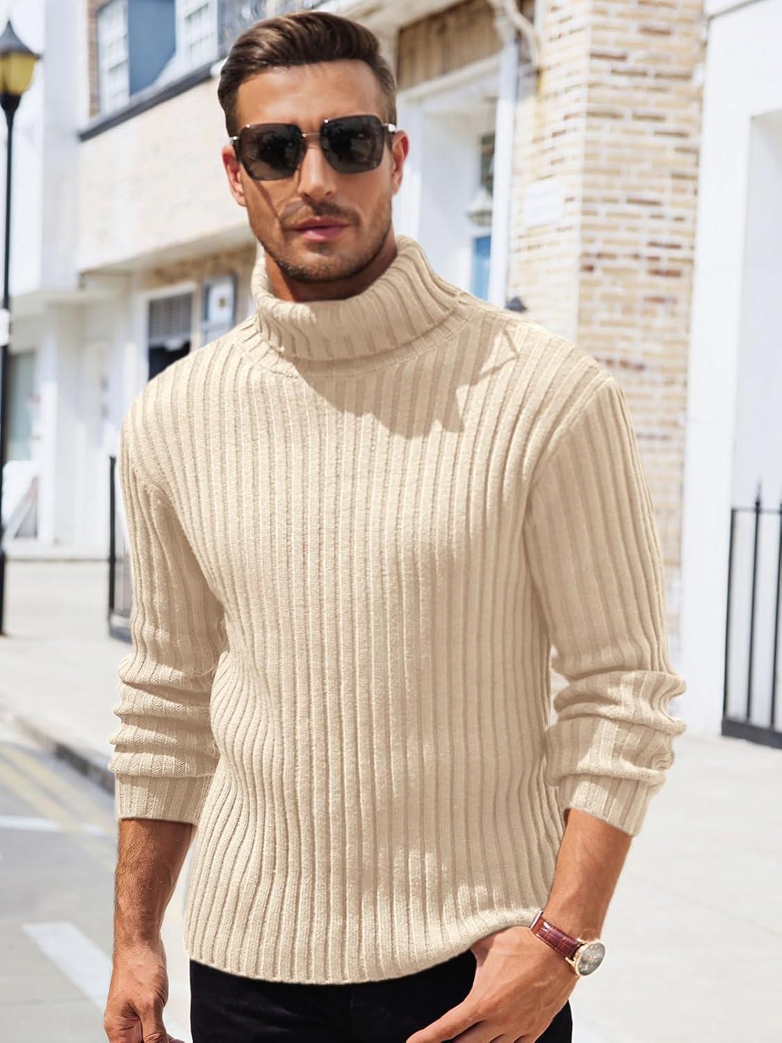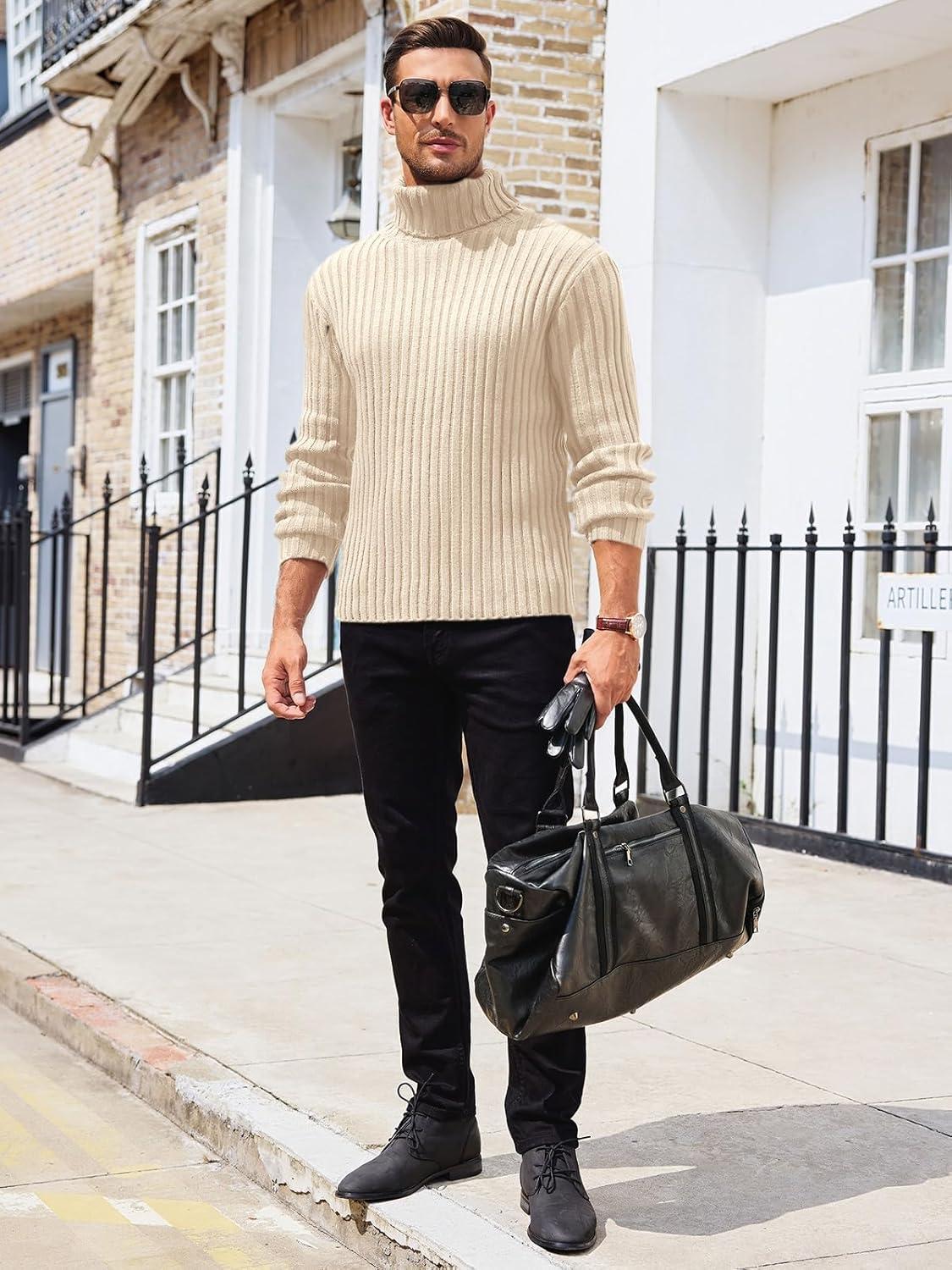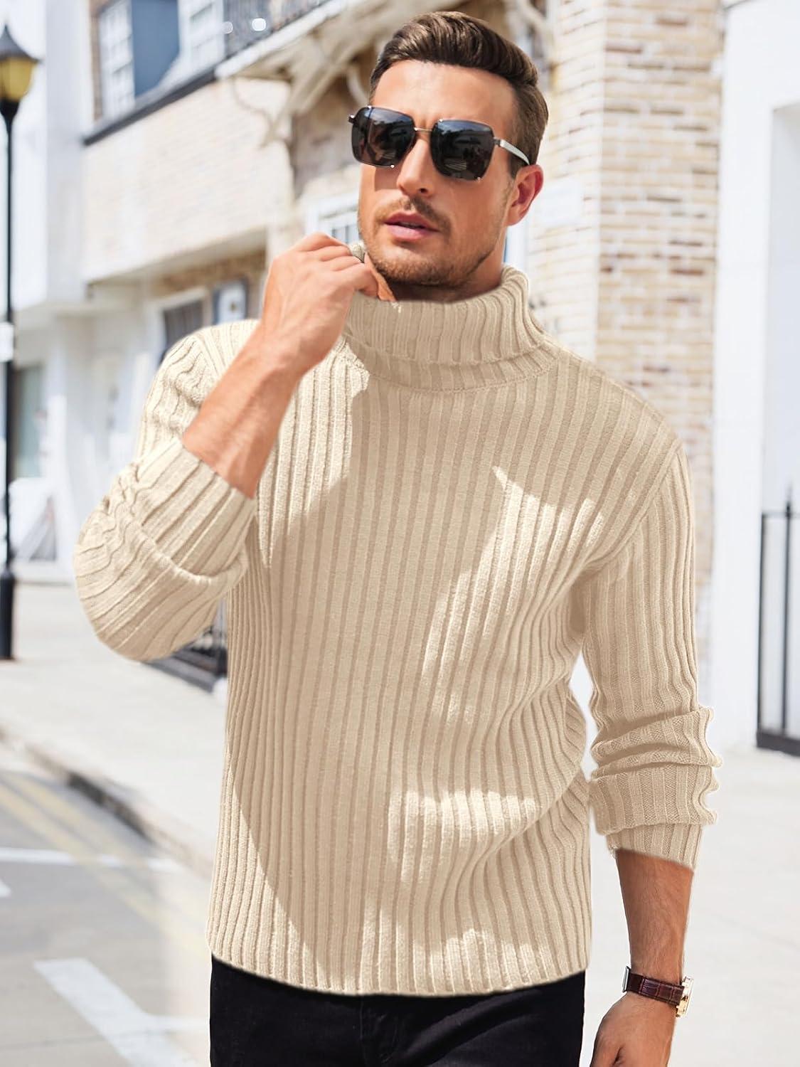 Runcati Mens Chunky Turtleneck Sweaters Cable Knitted Casual Slim Fit Fall Winter Warm Pullover Sweater(Beige)