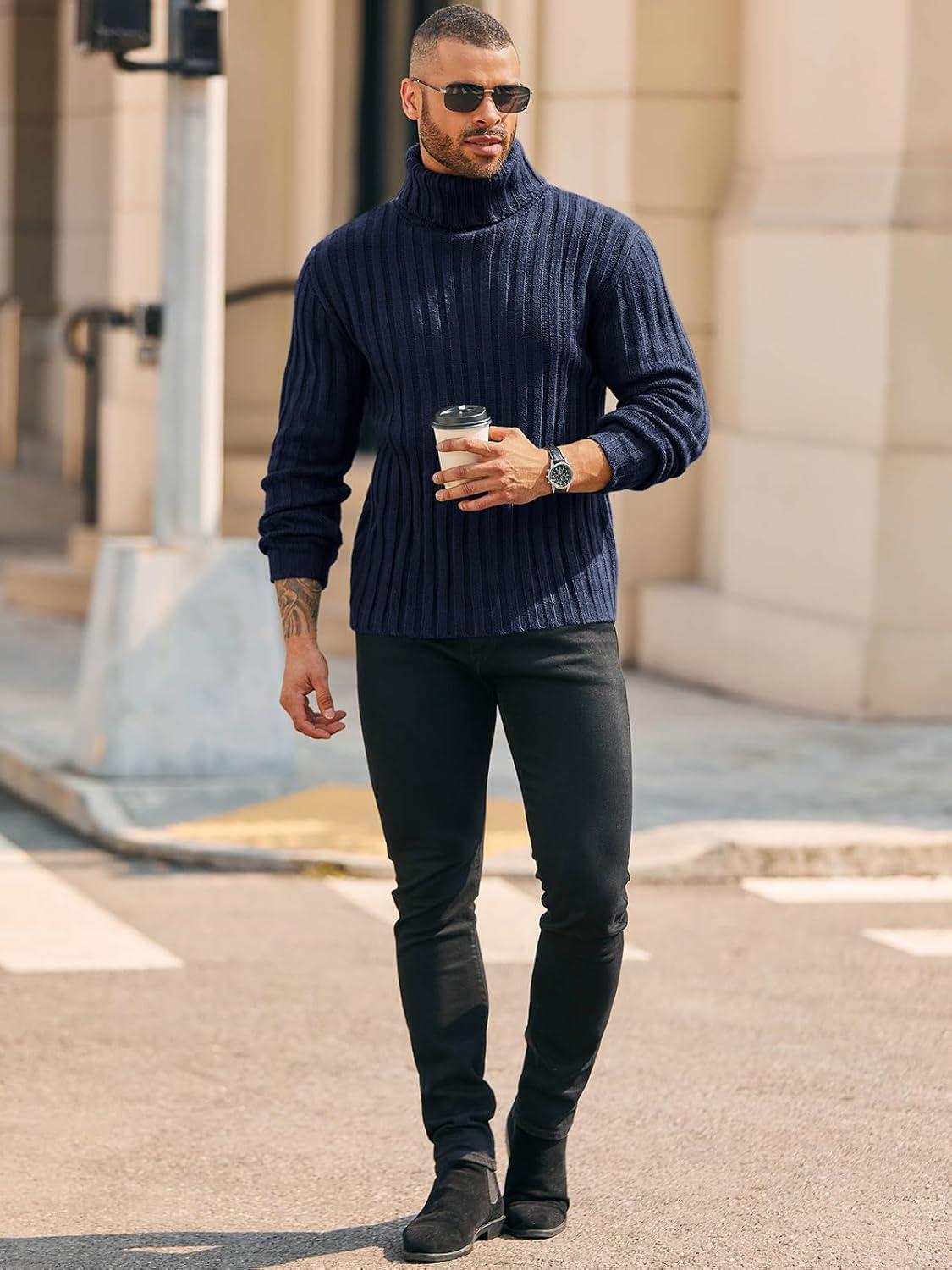Runcati Mens Chunky Turtleneck Sweaters Cable Knitted Casual Slim Fit Fall Winter Warm Pullover Sweater(Black)