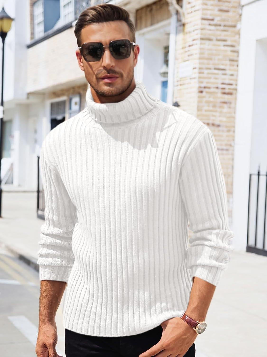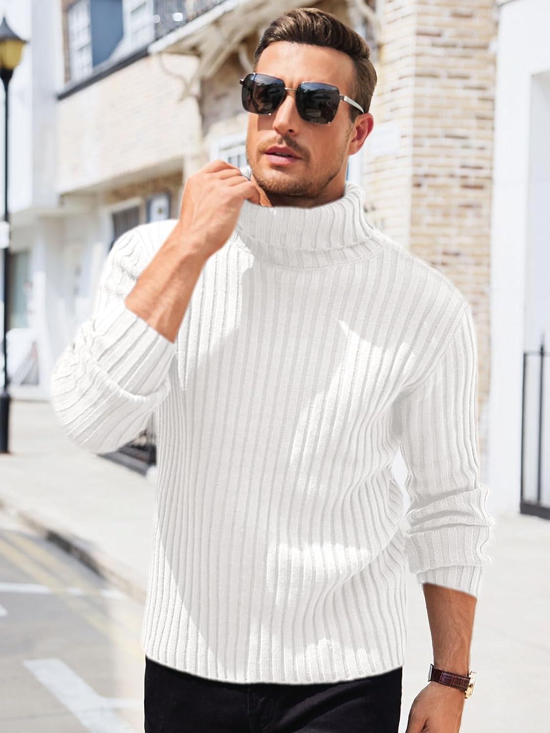 Runcati Mens Chunky Turtleneck Sweaters Cable Knitted Casual Slim Fit Fall Winter Warm Pullover Sweater(White)