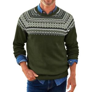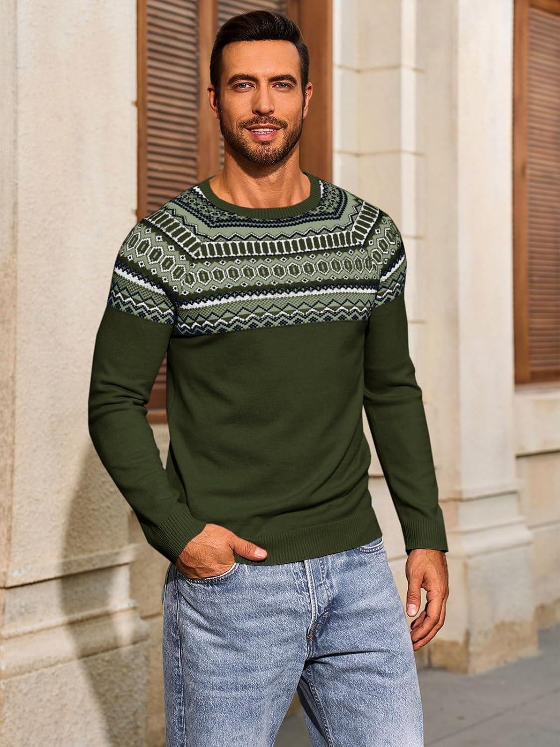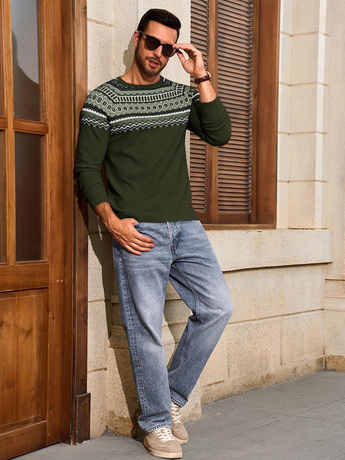 Runcati Mens Crew Neck Sweater Casual Fair Isle Knit Pullover Long Sleeve Fall Winter Chunky Sweaters(Army Green)