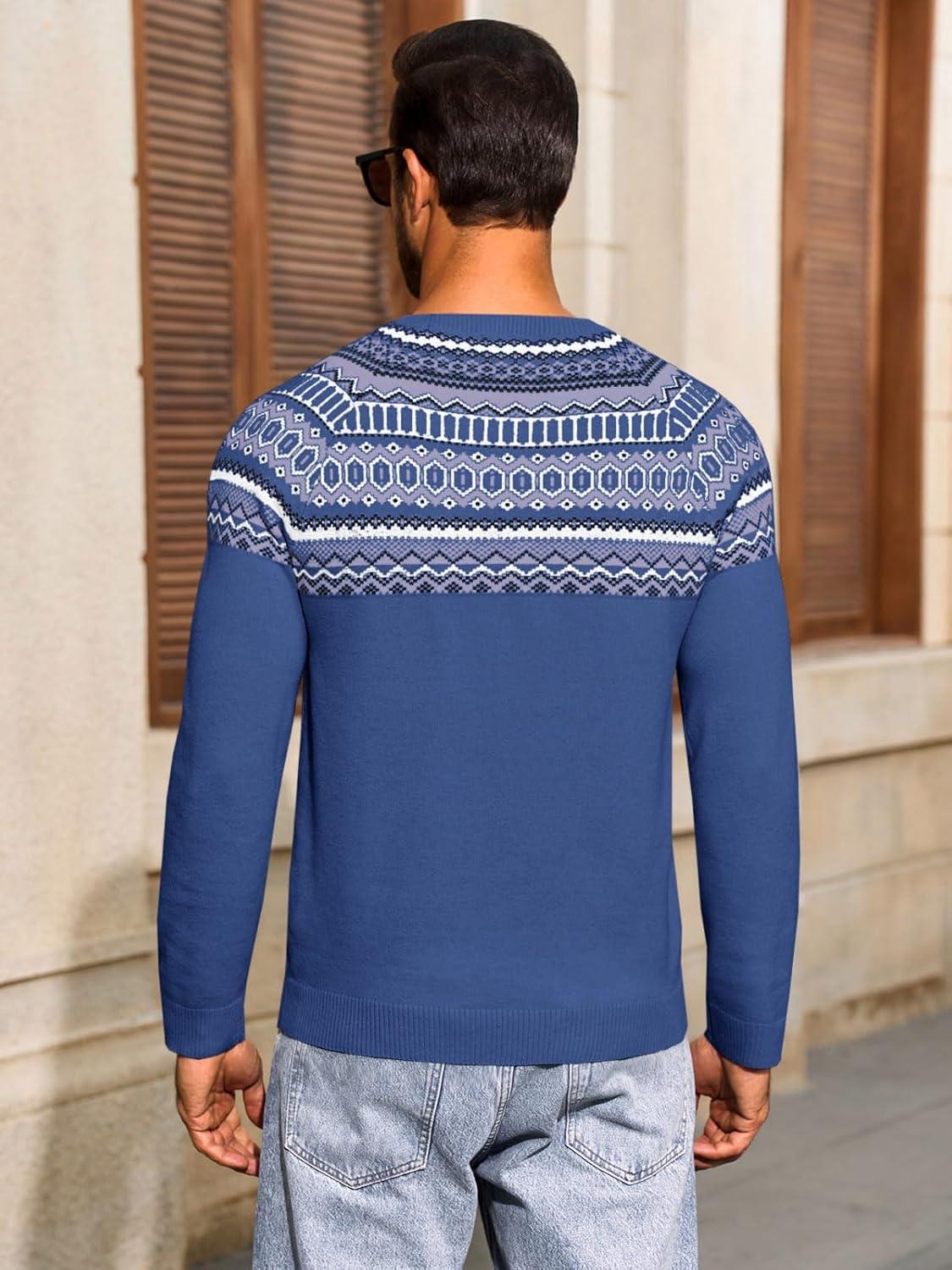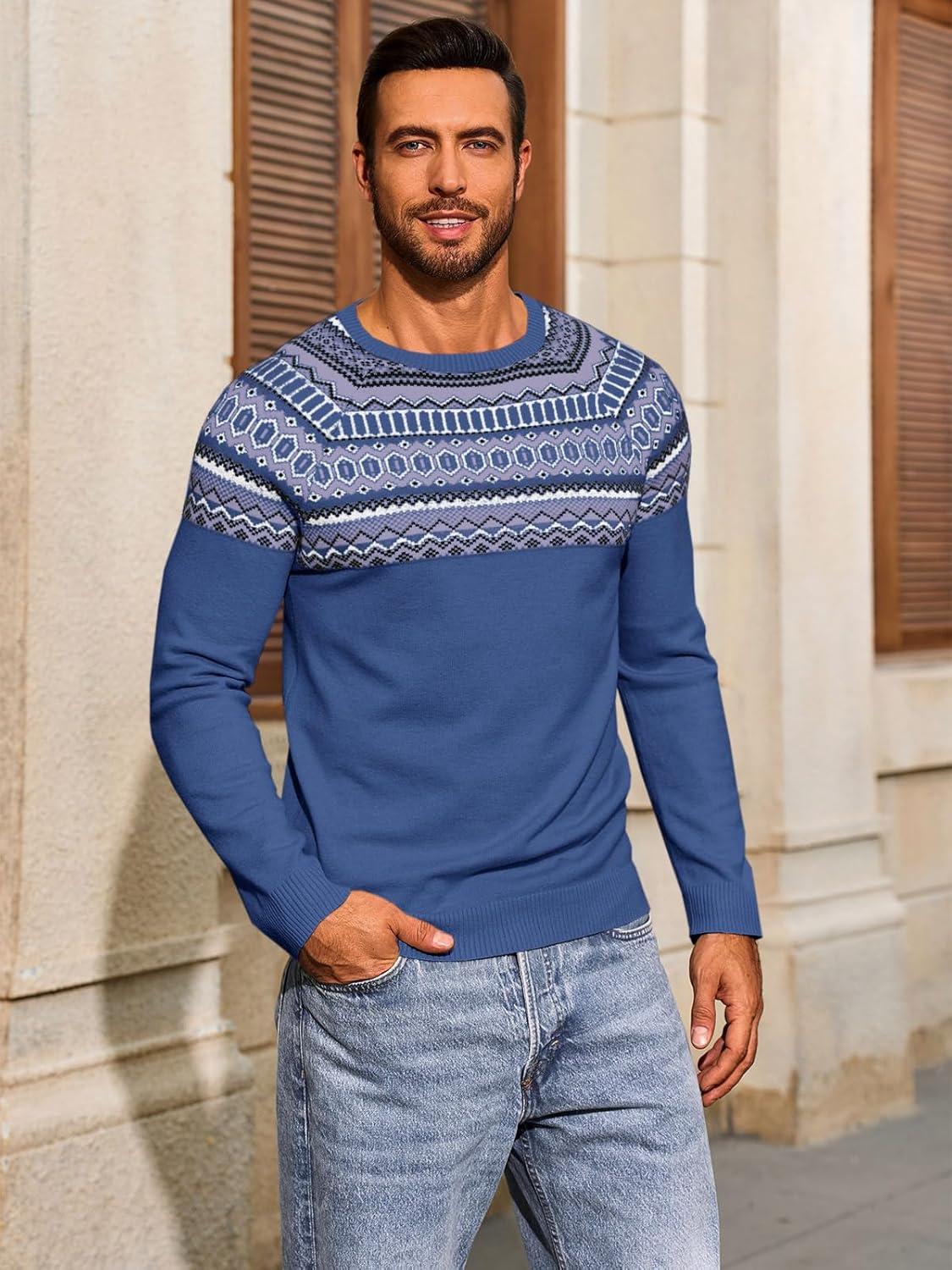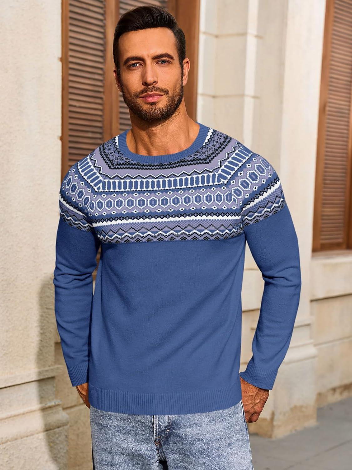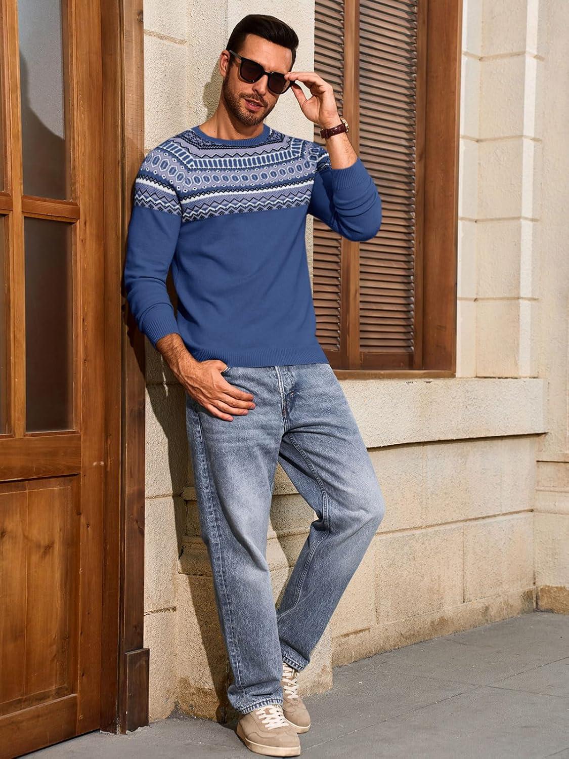 Runcati Mens Crew Neck Sweater Casual Fair Isle Knit Pullover Long Sleeve Fall Winter Chunky Sweaters(Blue)