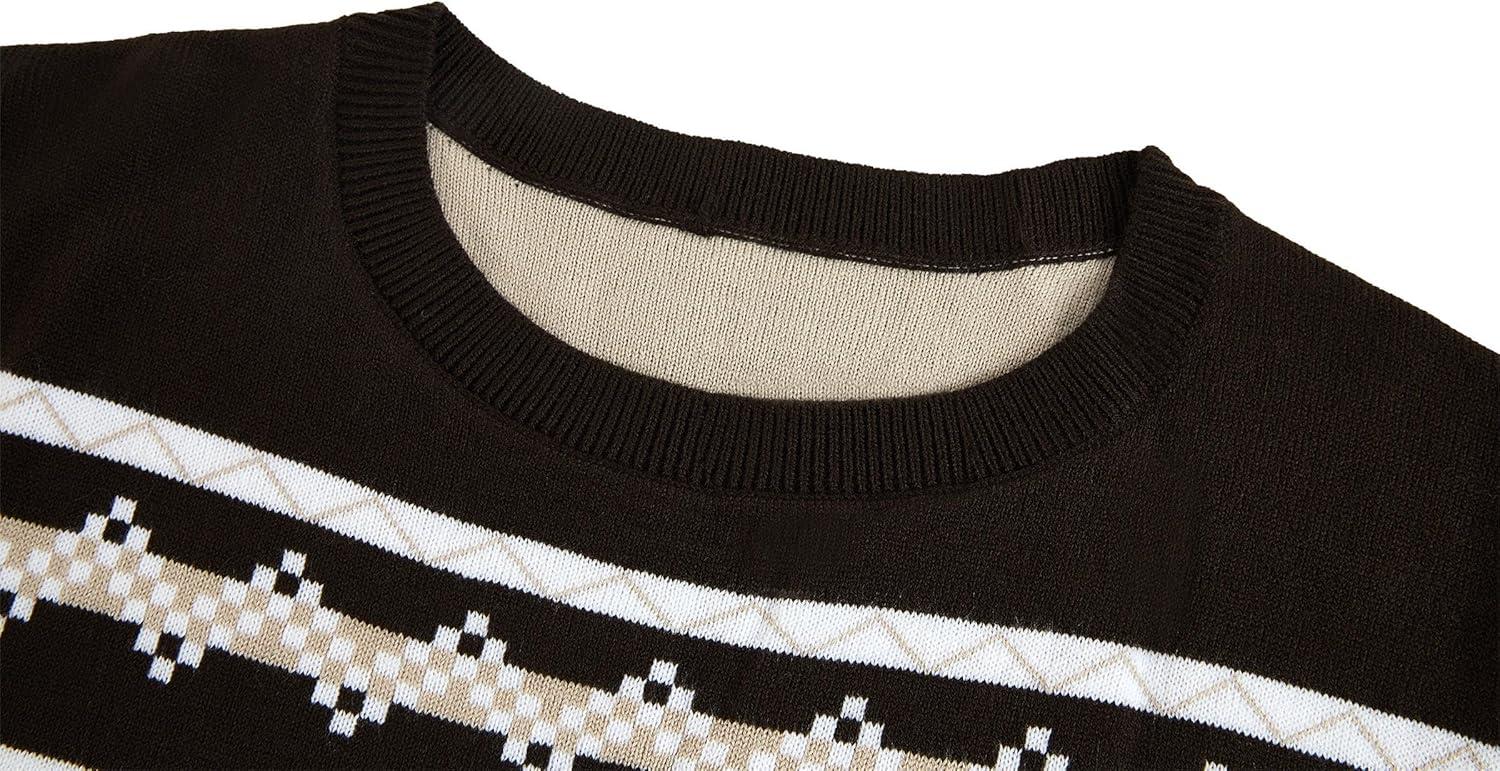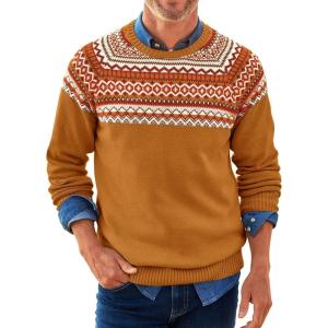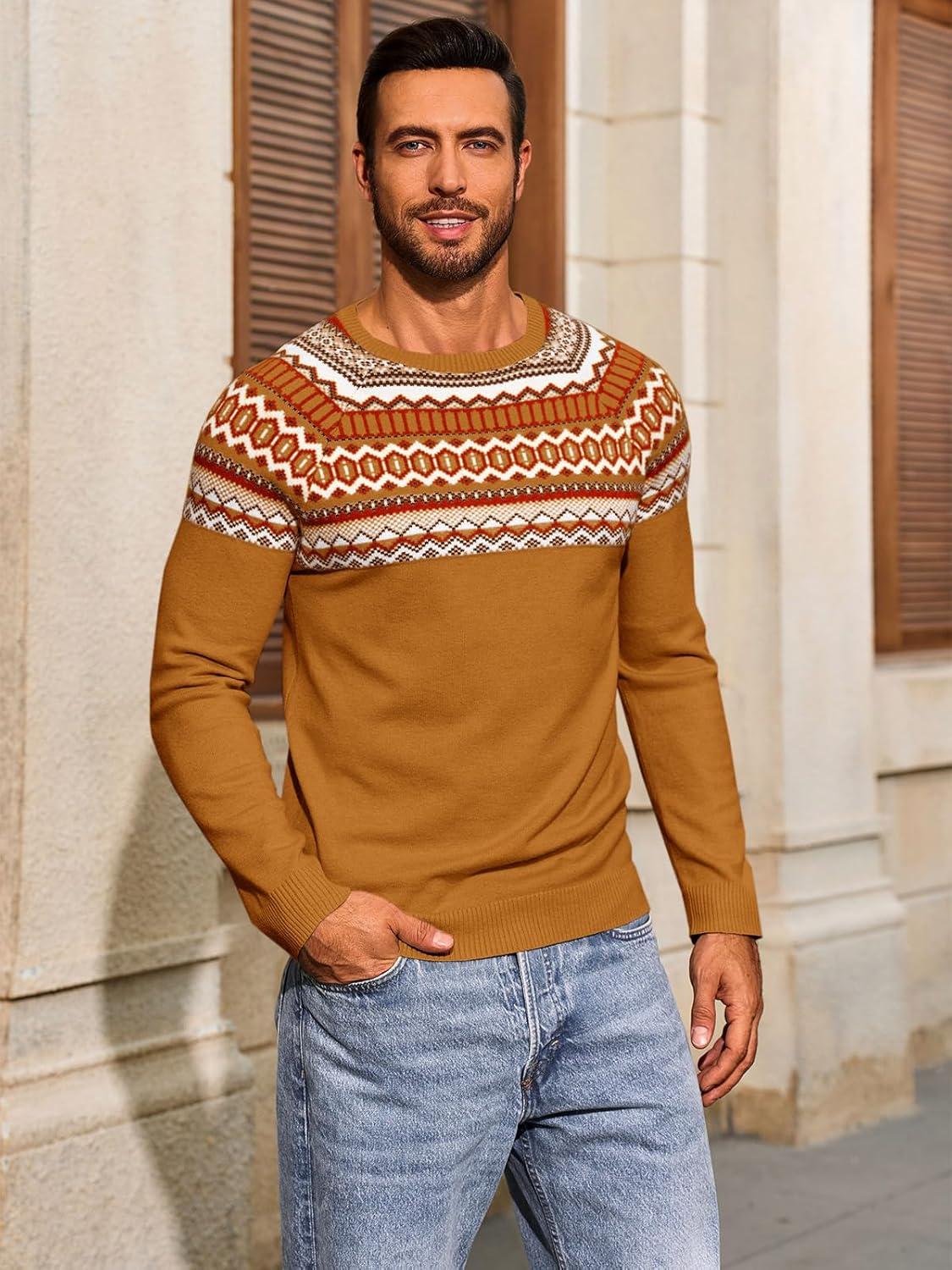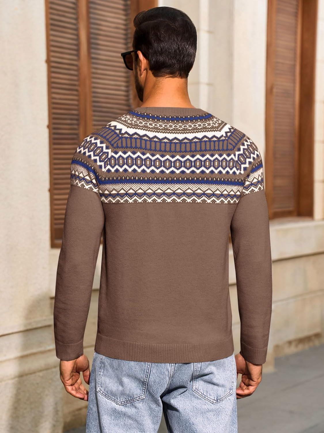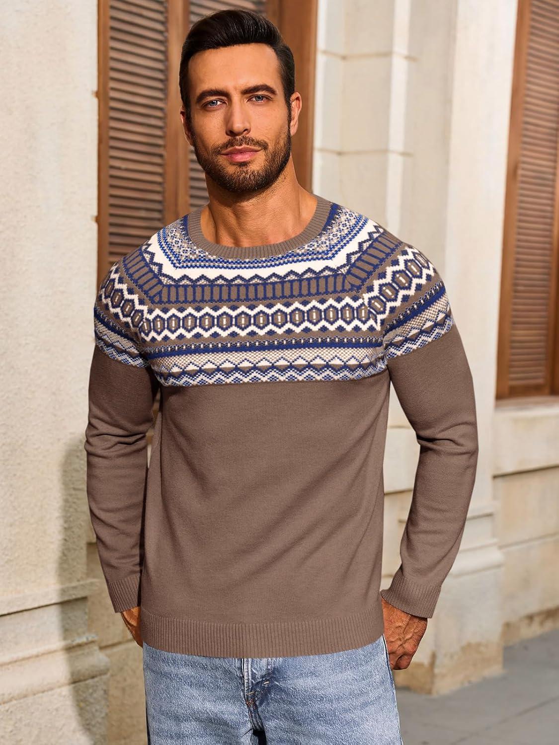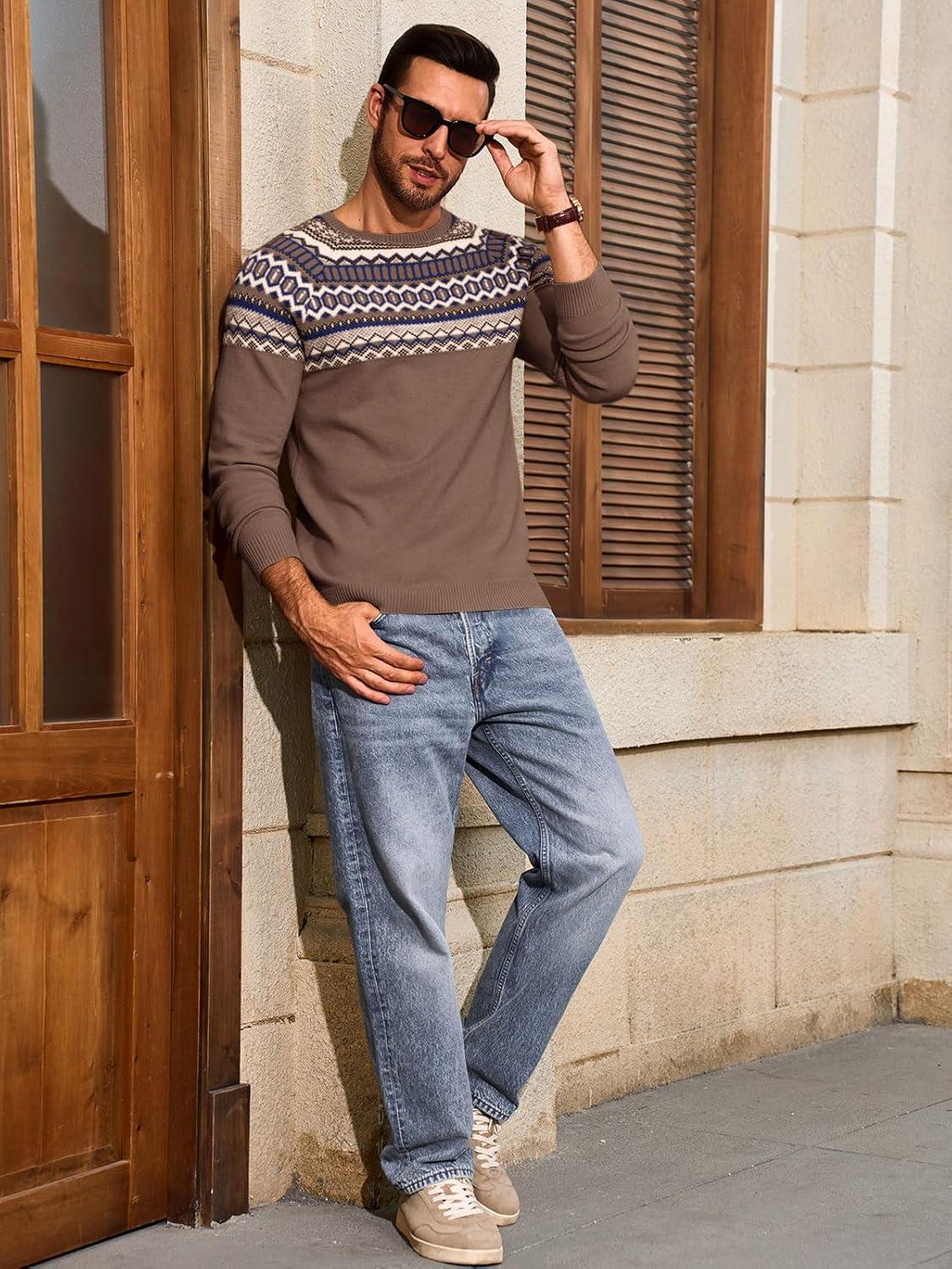Runcati Mens Crew Neck Sweater Casual Fair Isle Knit Pullover Long Sleeve Fall Winter Chunky Sweaters(Brown)