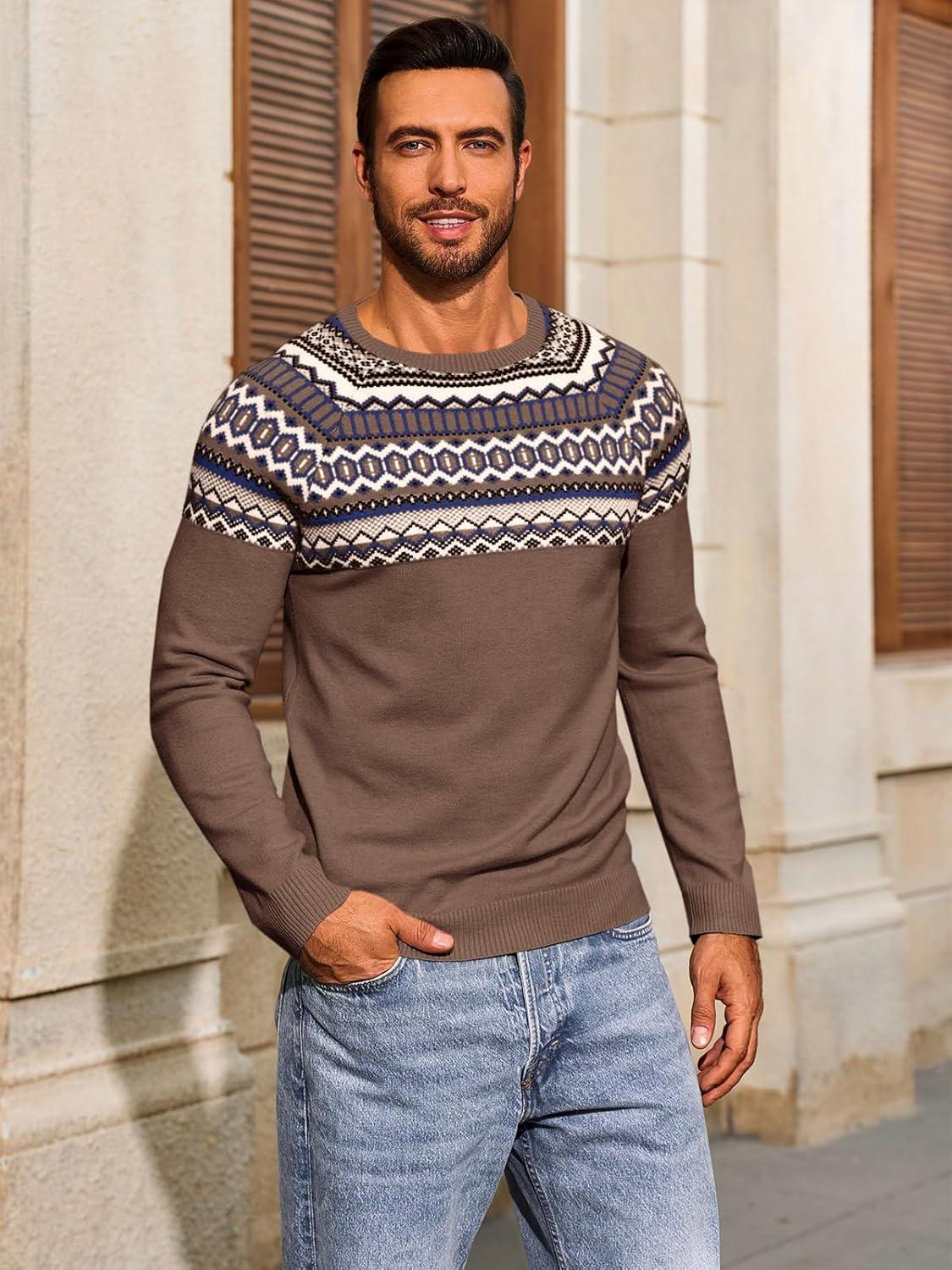 Runcati Mens Crew Neck Sweater Casual Fair Isle Knit Pullover Long Sleeve Fall Winter Chunky Sweaters(Coffee)