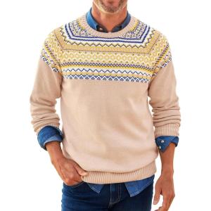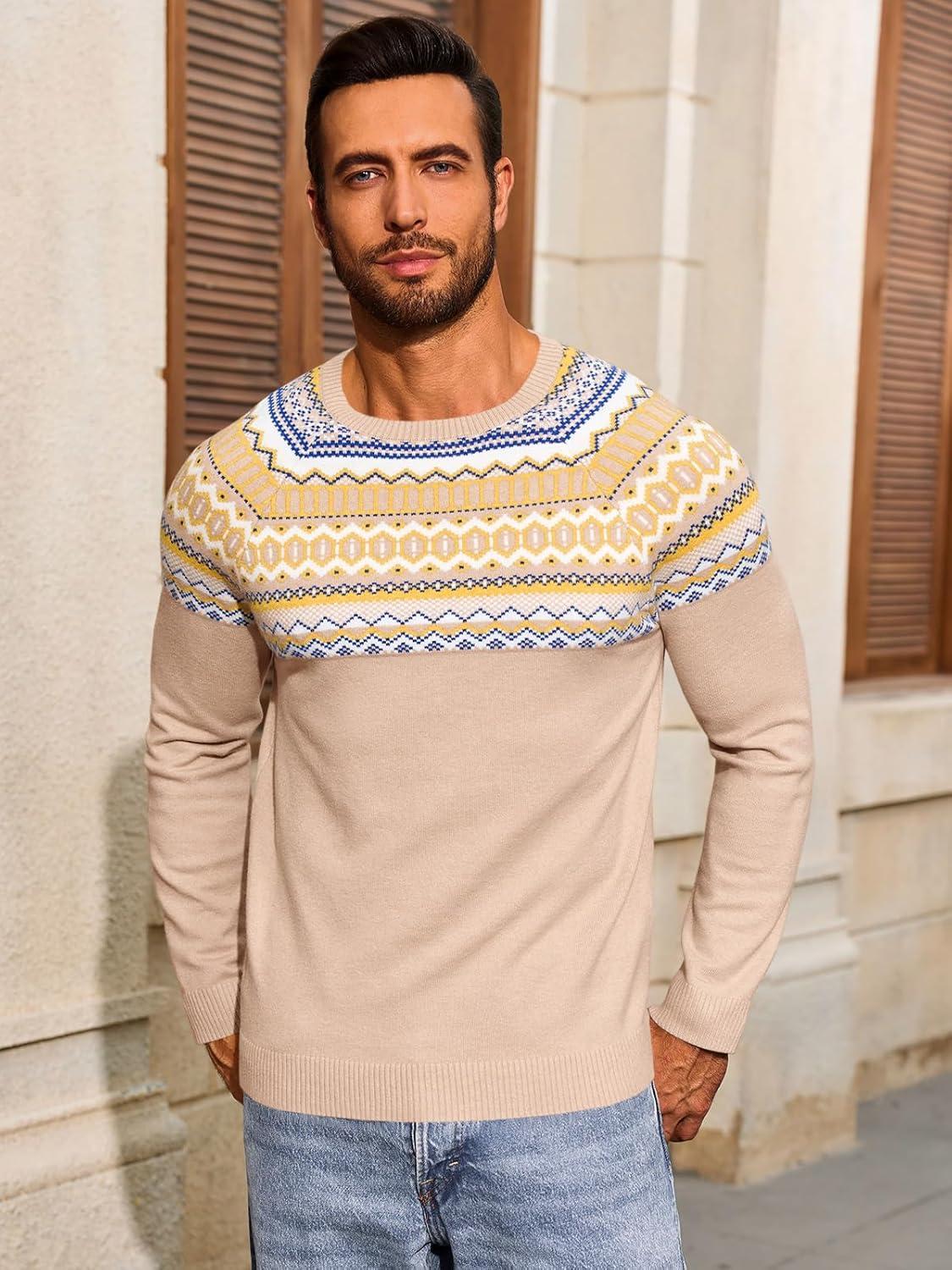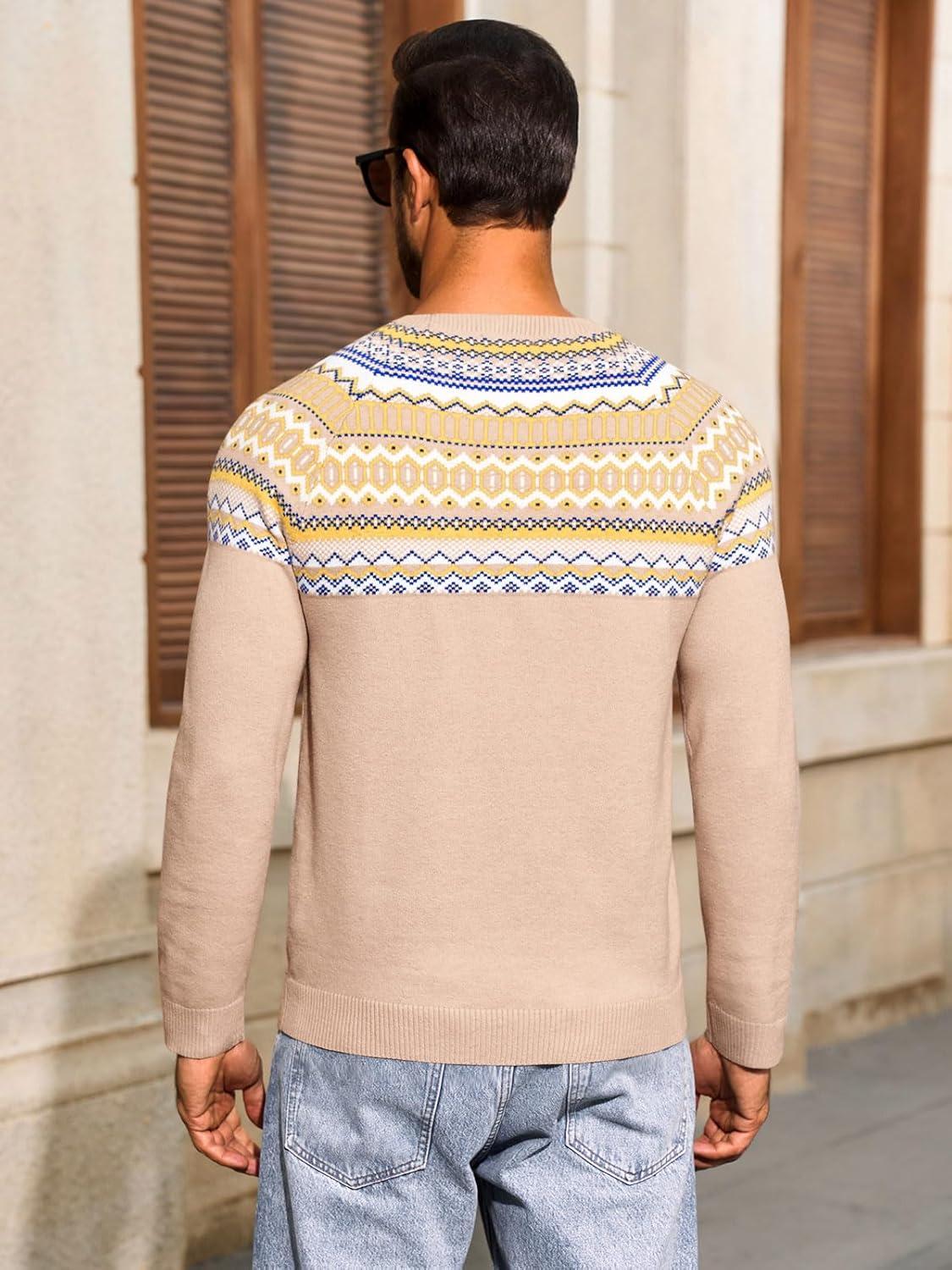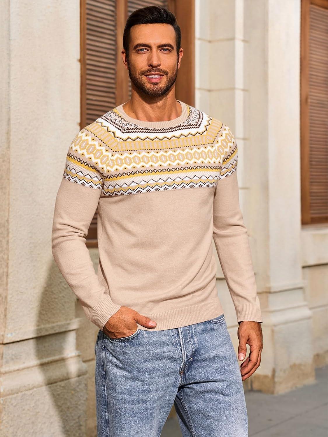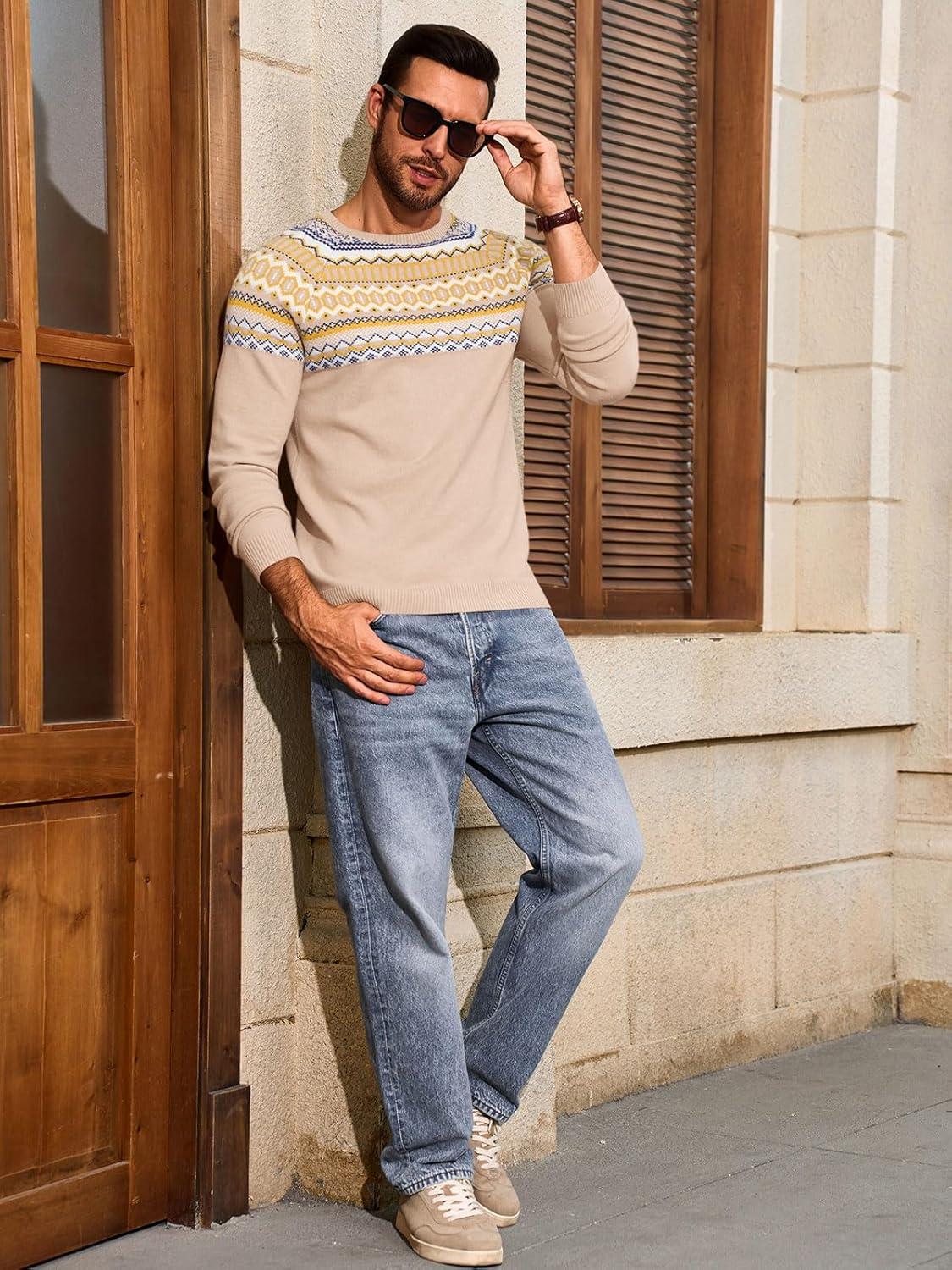 Runcati Mens Crew Neck Sweater Casual Fair Isle Knit Pullover Long Sleeve Fall Winter Chunky Sweaters(Khaki)