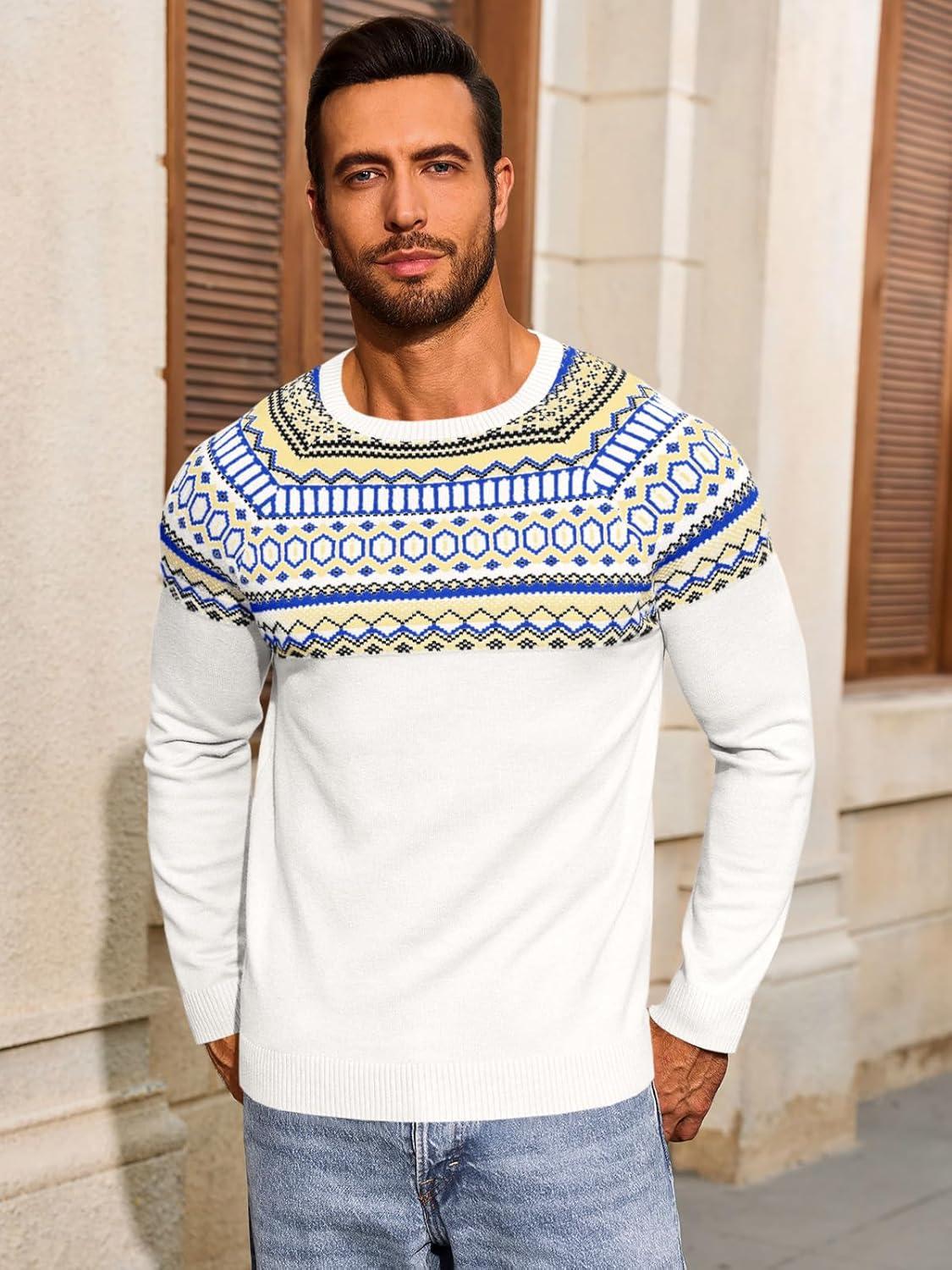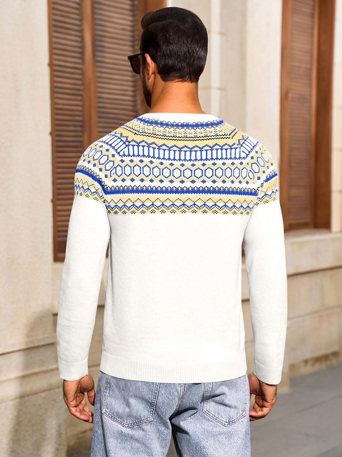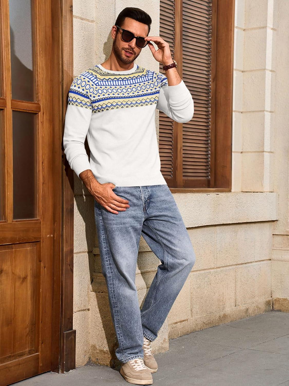 Runcati Mens Crew Neck Sweater Casual Fair Isle Knit Pullover Long Sleeve Fall Winter Chunky Sweaters(White)