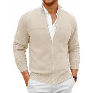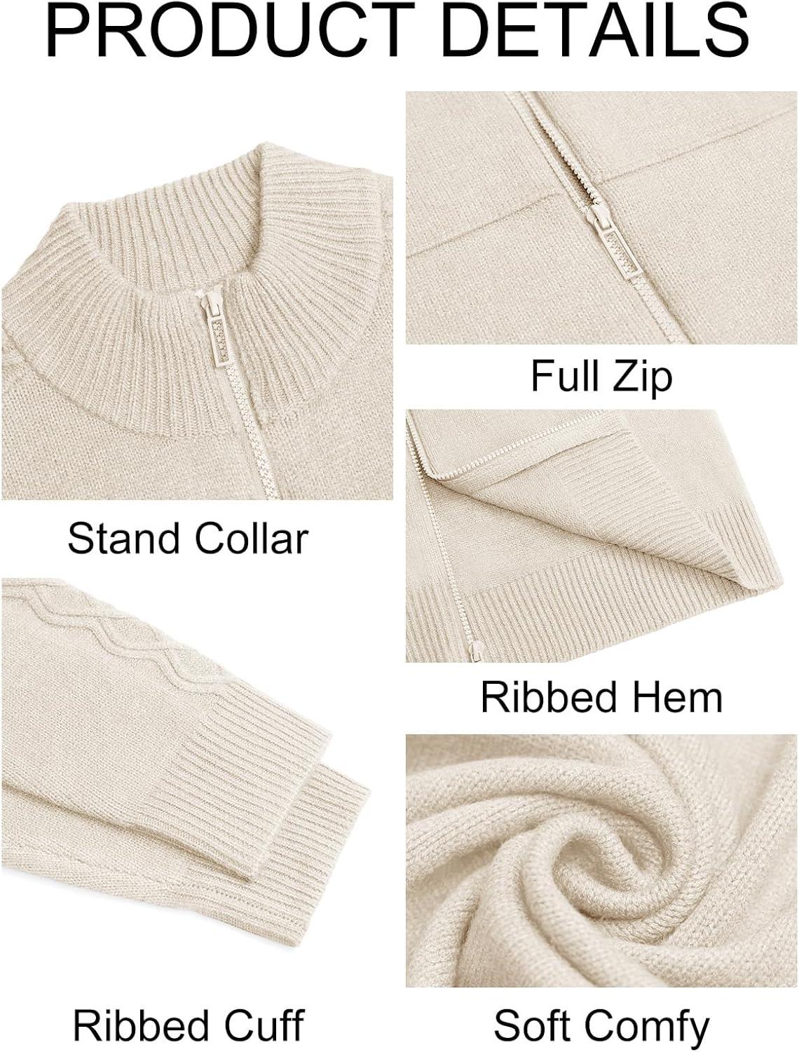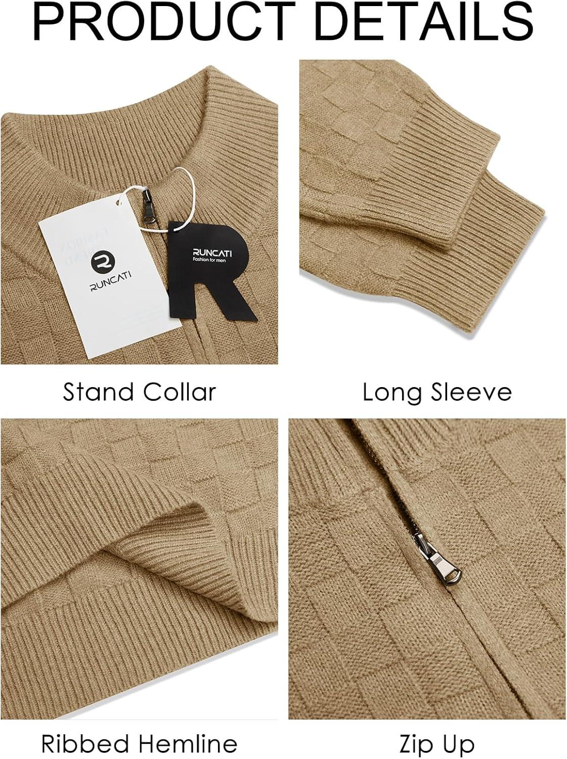 Runcati Mens Full Zip Cardigan Sweater Casual Mock Neck Cable Knitted Winter Chunky Sweaters(Beige)