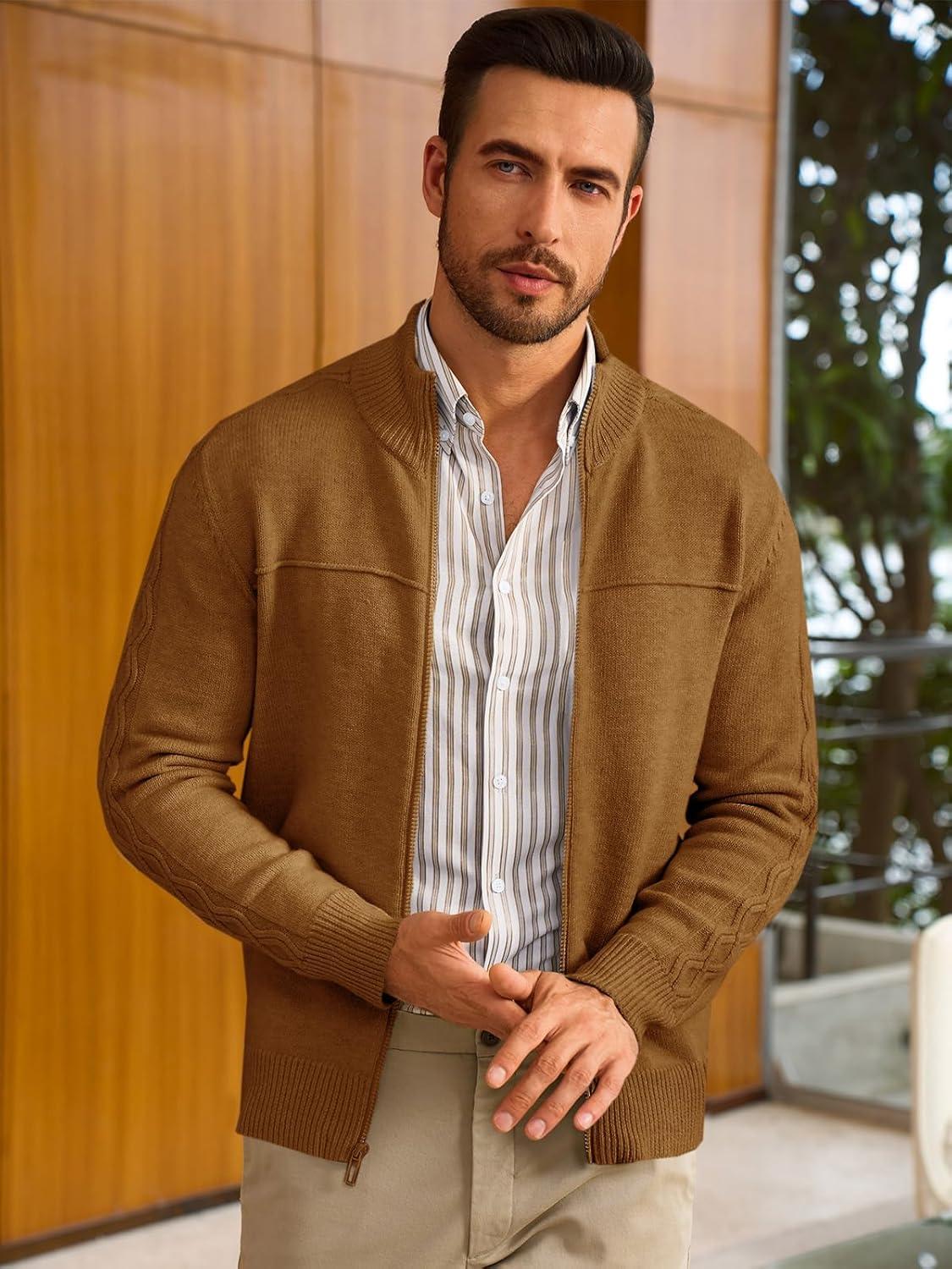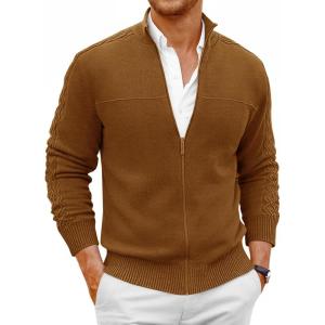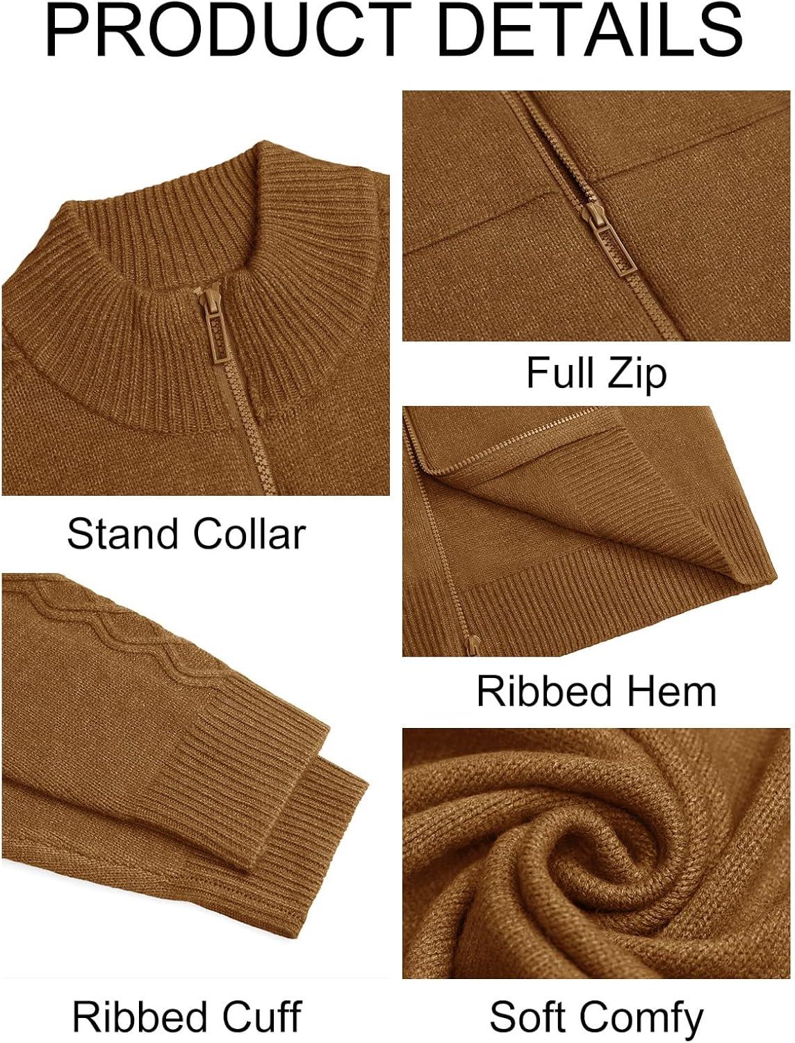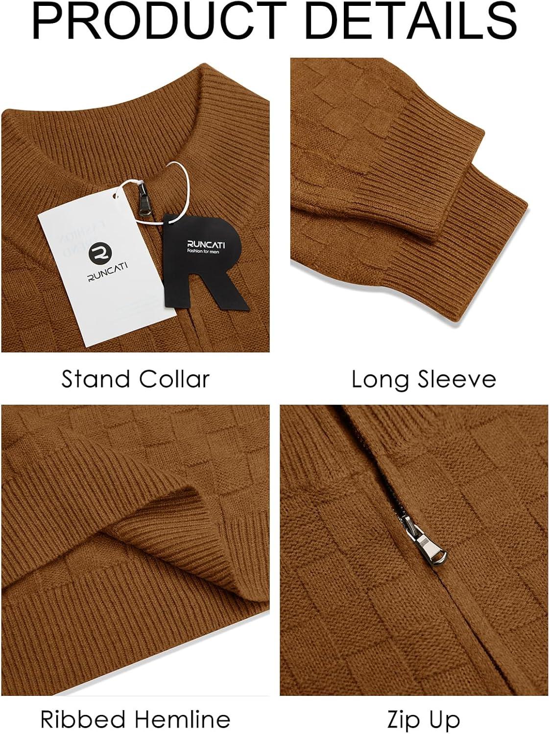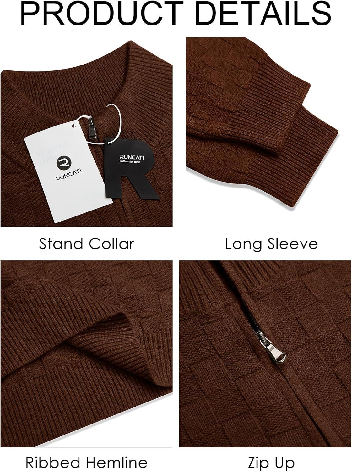 Runcati Mens Full Zip Cardigan Sweater Casual Mock Neck Cable Knitted Winter Chunky Sweaters(Brown)