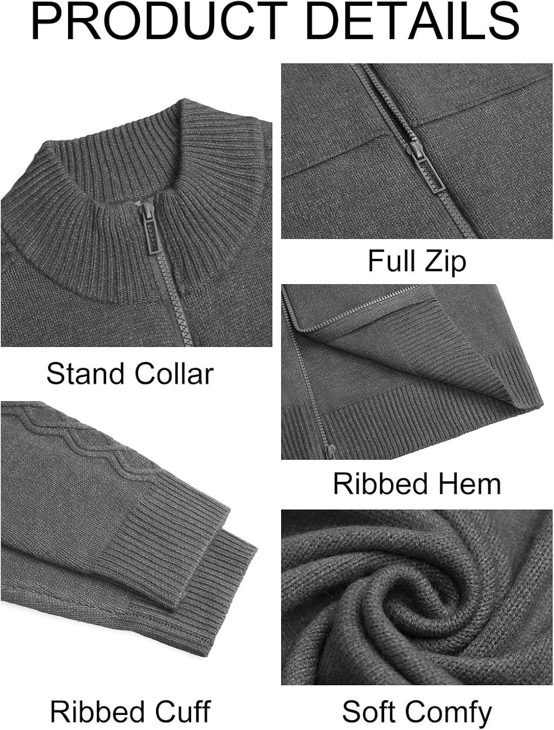 Runcati Mens Full Zip Cardigan Sweater Casual Mock Neck Cable Knitted Winter Chunky Sweaters(Dark Gray)
