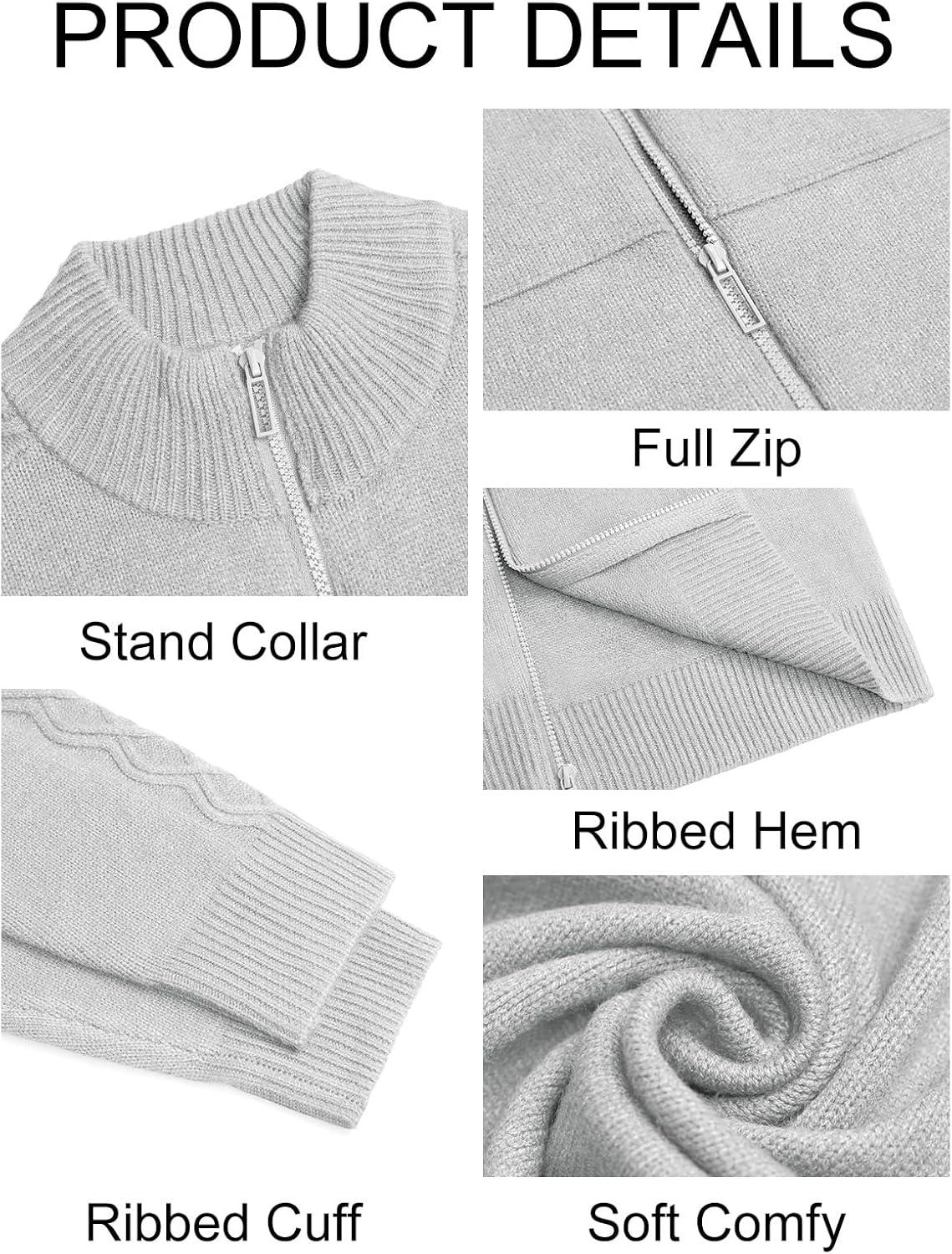 Runcati Mens Full Zip Cardigan Sweater Casual Mock Neck Cable Knitted Winter Chunky Sweaters(Light Gray)