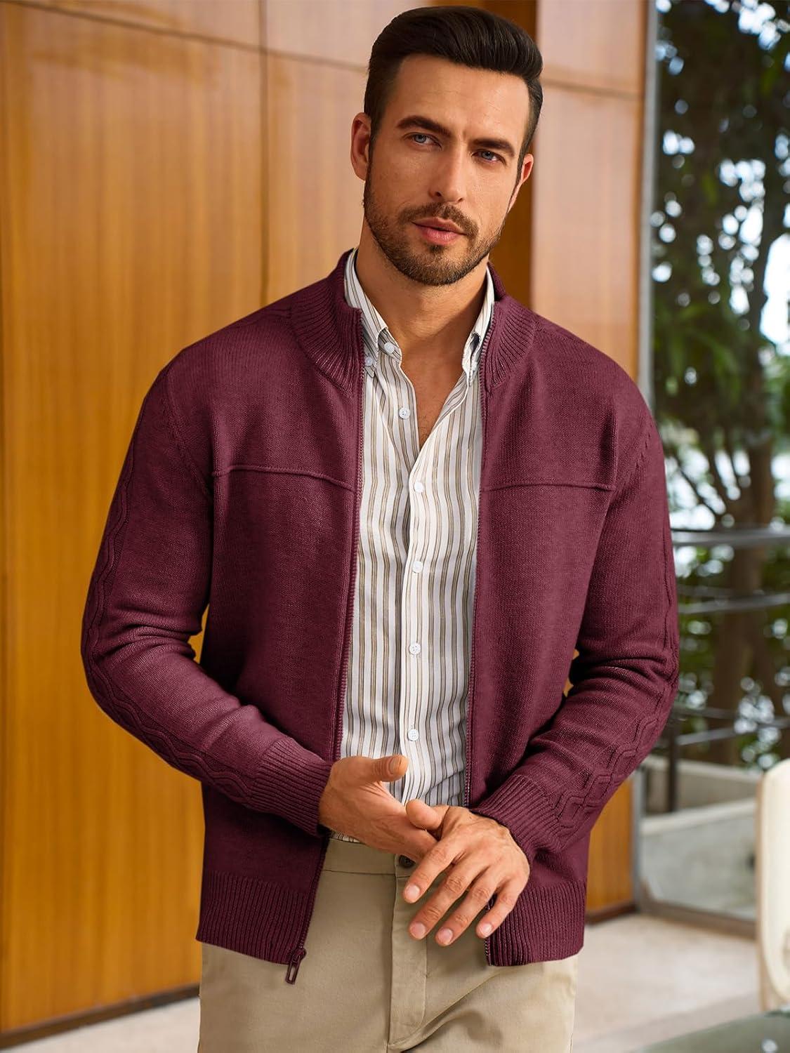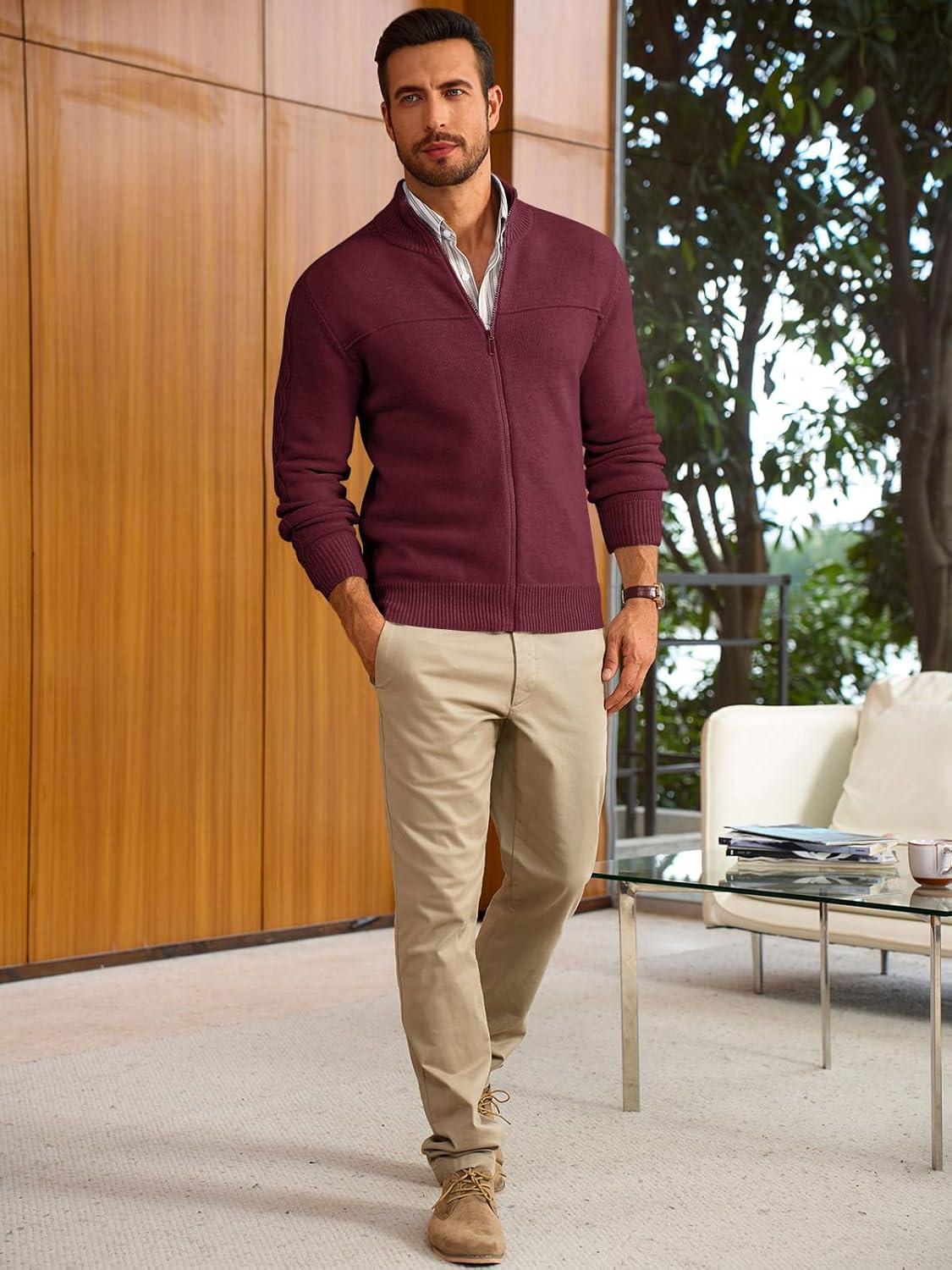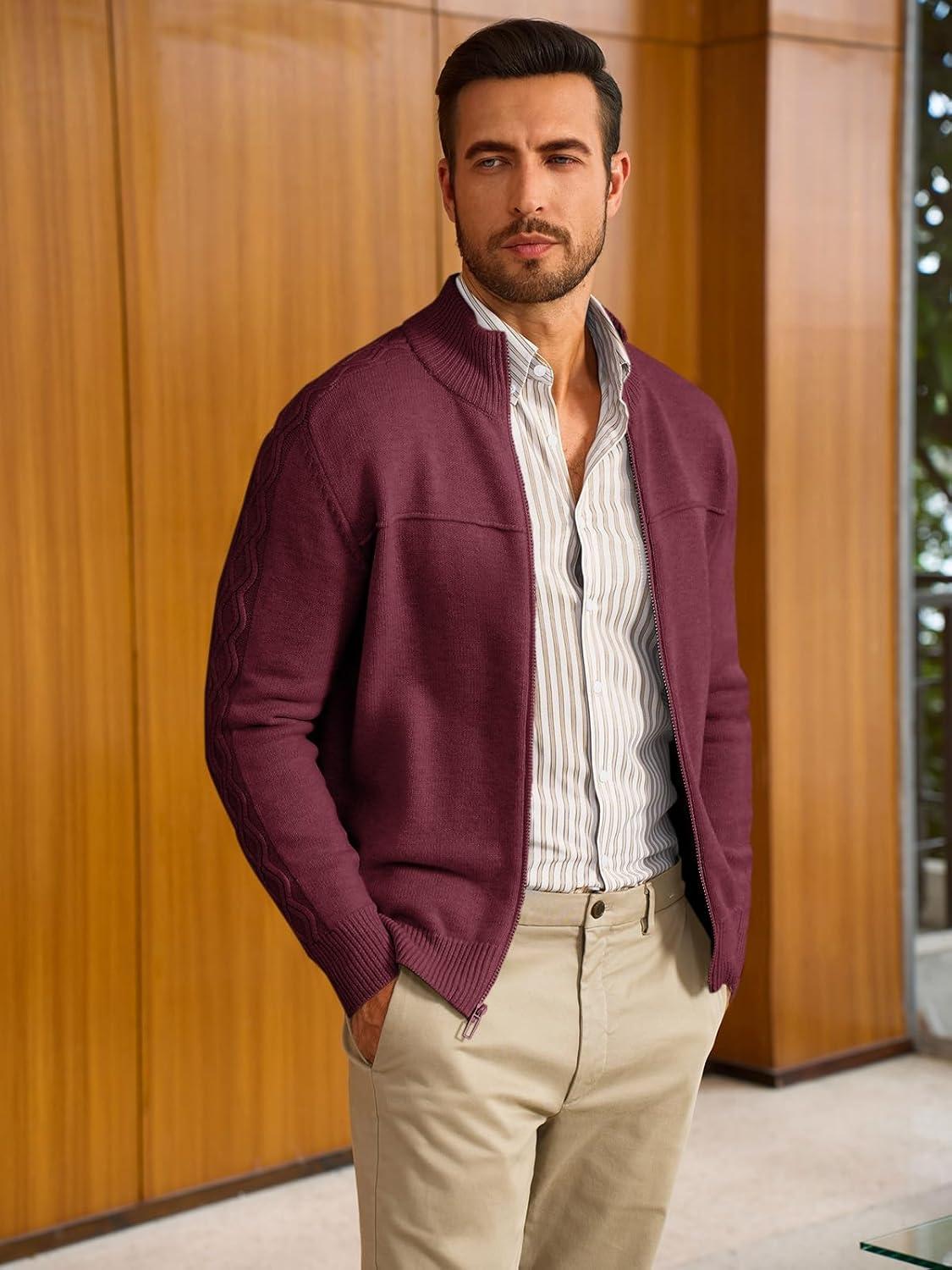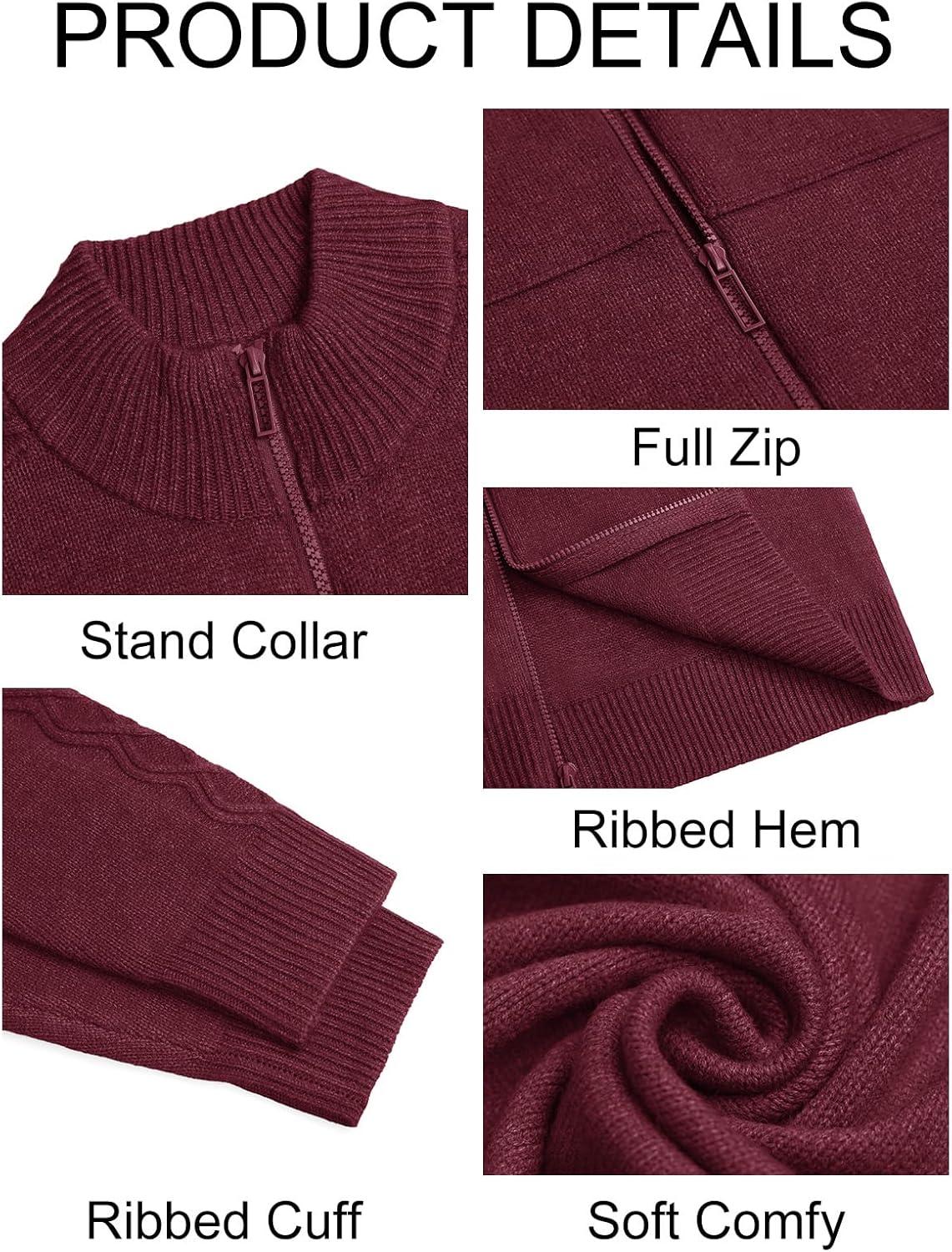 Runcati Mens Full Zip Cardigan Sweater Casual Mock Neck Cable Knitted Winter Chunky Sweaters(Wine Red)