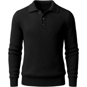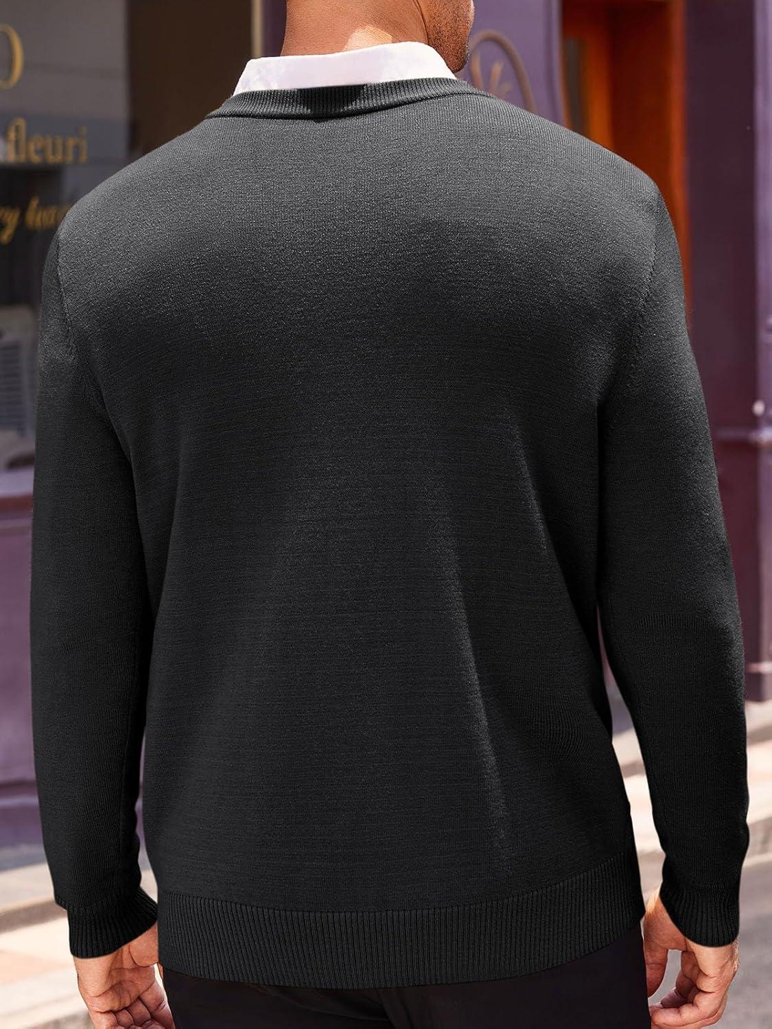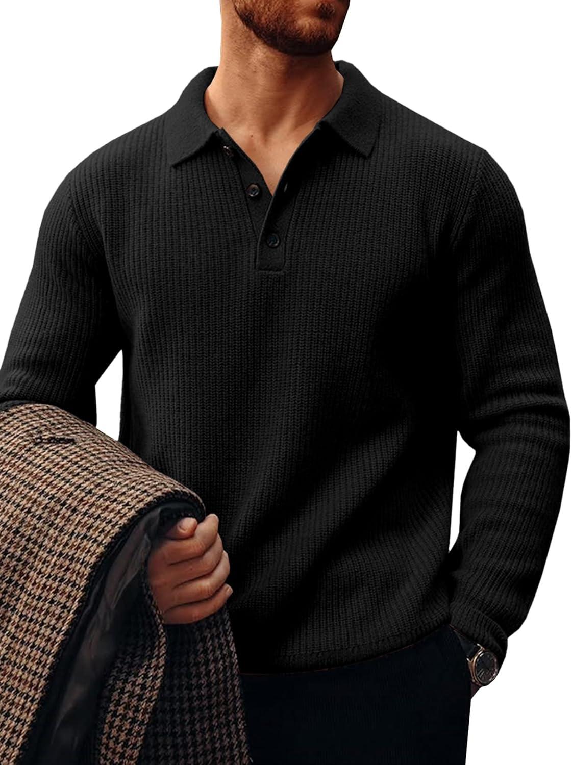 Runcati Mens Long Sleeve Polo Sweater Knit Polos V Neck Casual Dress Button Collared Pullover Sweaters(Black)