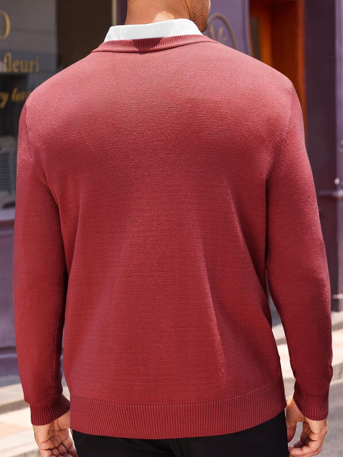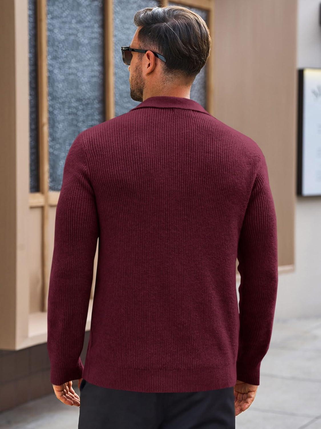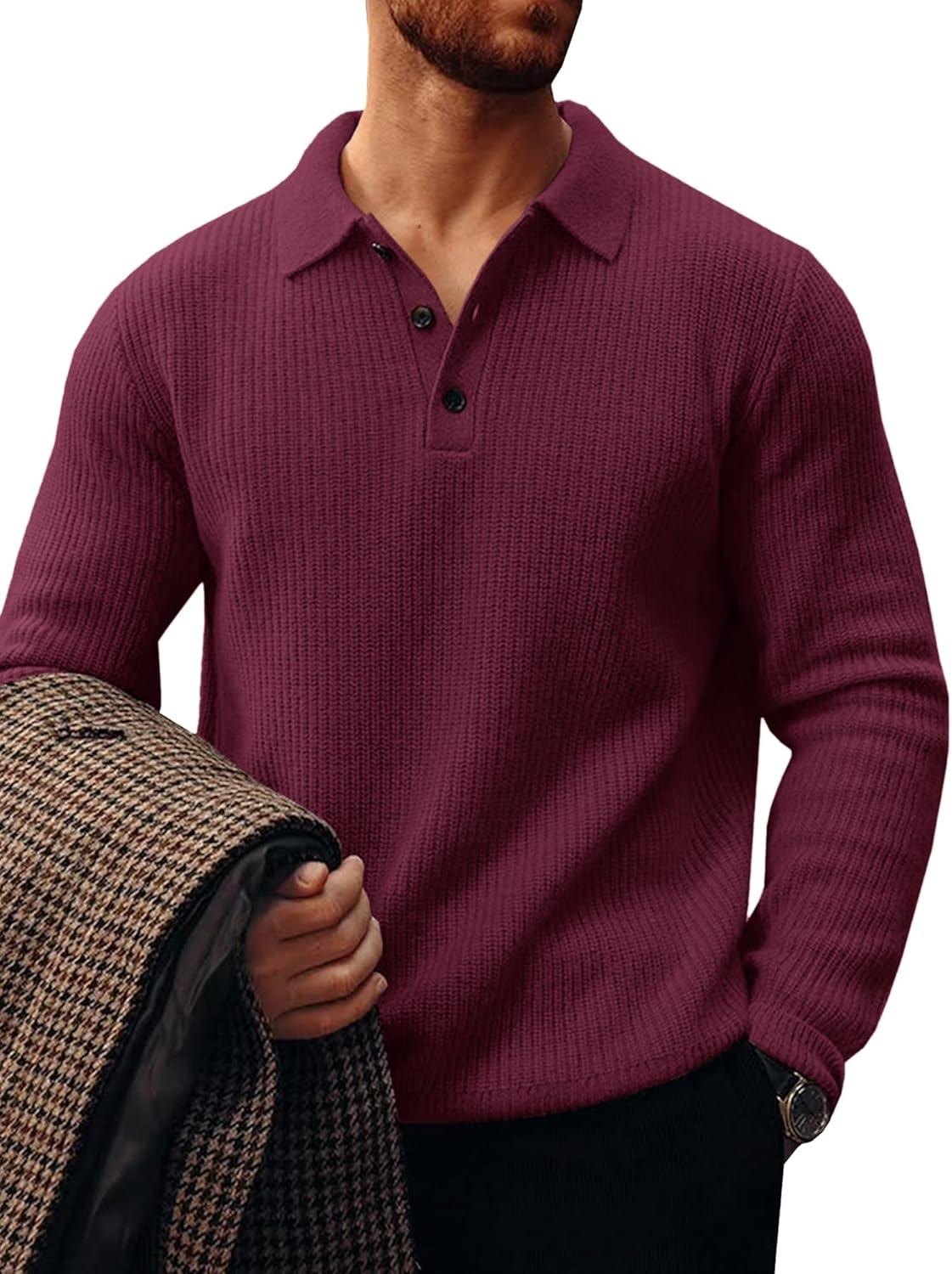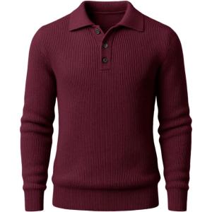 Runcati Mens Long Sleeve Polo Sweater Knit Polos V Neck Casual Dress Button Collared Pullover Sweaters(Burgundy)