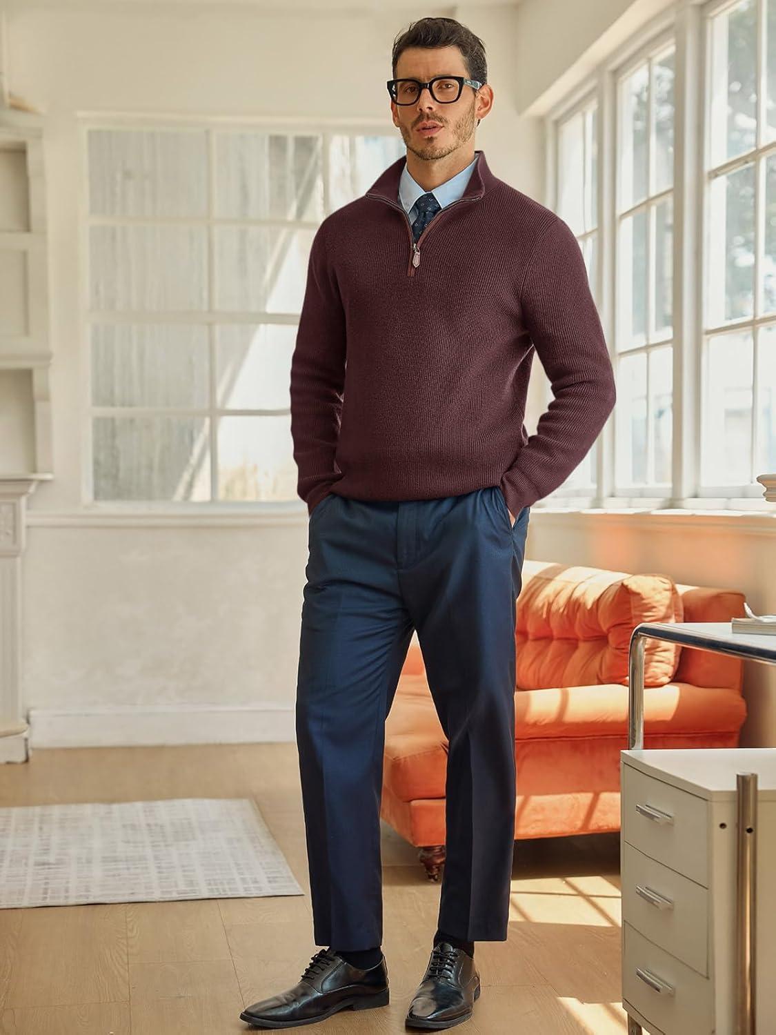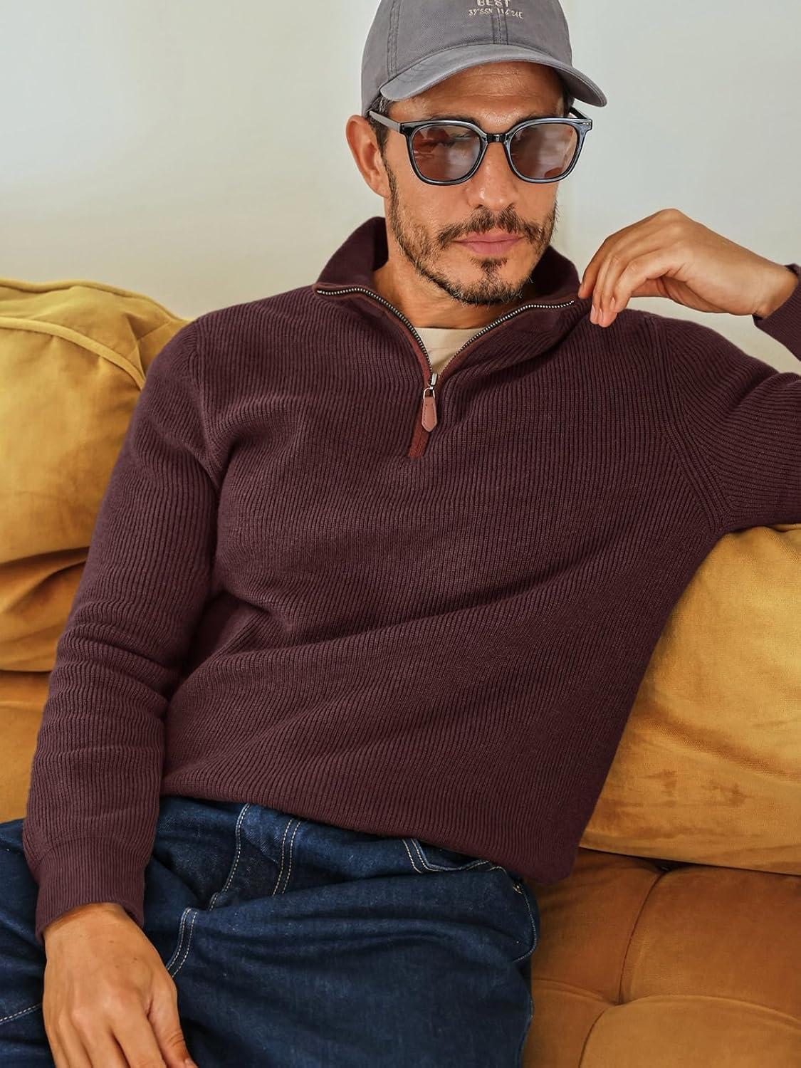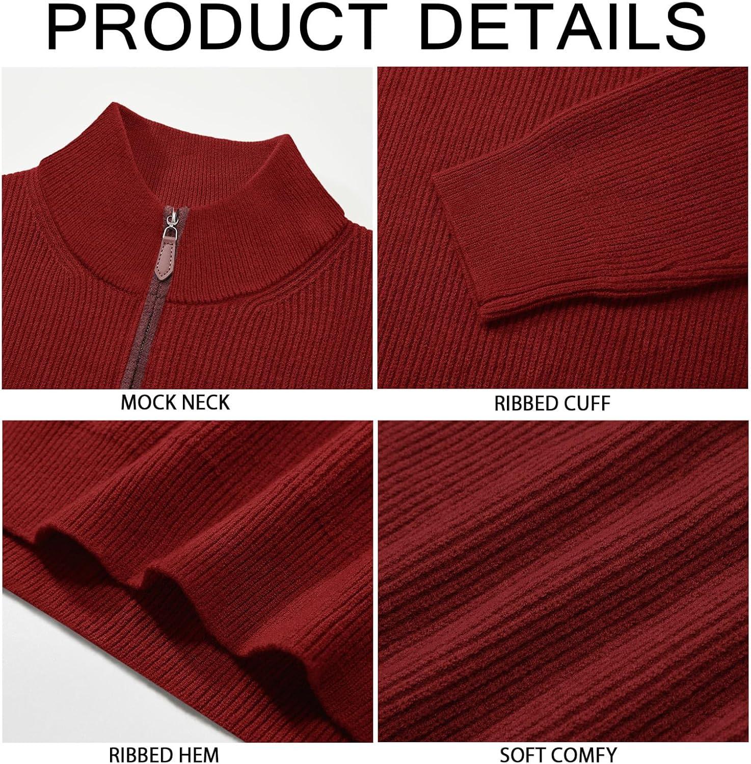 Runcati Mens Quarter-Zip Pullover Sweater Casual Mock Neck Winter Warm Ribbed Polo Sweaters(Wine Red)