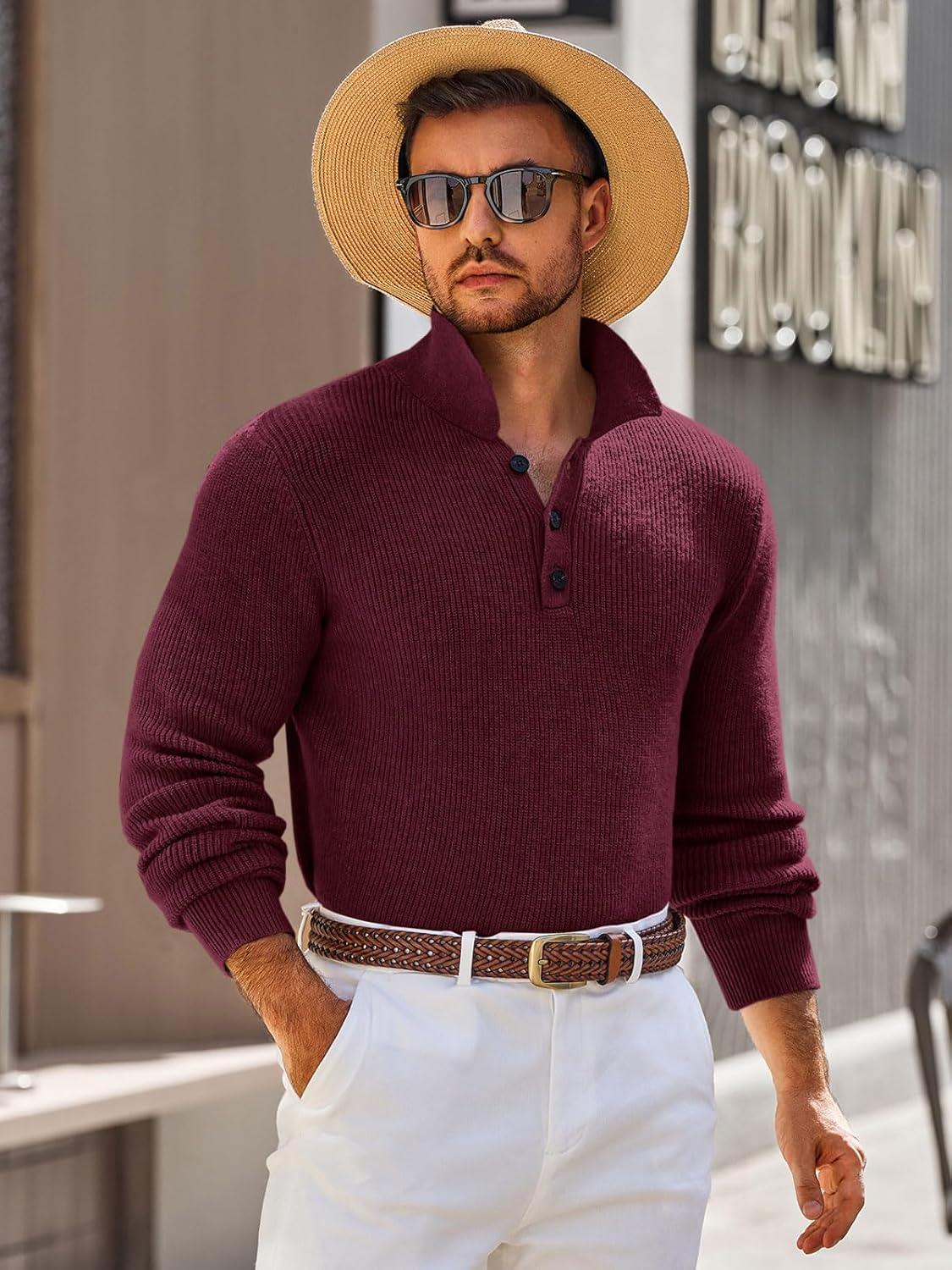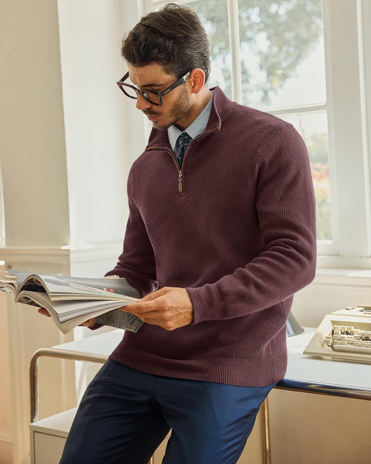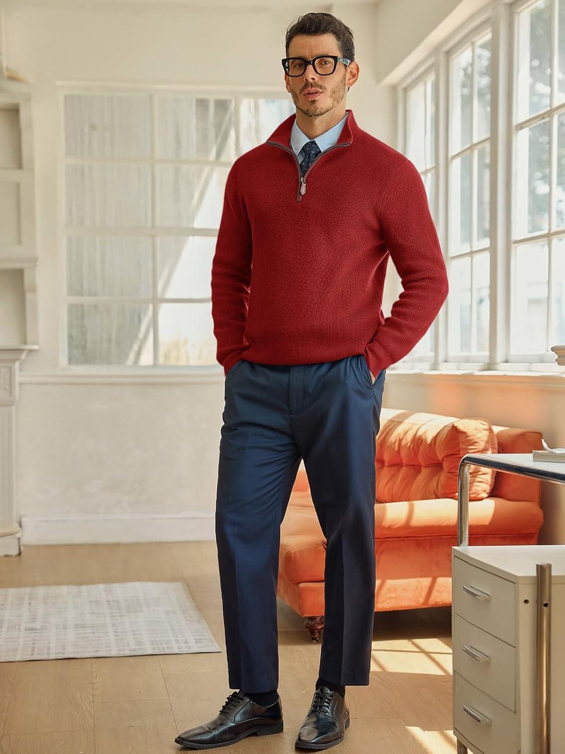 Runcati Mens Quarter-Zip Pullover Sweater Casual Mock Neck Winter Warm Ribbed Polo Sweaters(Wine Red)