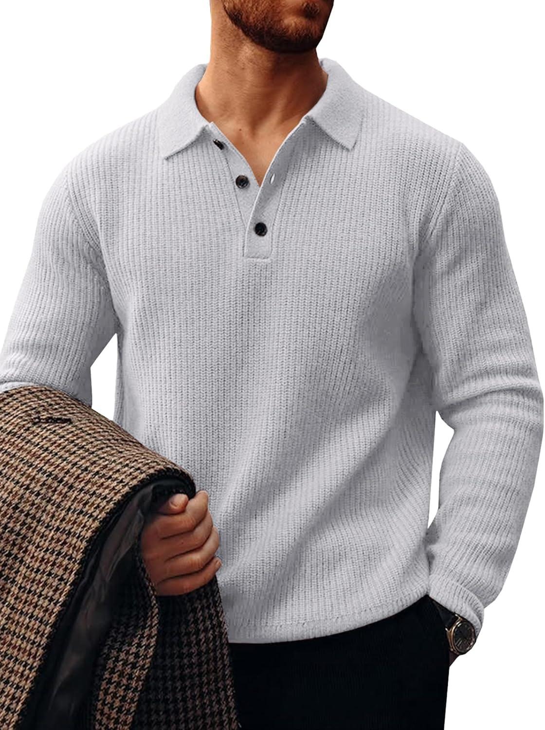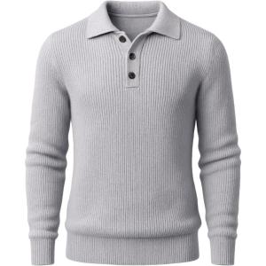 Runcati Mens Long Sleeve Polo Sweater Knit Polos V Neck Casual Dress Button Collared Pullover Sweaters(Light Grey)