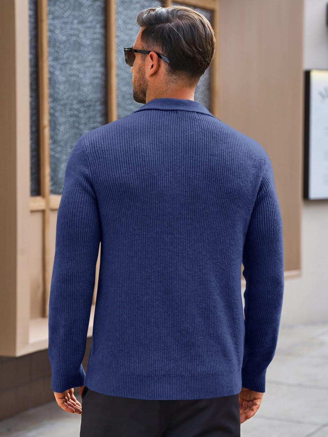 Runcati Mens Long Sleeve Polo Sweater Knit Polos V Neck Casual Dress Button Collared Pullover Sweaters(Navy)