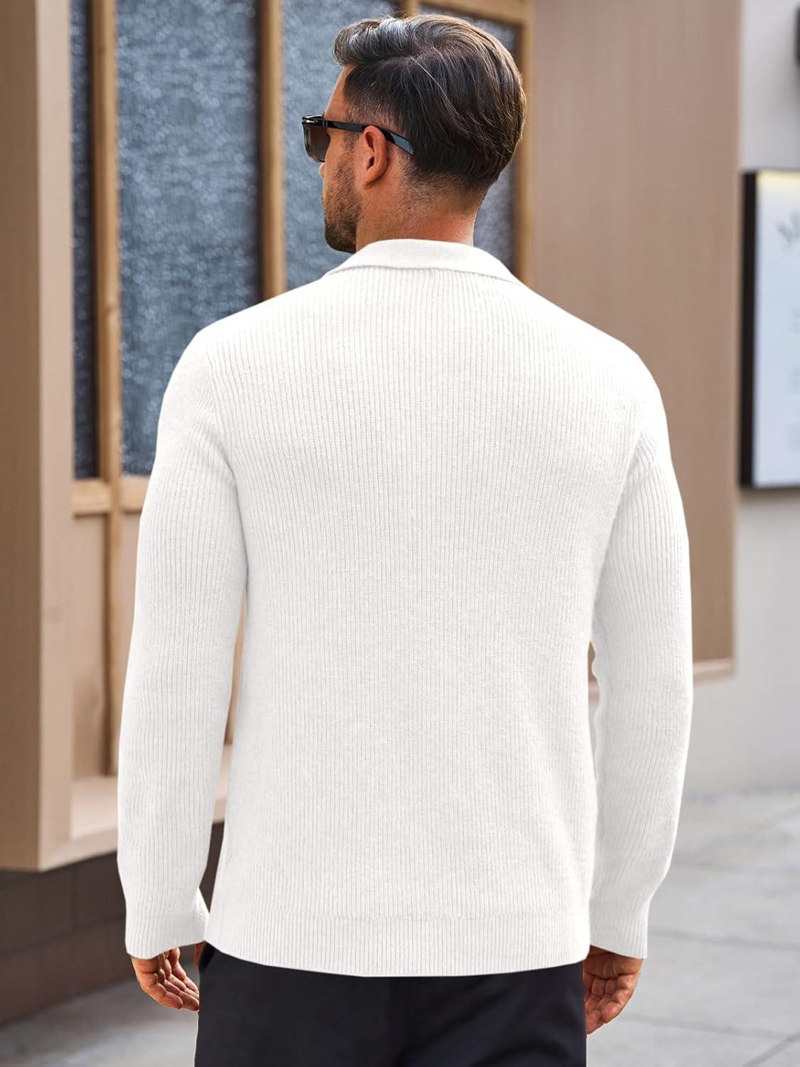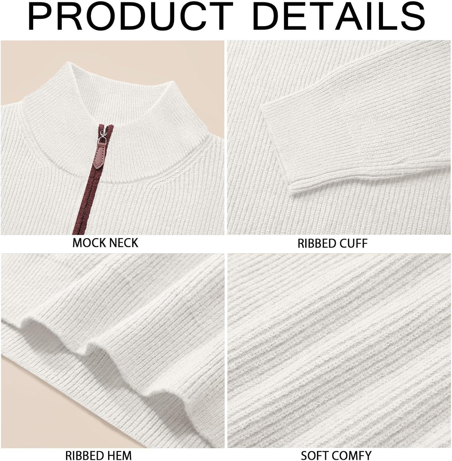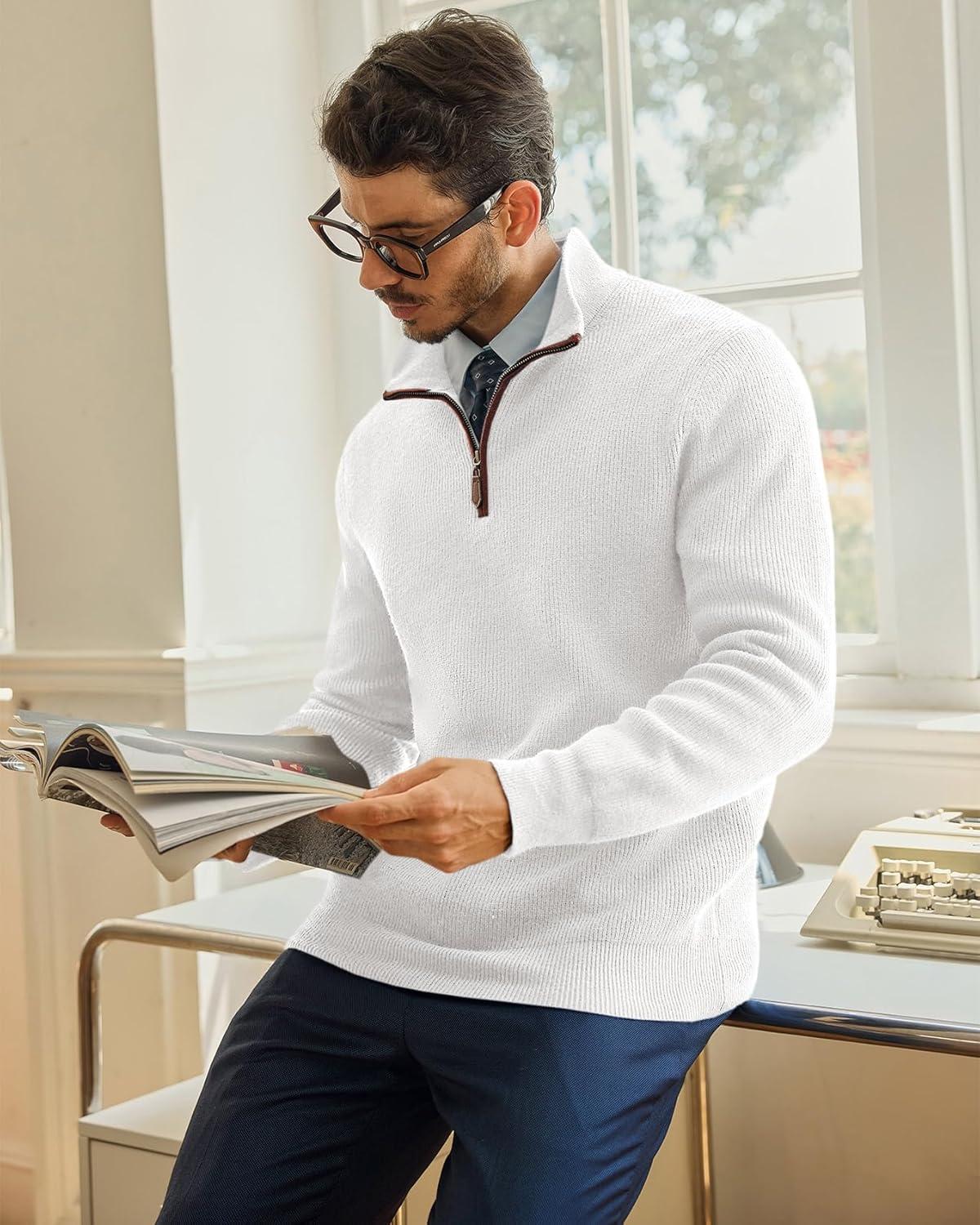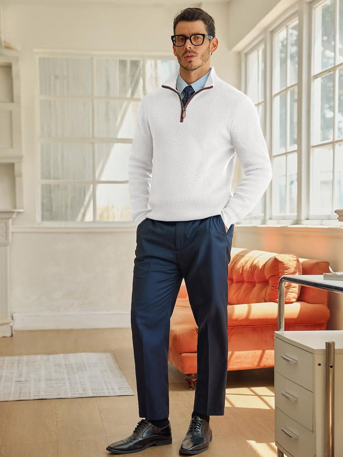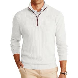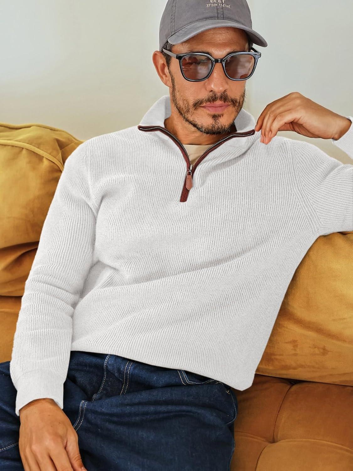 Runcati Mens Quarter-Zip Pullover Sweater Casual Mock Neck Winter Warm Ribbed Polo Sweaters(White)