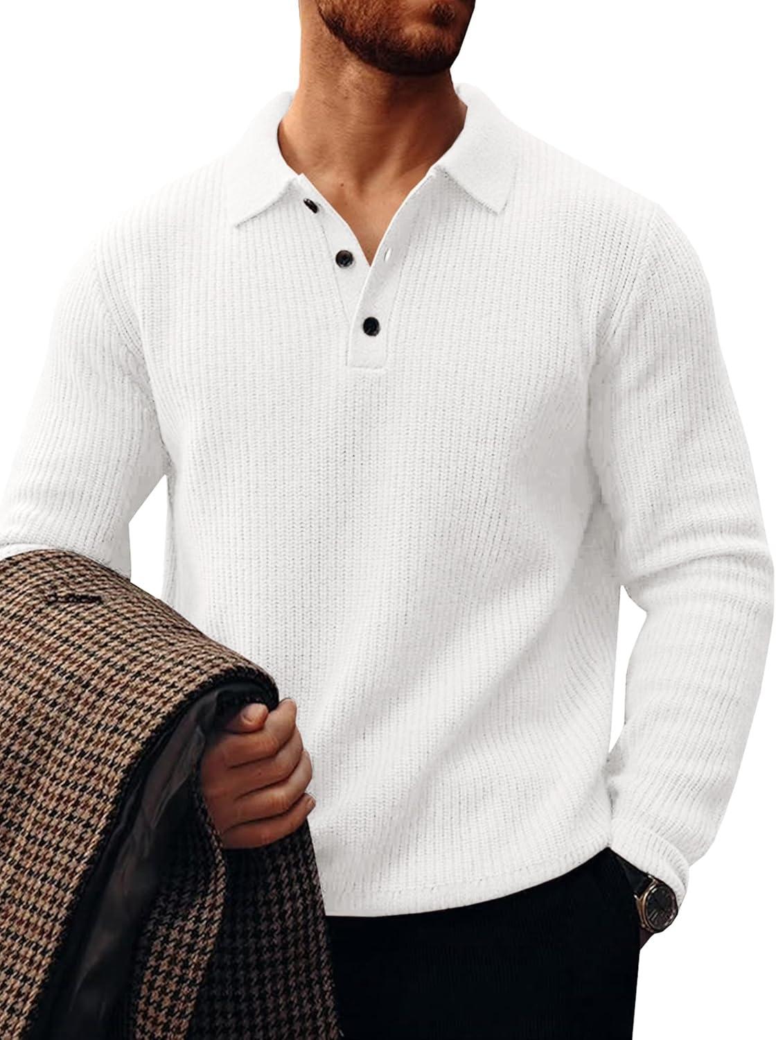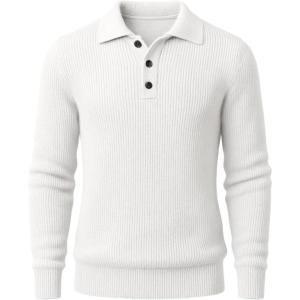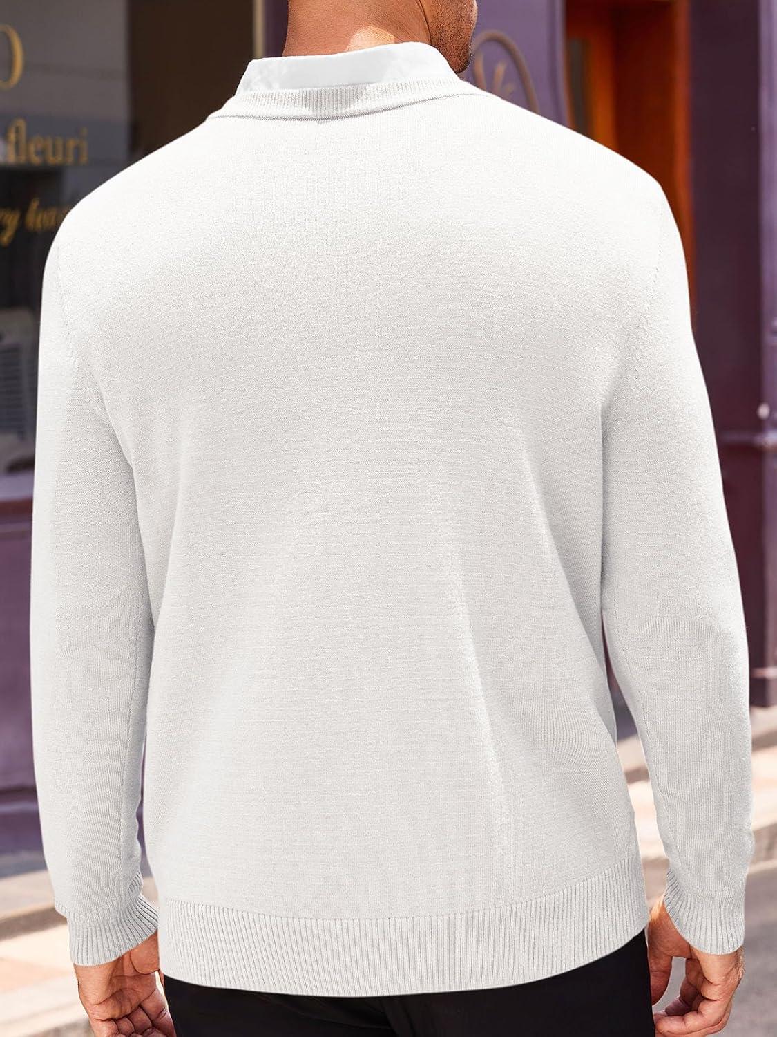 Runcati Mens Long Sleeve Polo Sweater Knit Polos V Neck Casual Dress Button Collared Pullover Sweaters(White)