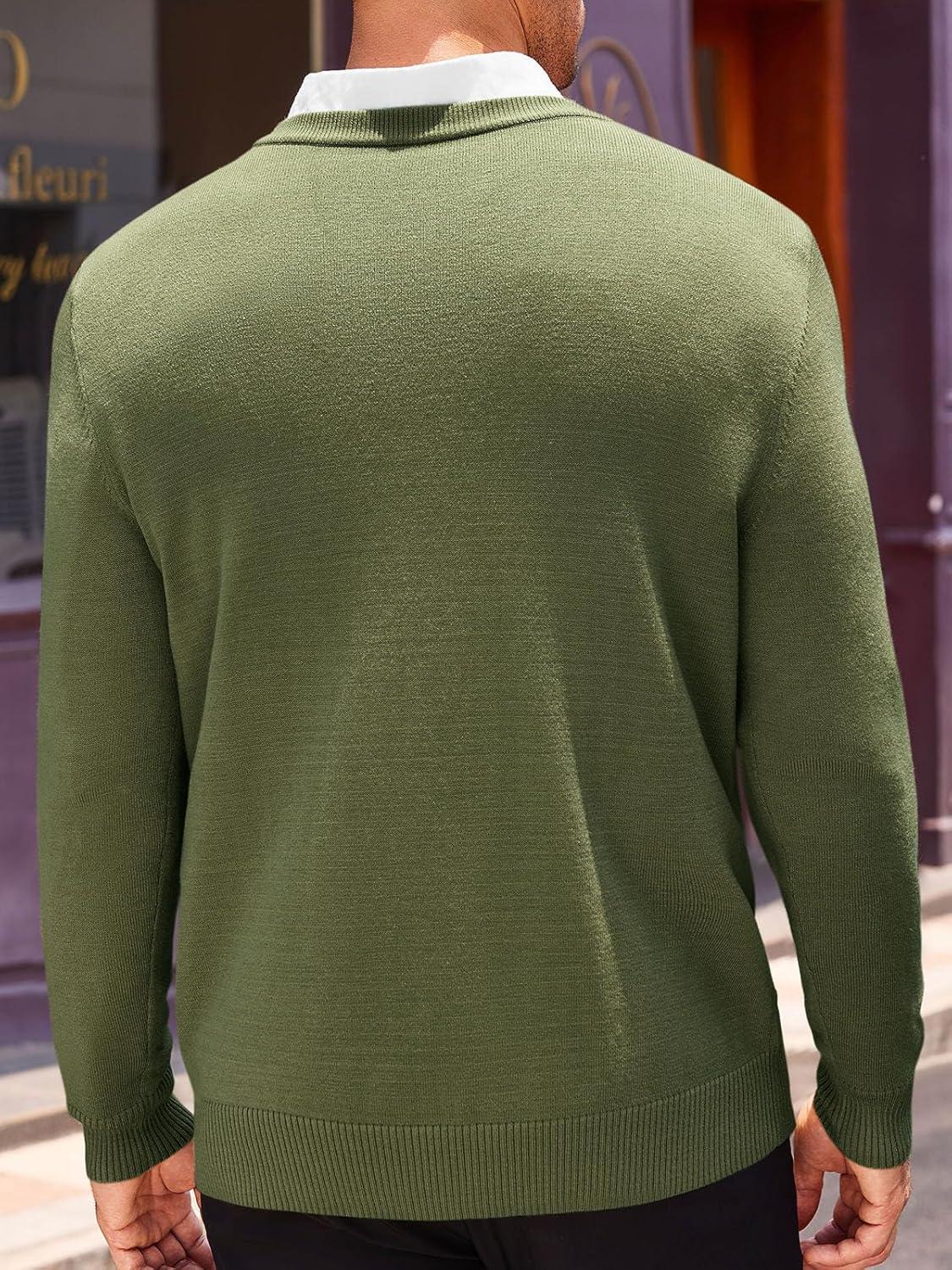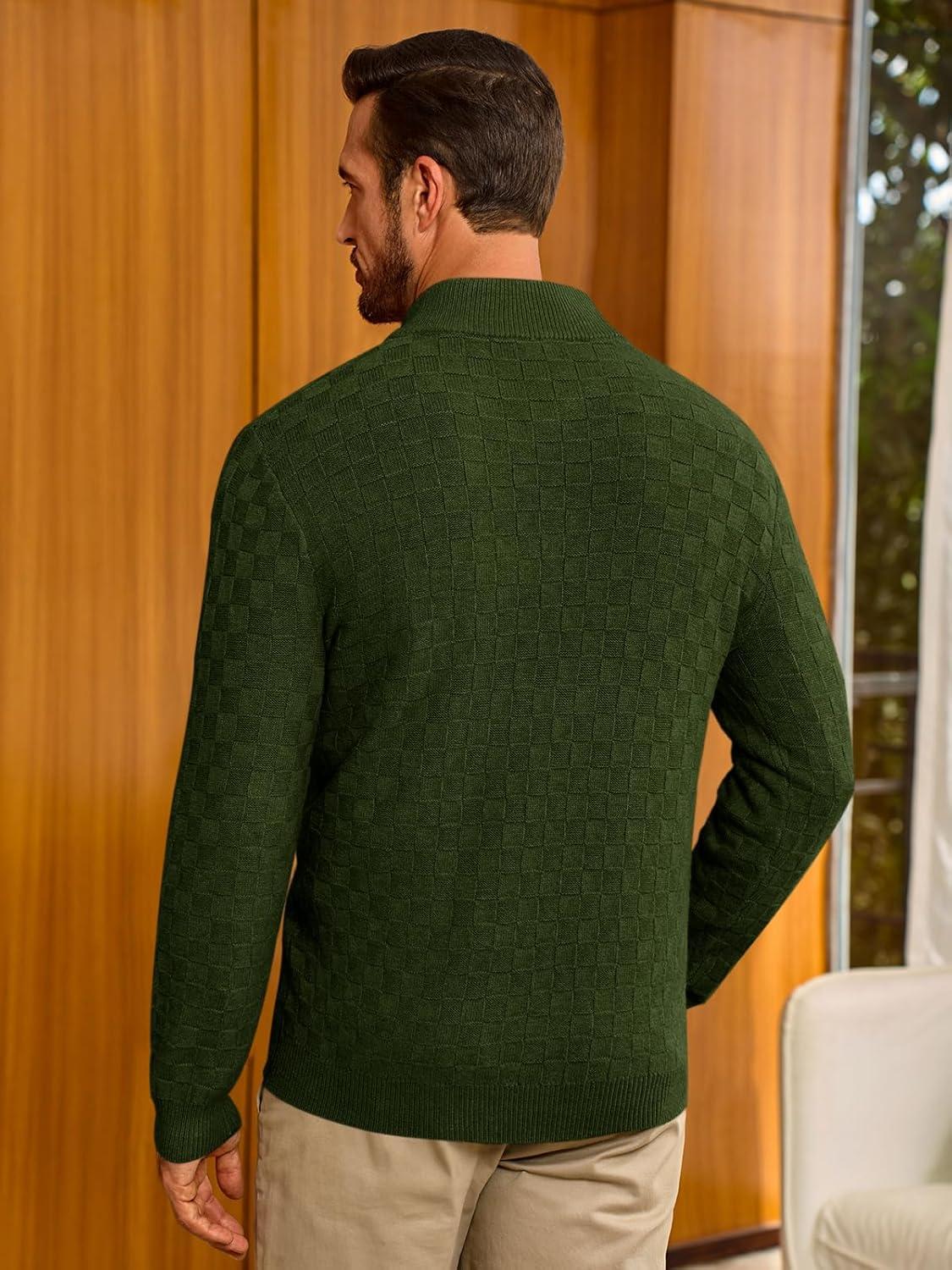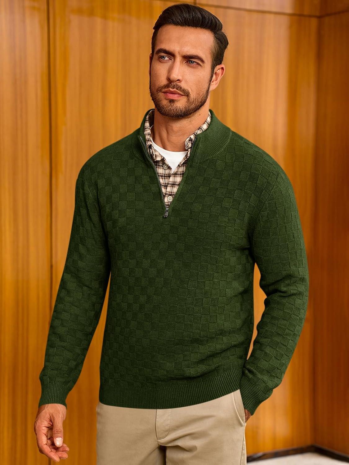 Runcati Mens Quarter Zip Pullover Sweater Casual Mock Neck Slim Fit Checkered Knitted Polo Sweaters(Army Green)