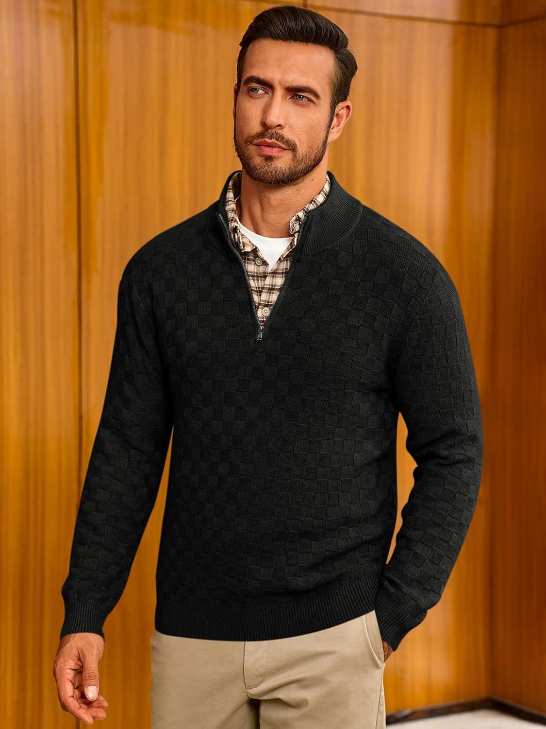 Runcati Mens Quarter Zip Pullover Sweater Casual Mock Neck Slim Fit Checkered Knitted Polo Sweaters(Black)