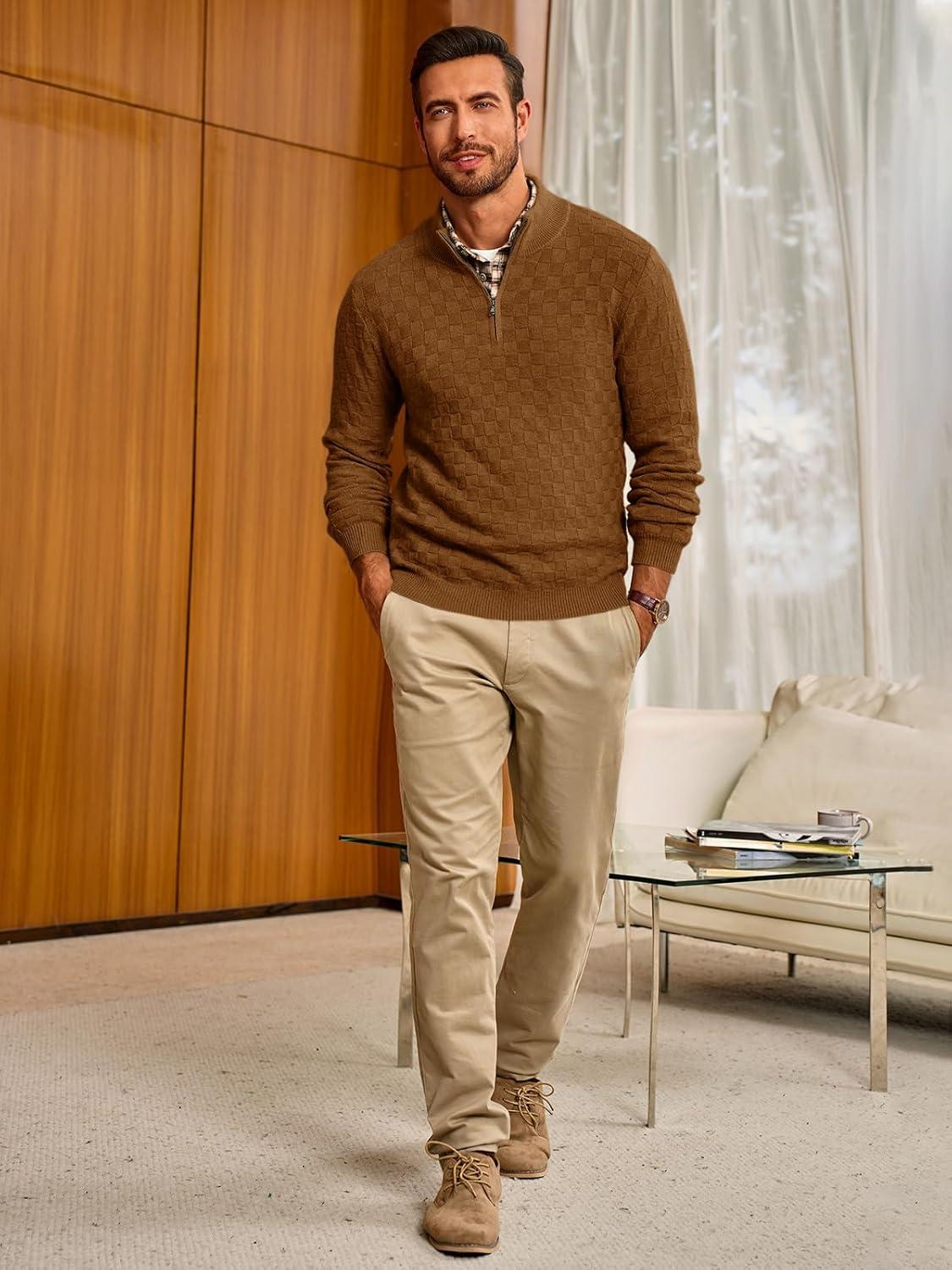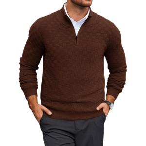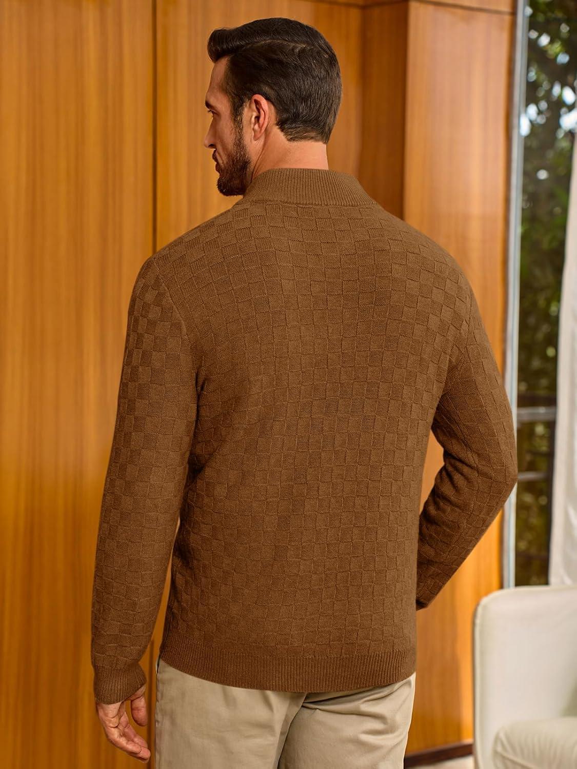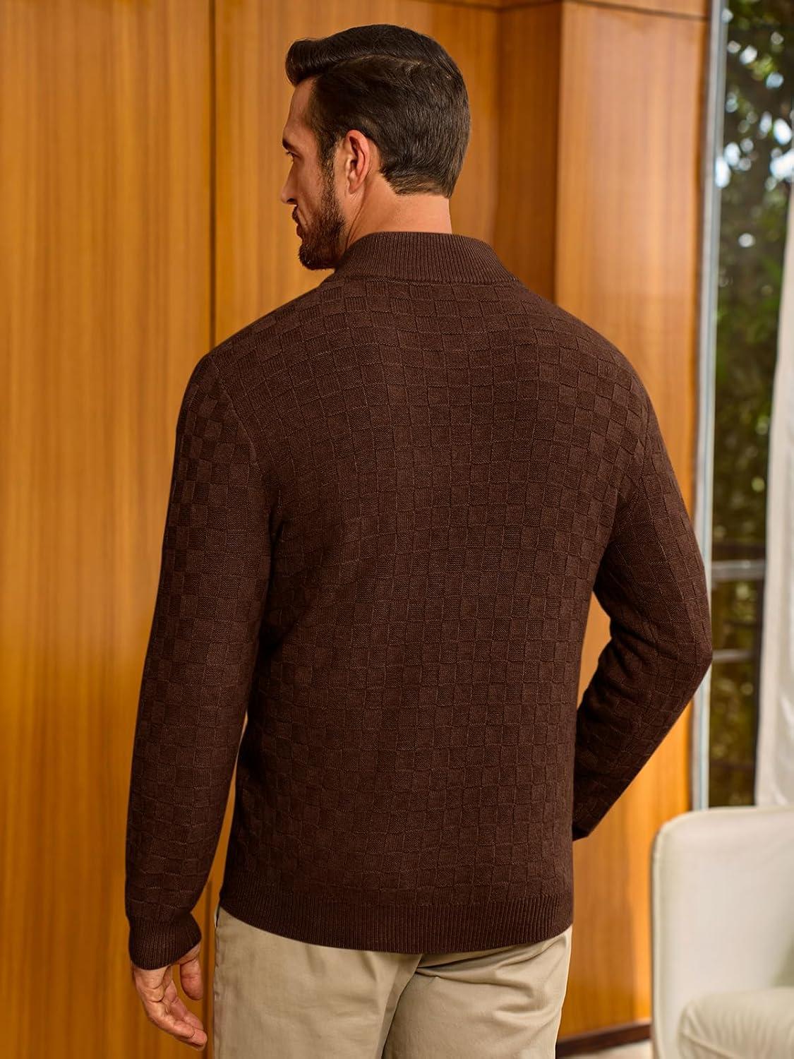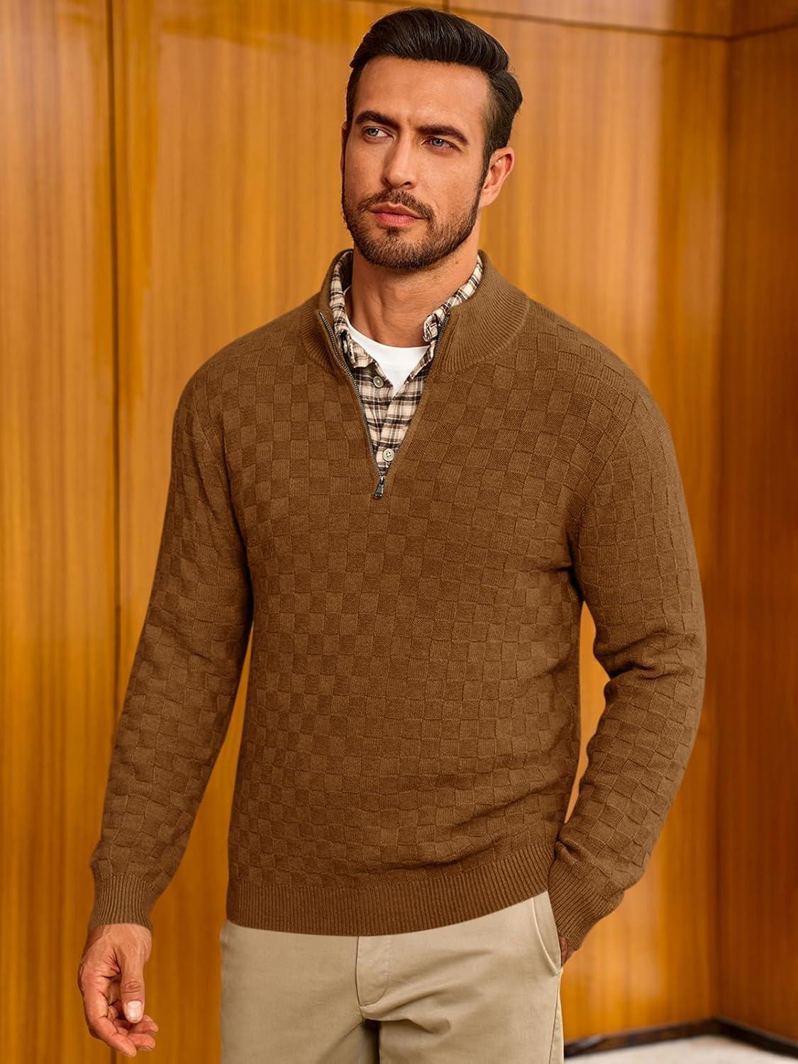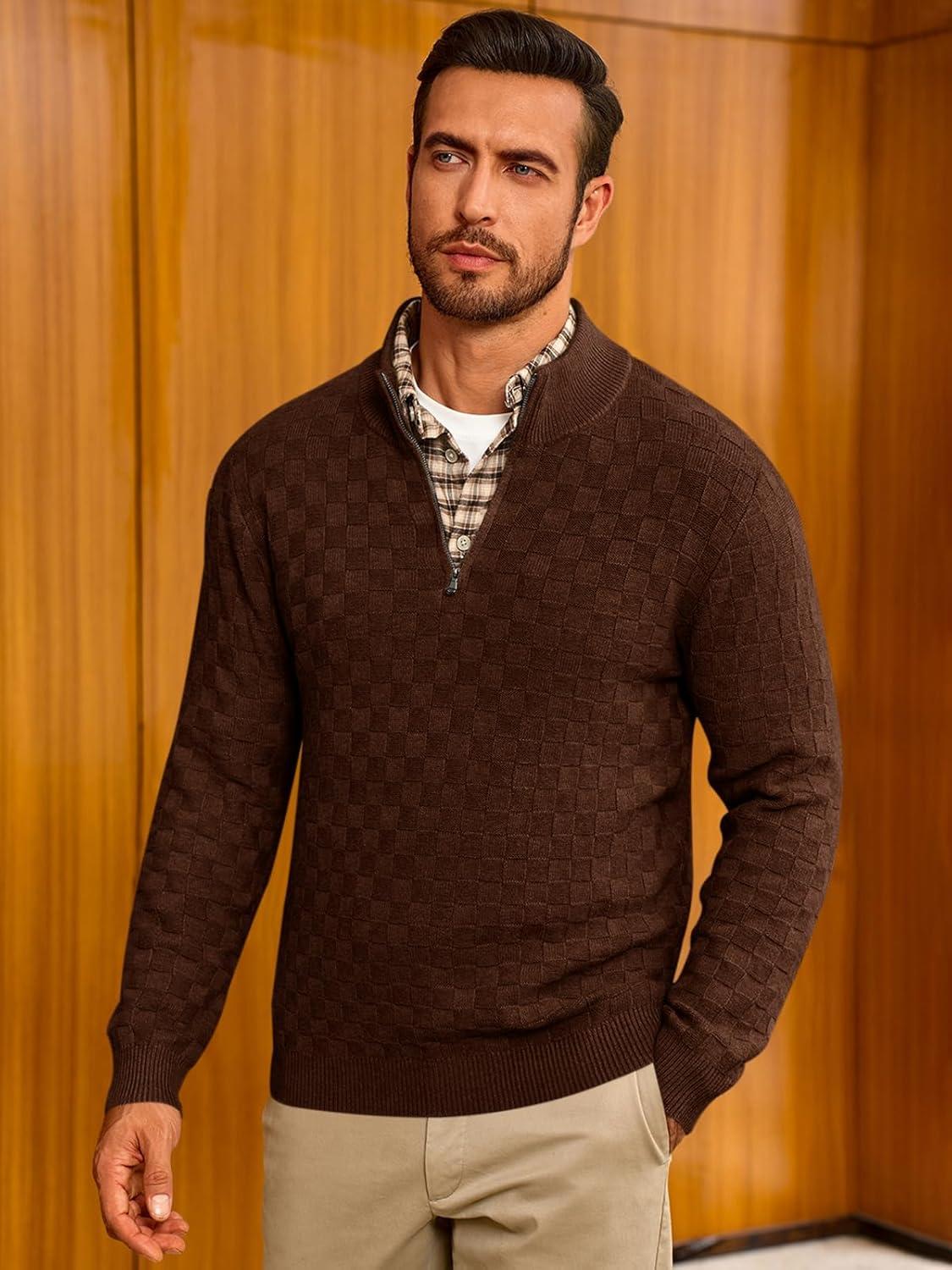 Runcati Mens Quarter Zip Pullover Sweater Casual Mock Neck Slim Fit Checkered Knitted Polo Sweaters(Coffee)