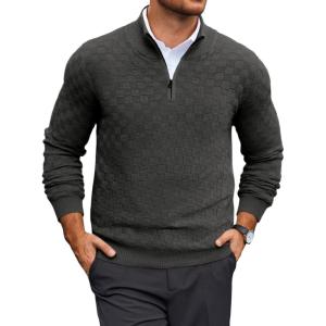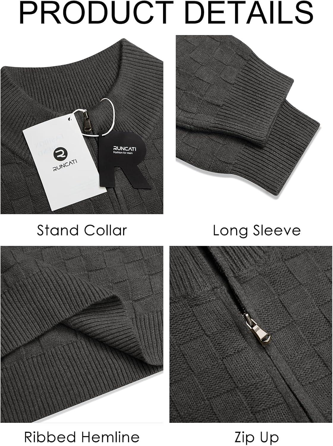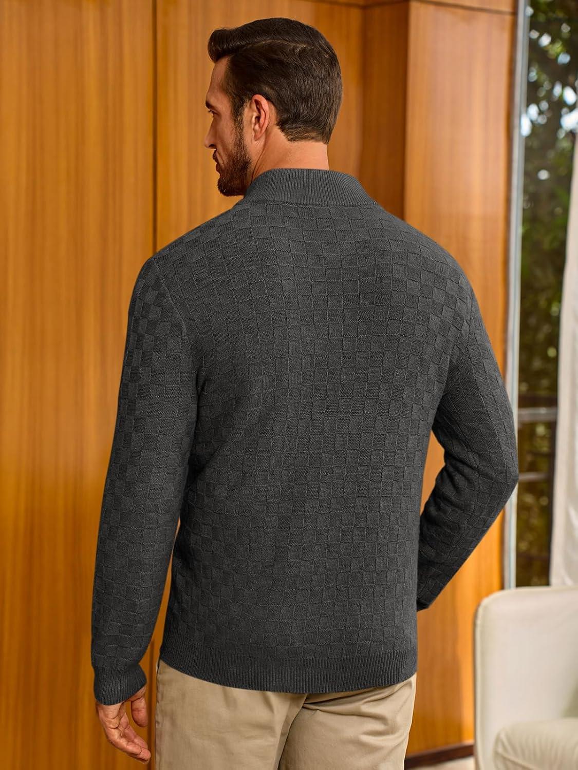 Runcati Mens Quarter Zip Pullover Sweater Casual Mock Neck Slim Fit Checkered Knitted Polo Sweaters(Dark Grey)