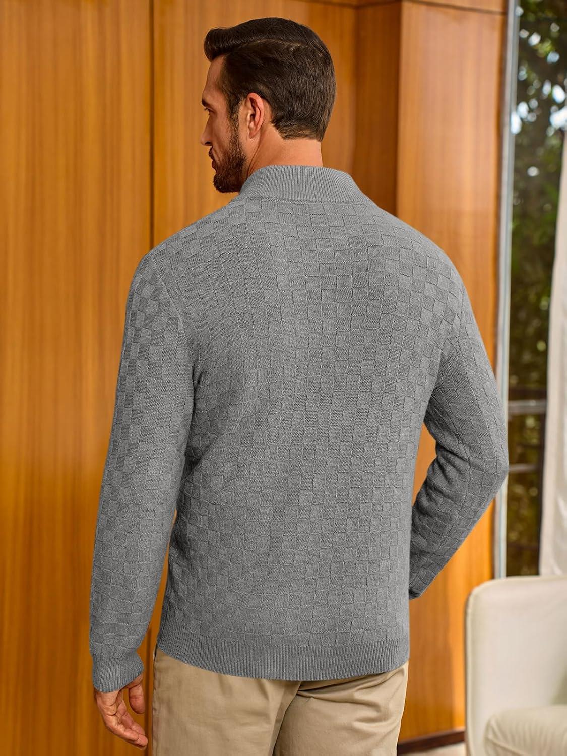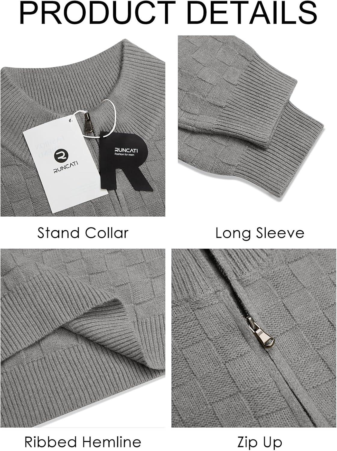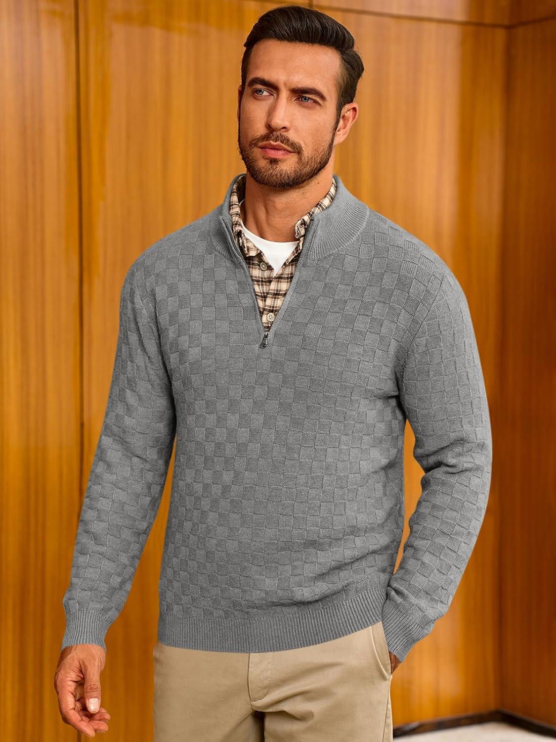 Runcati Mens Quarter Zip Pullover Sweater Casual Mock Neck Slim Fit Checkered Knitted Polo Sweaters(Grey)