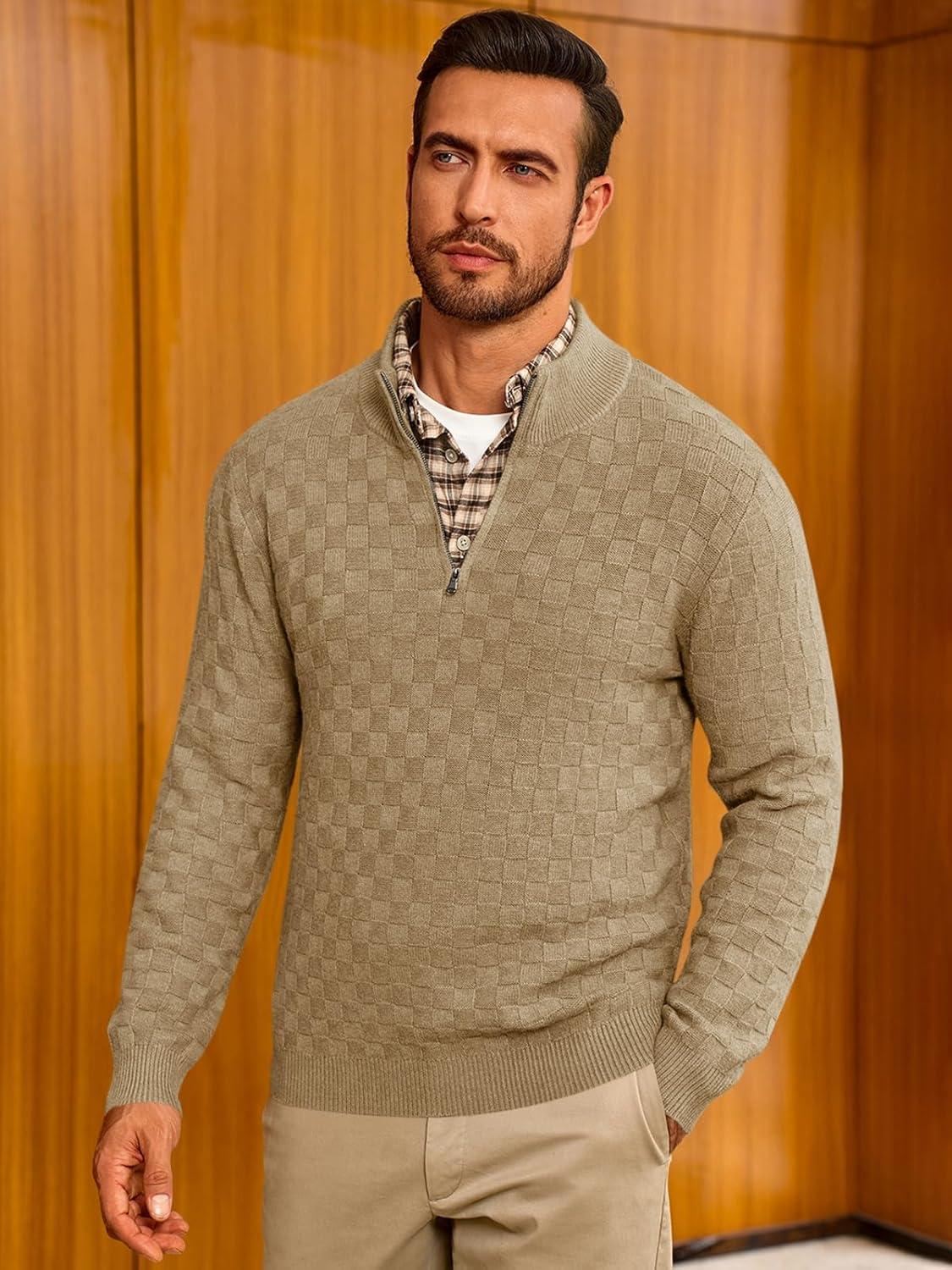 Runcati Mens Quarter Zip Pullover Sweater Casual Mock Neck Slim Fit Checkered Knitted Polo Sweaters(Khaki)