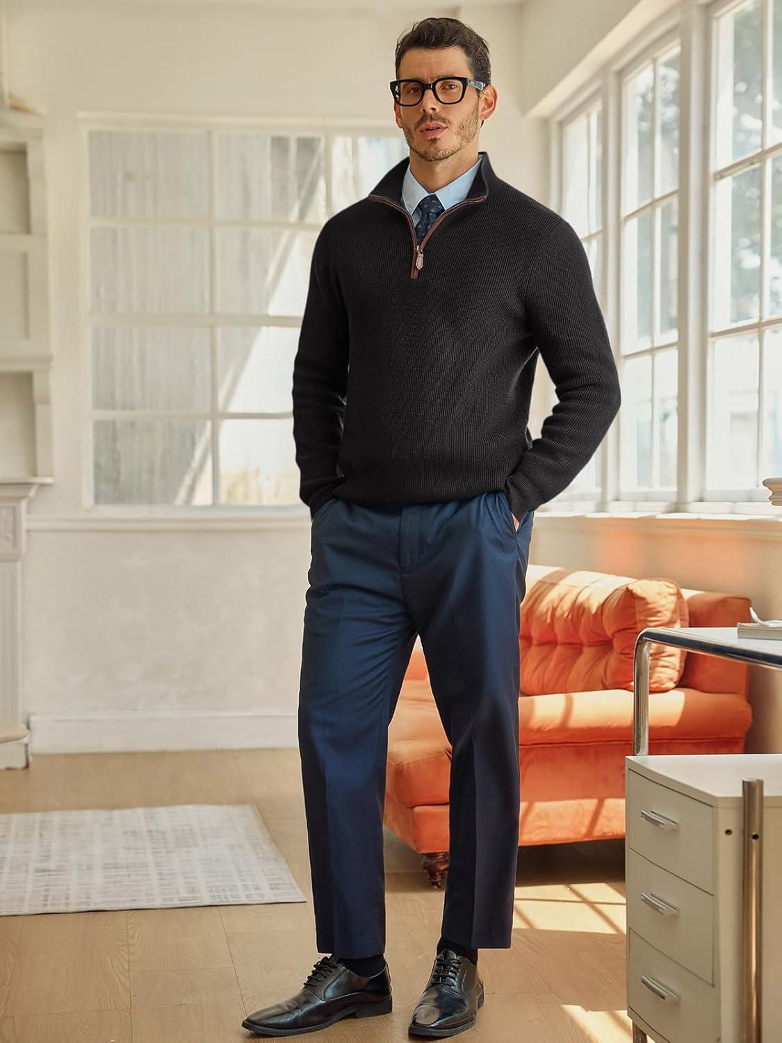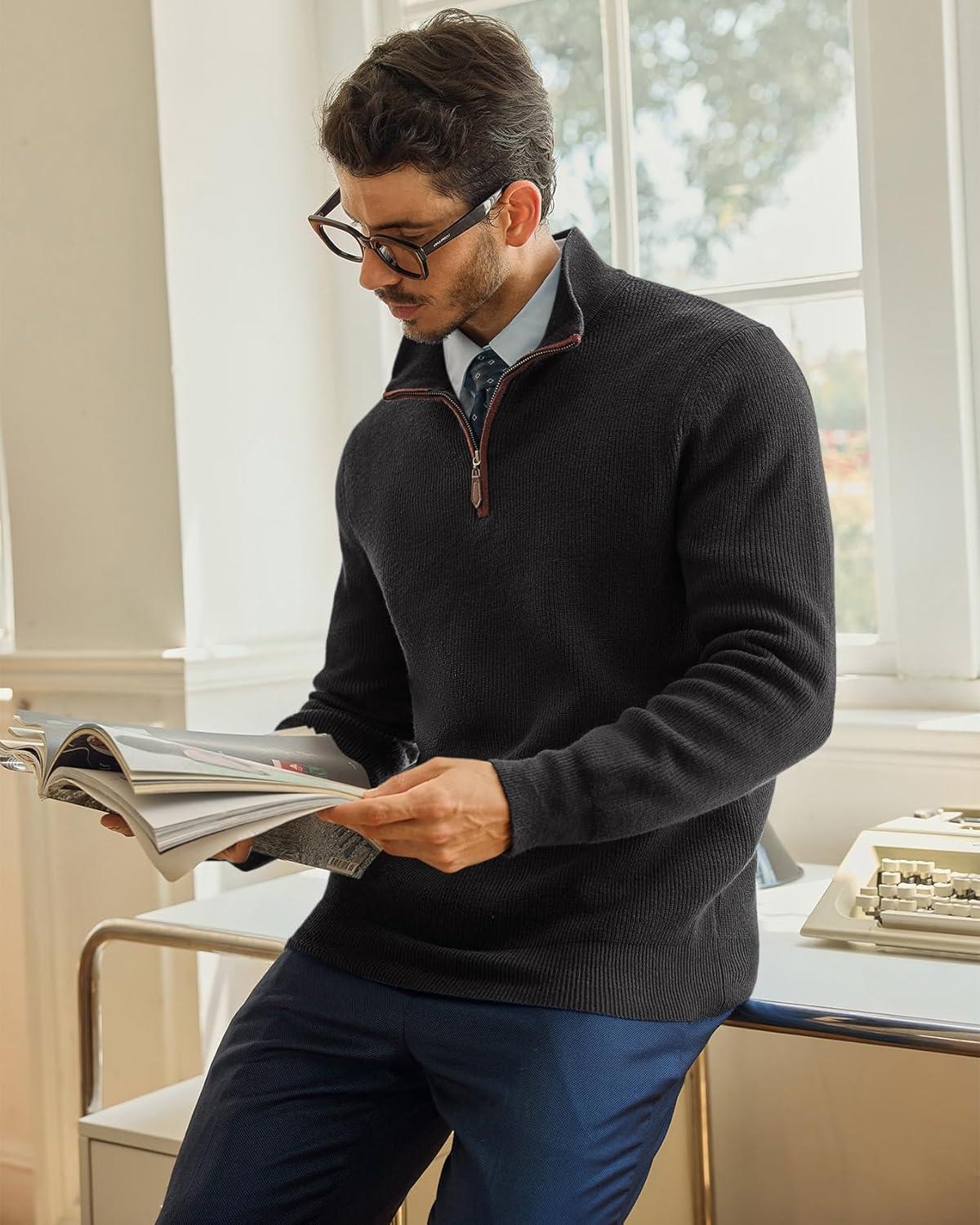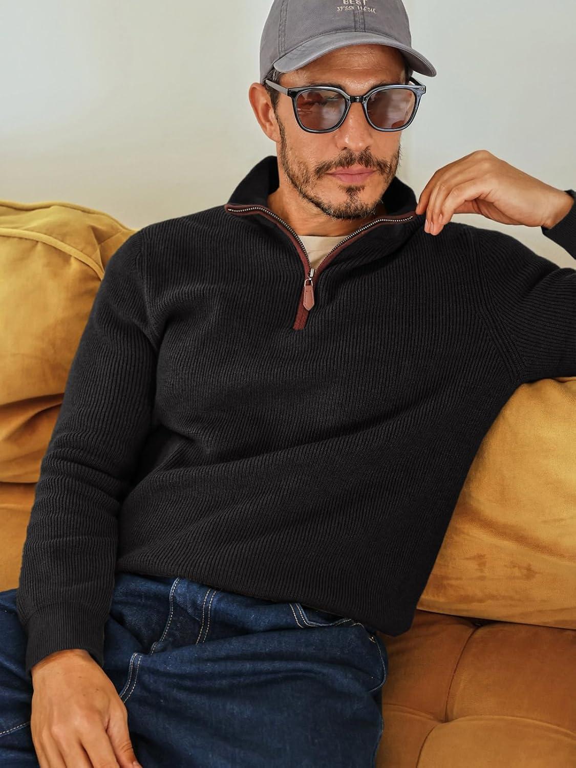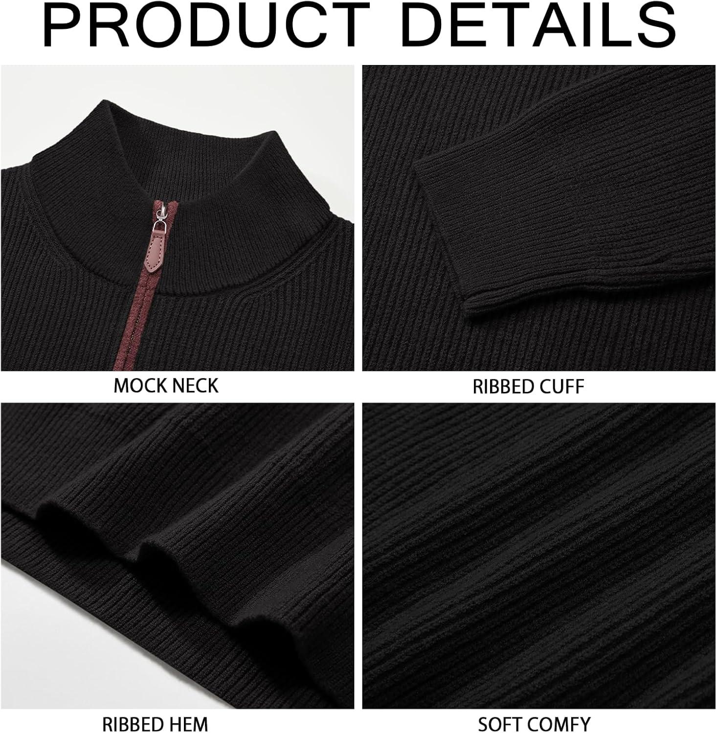 Runcati Mens Quarter-Zip Pullover Sweater Casual Mock Neck Winter Warm Ribbed Polo Sweaters(Black)