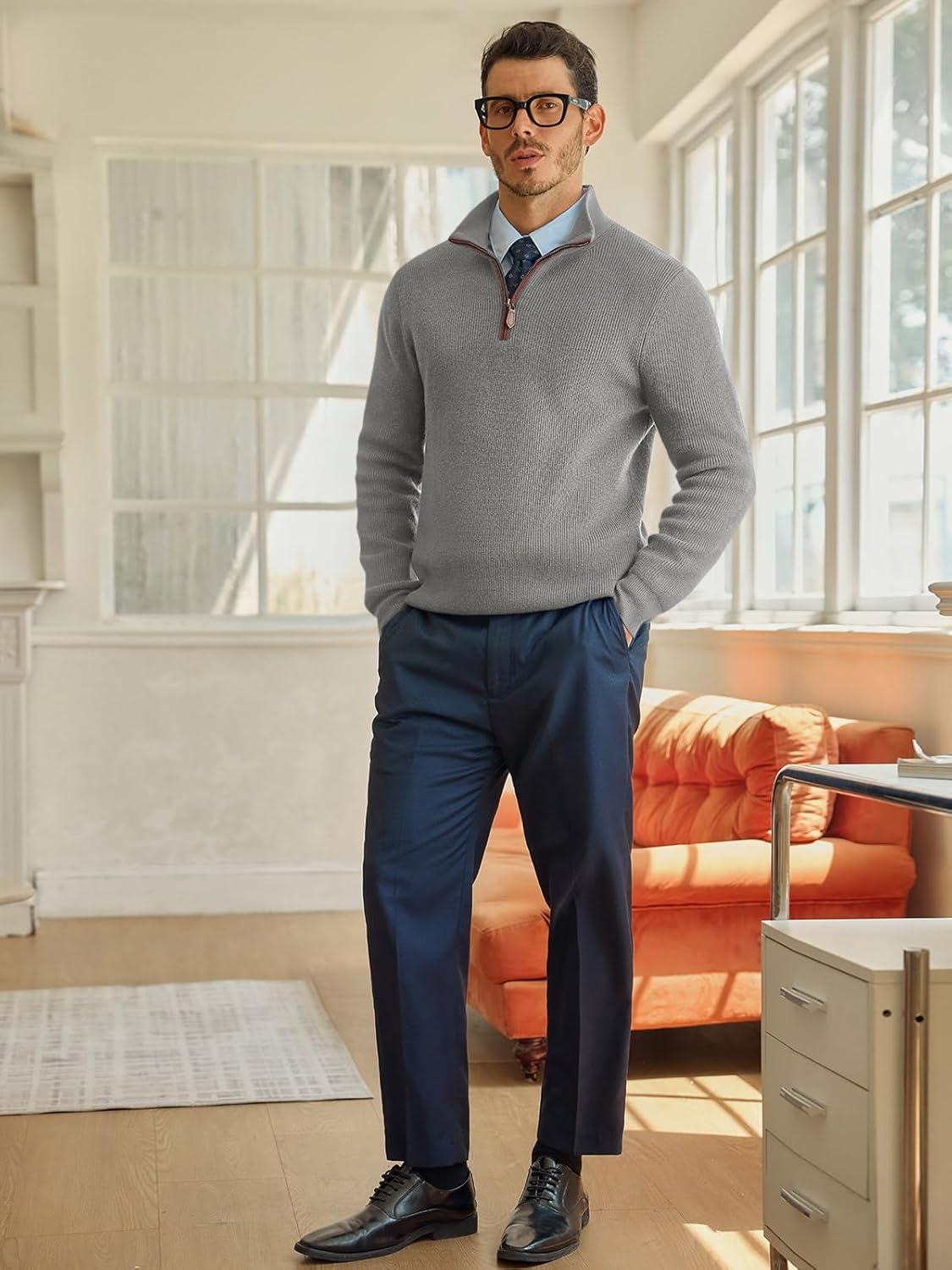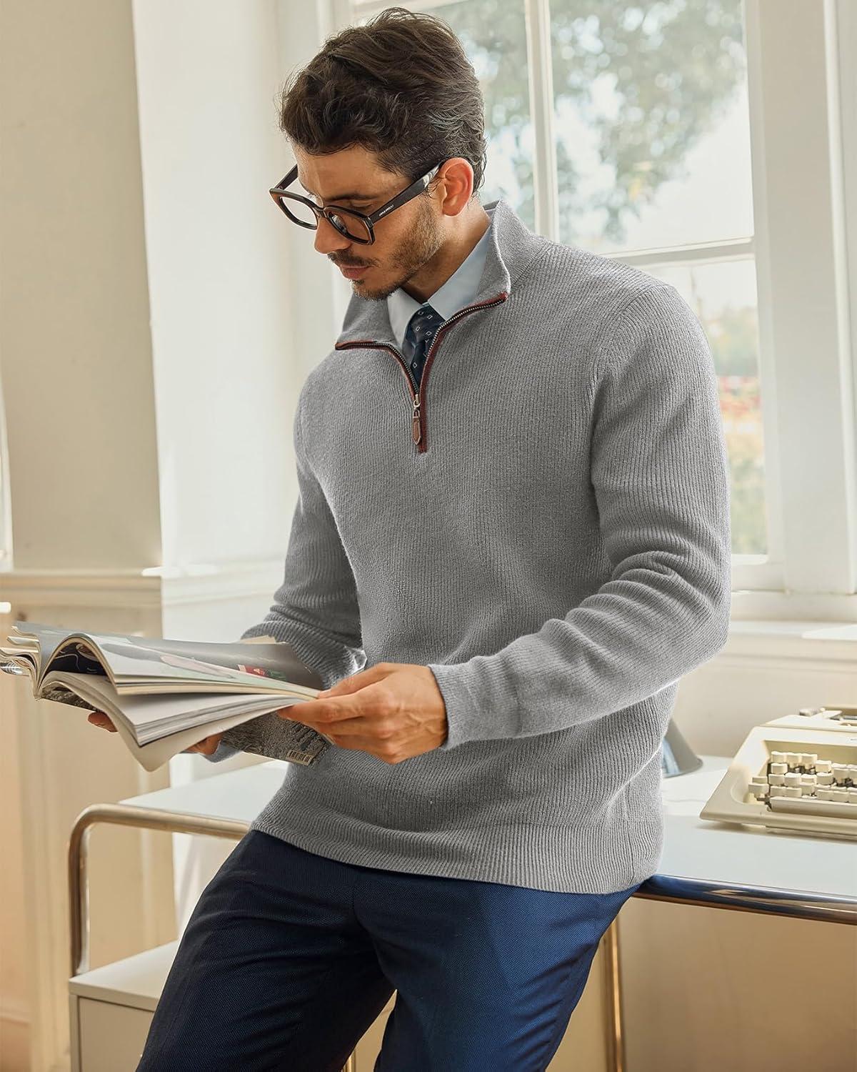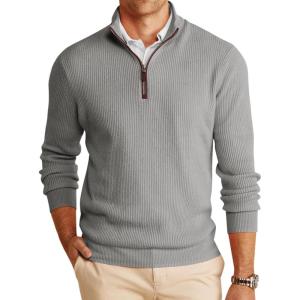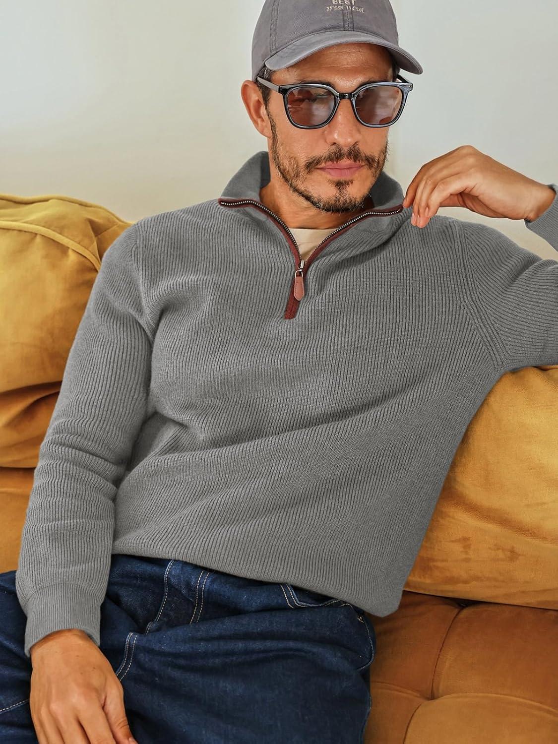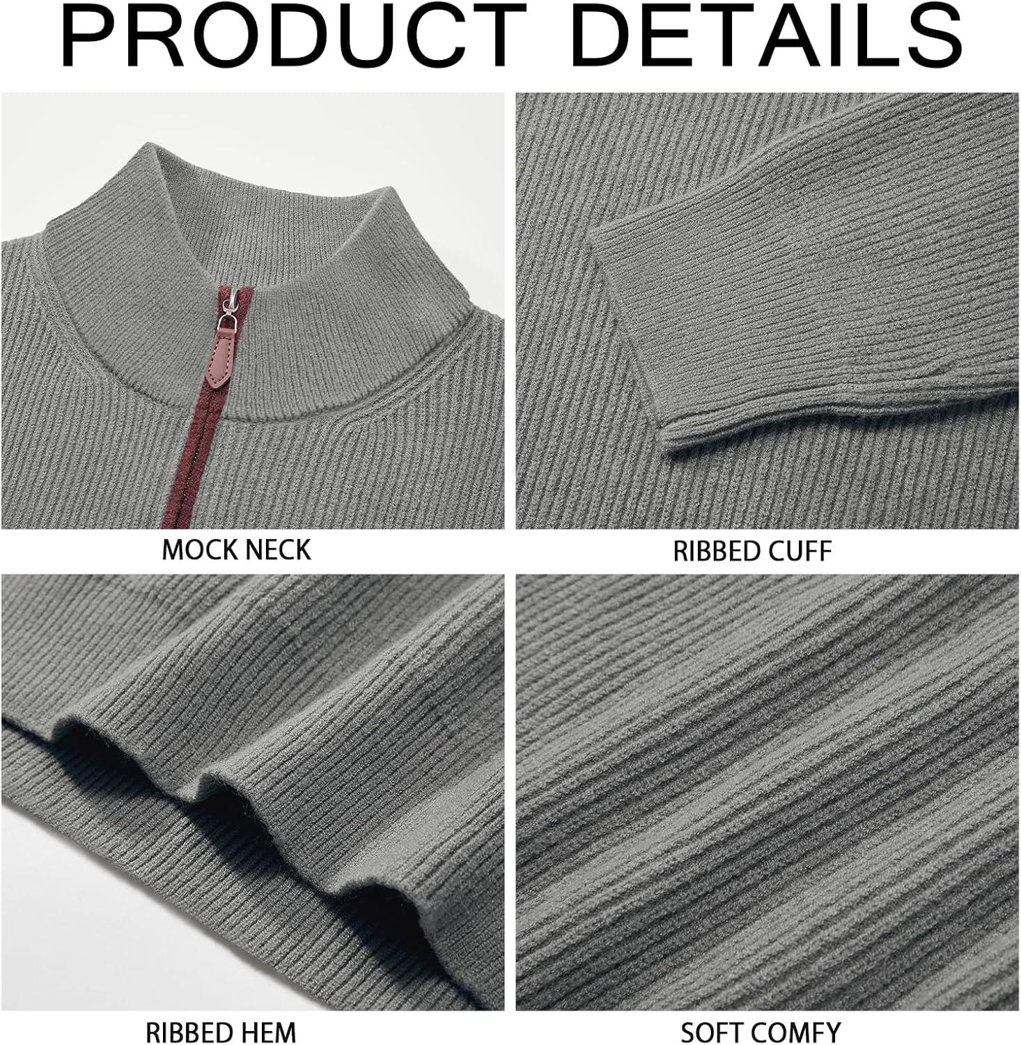 Runcati Mens Quarter-Zip Pullover Sweater Casual Mock Neck Winter Warm Ribbed Polo Sweaters(Gray)
