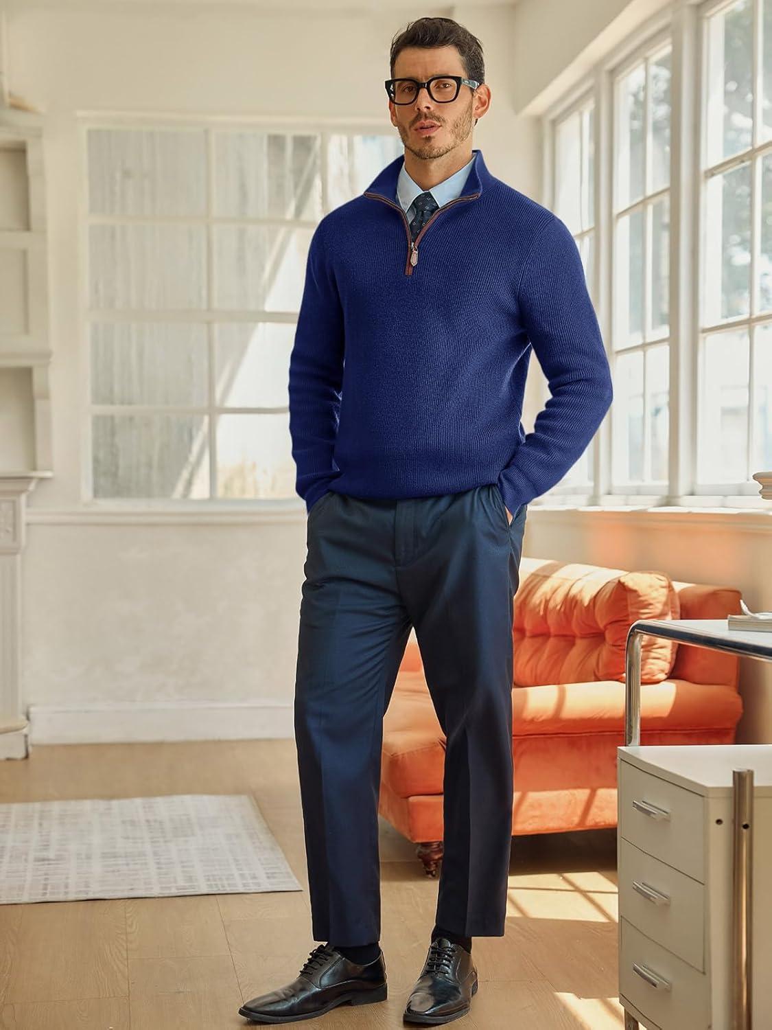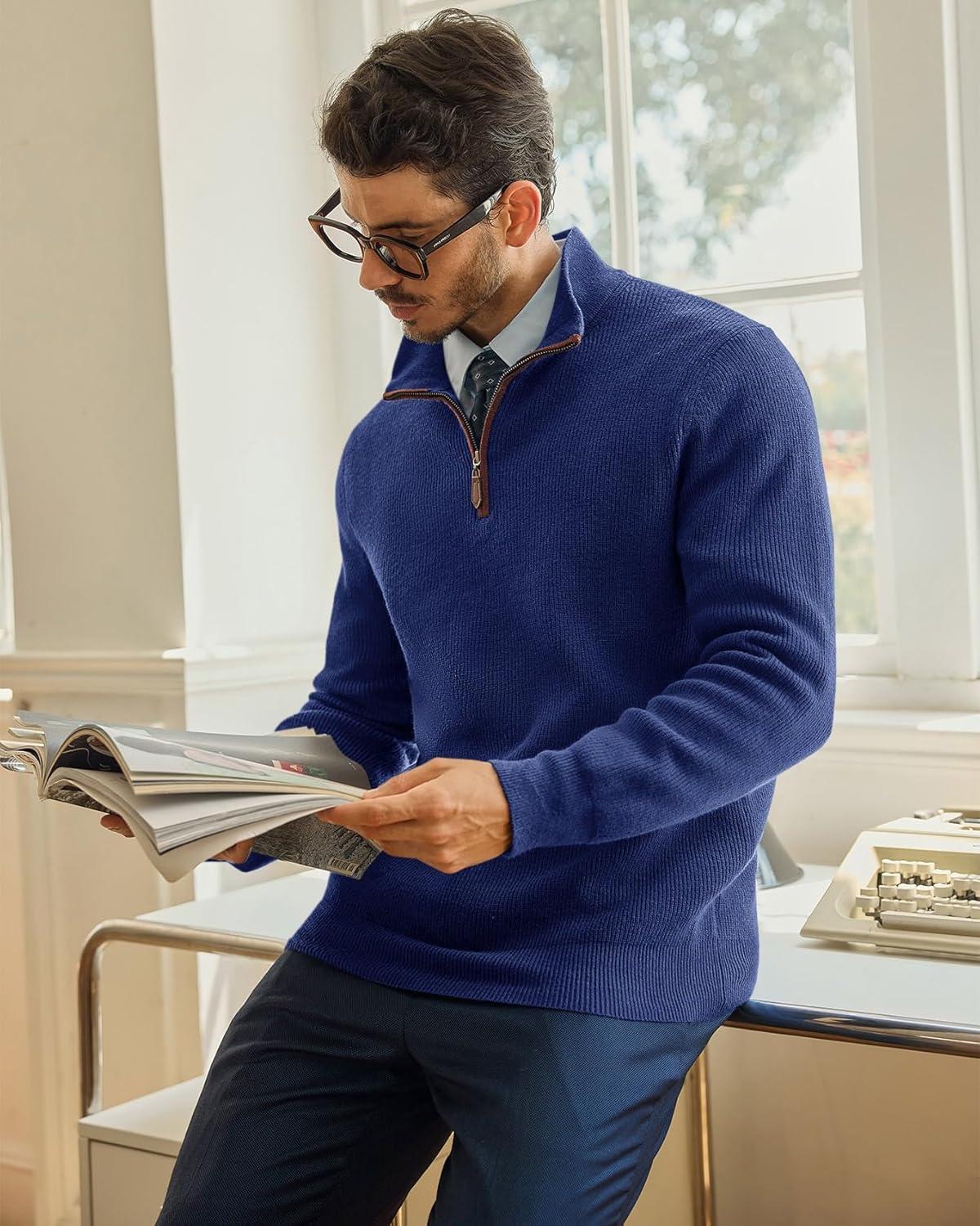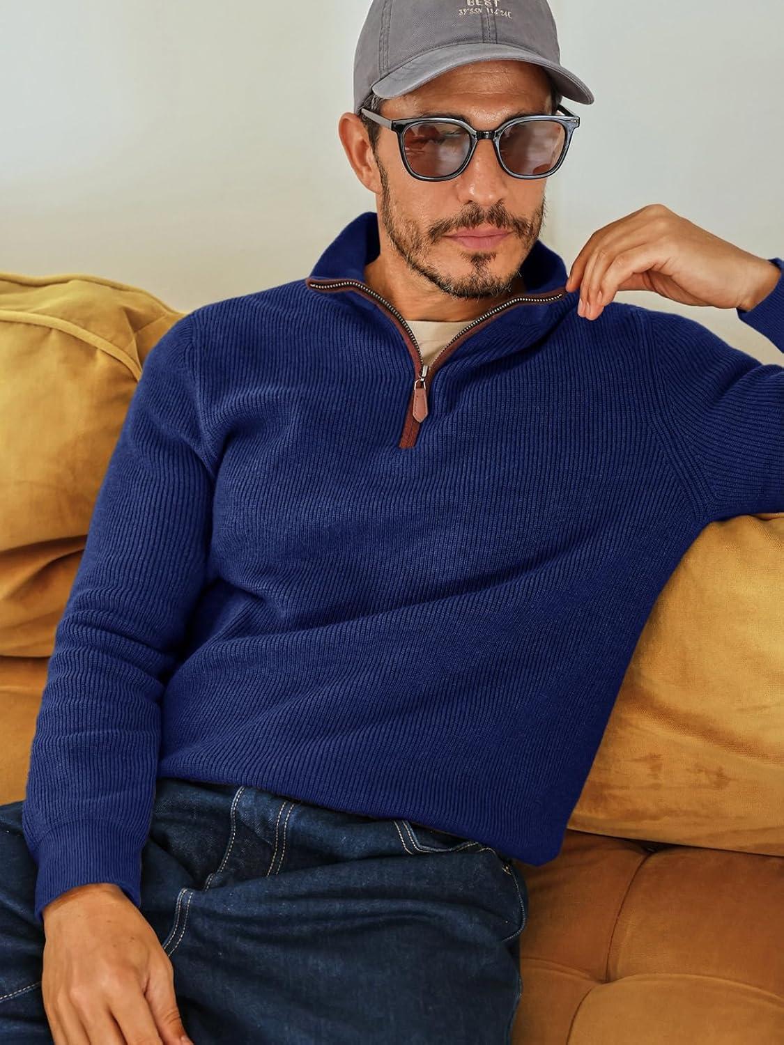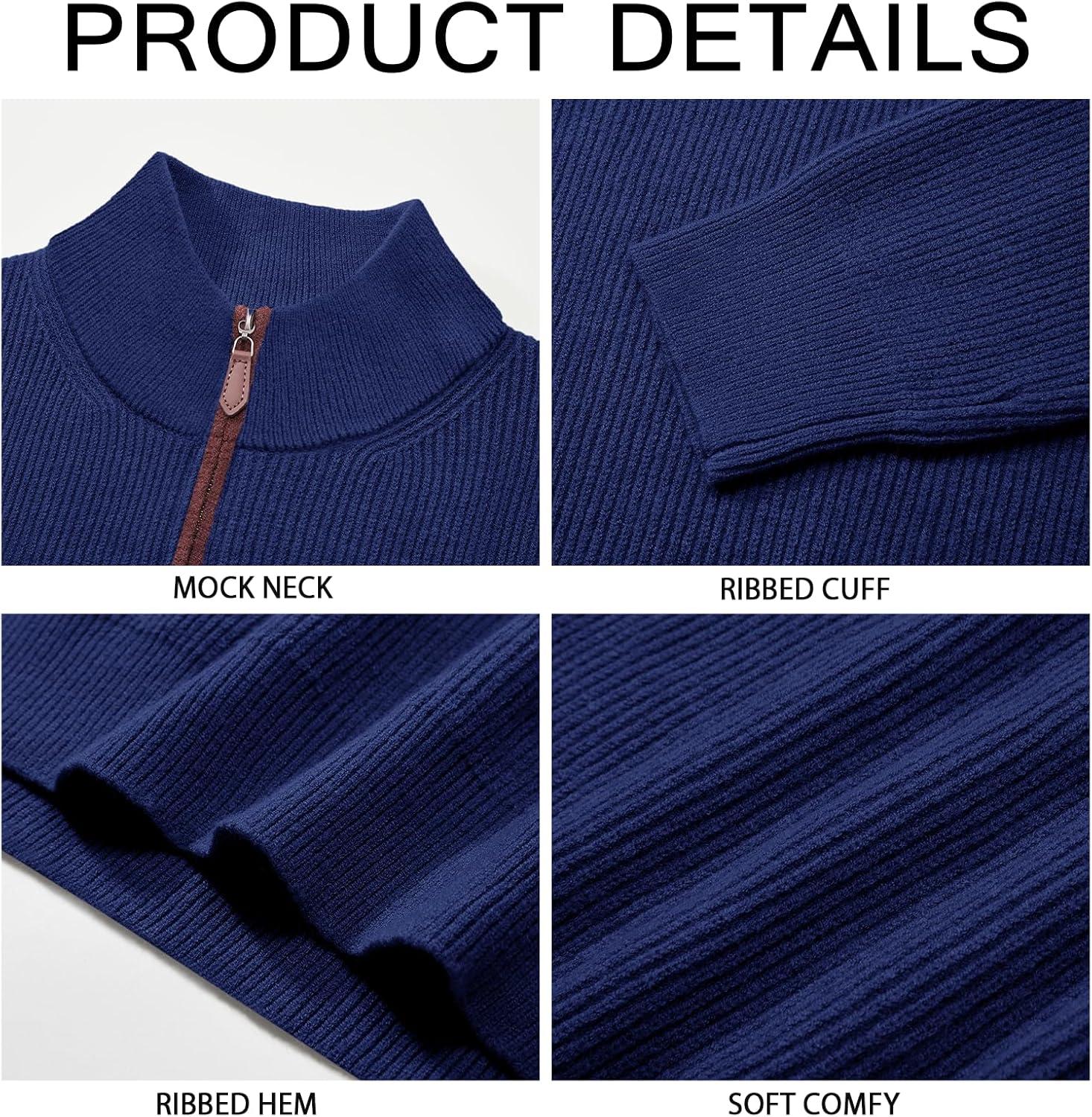 Runcati Mens Quarter-Zip Pullover Sweater Casual Mock Neck Winter Warm Ribbed Polo Sweaters(Navy)