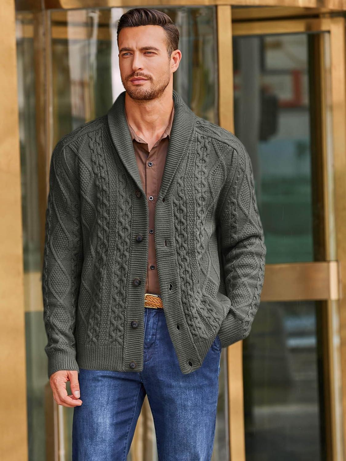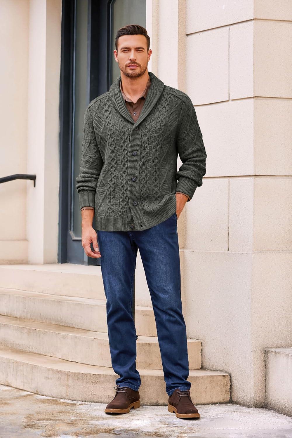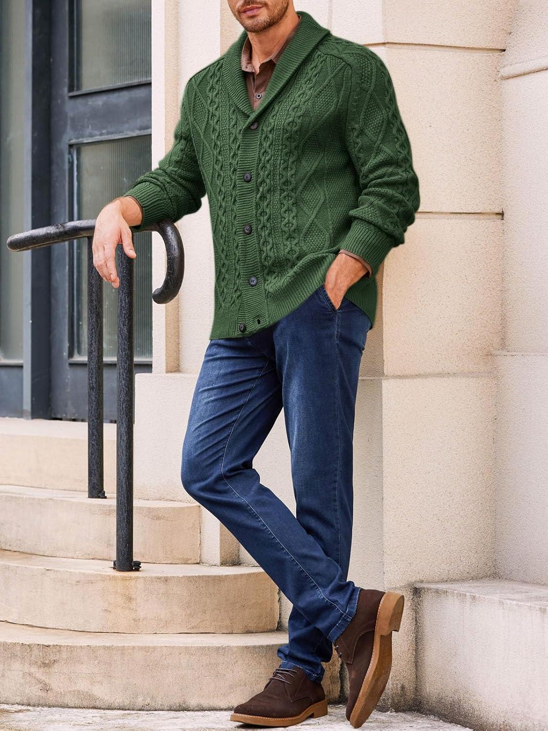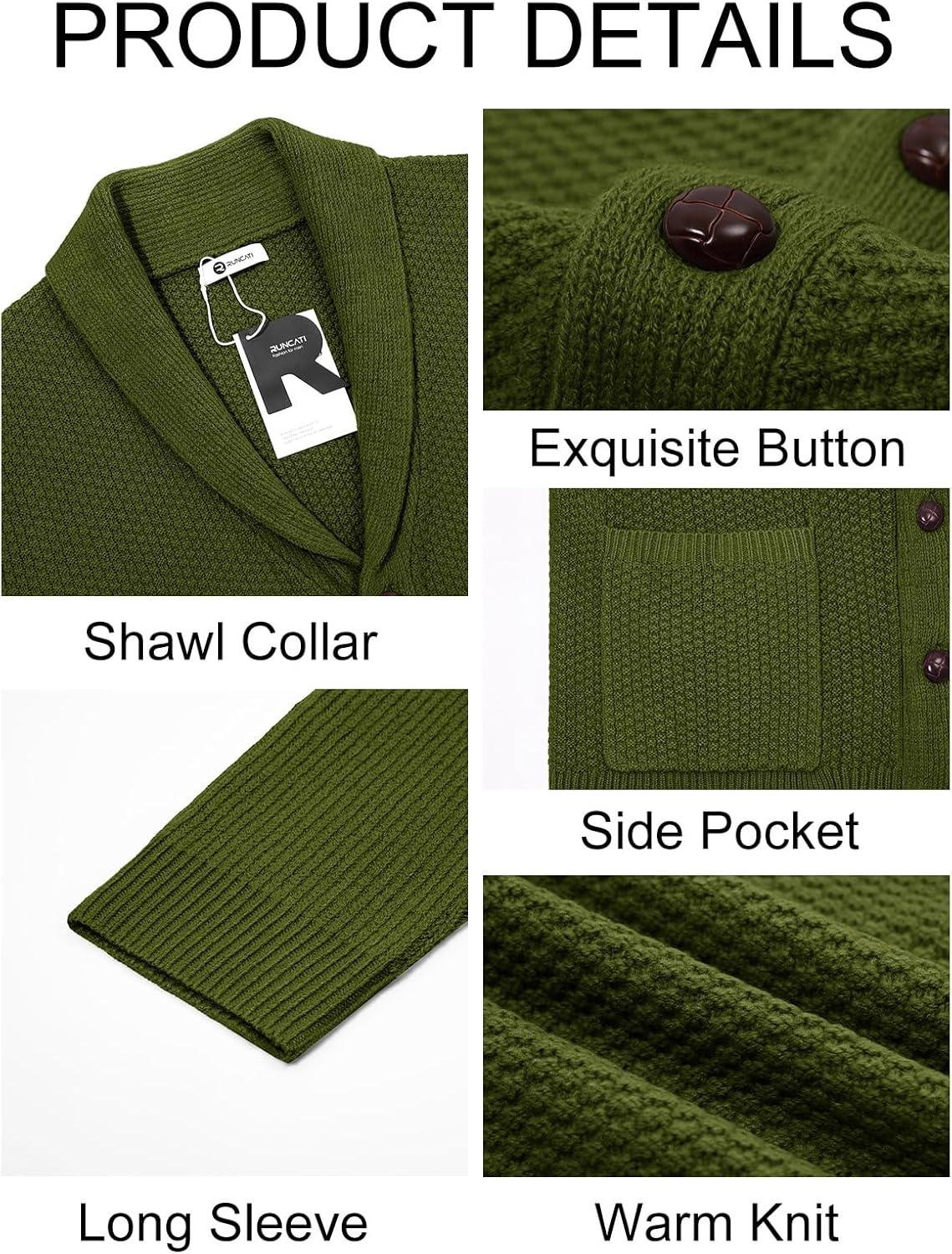 Runcati Mens Shawl Collar Cardigan Sweater Cable Knitted Button Down Sweaters Chunky Fall Winter Outwear(Army Green)