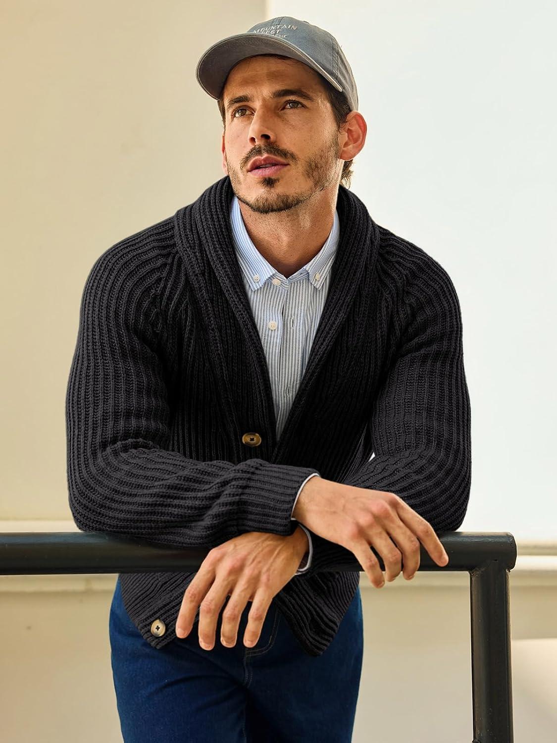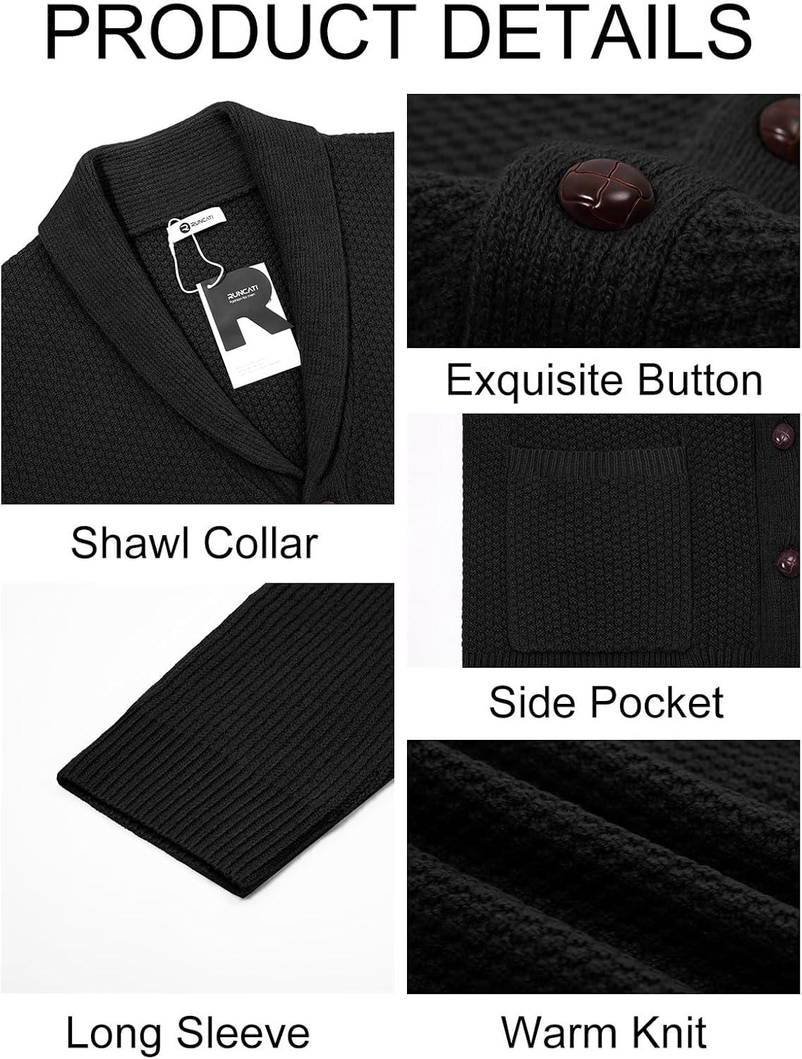 Runcati Mens Shawl Collar Cardigan Sweater Cable Knitted Button Down Sweaters Chunky Fall Winter Outwear(Black)