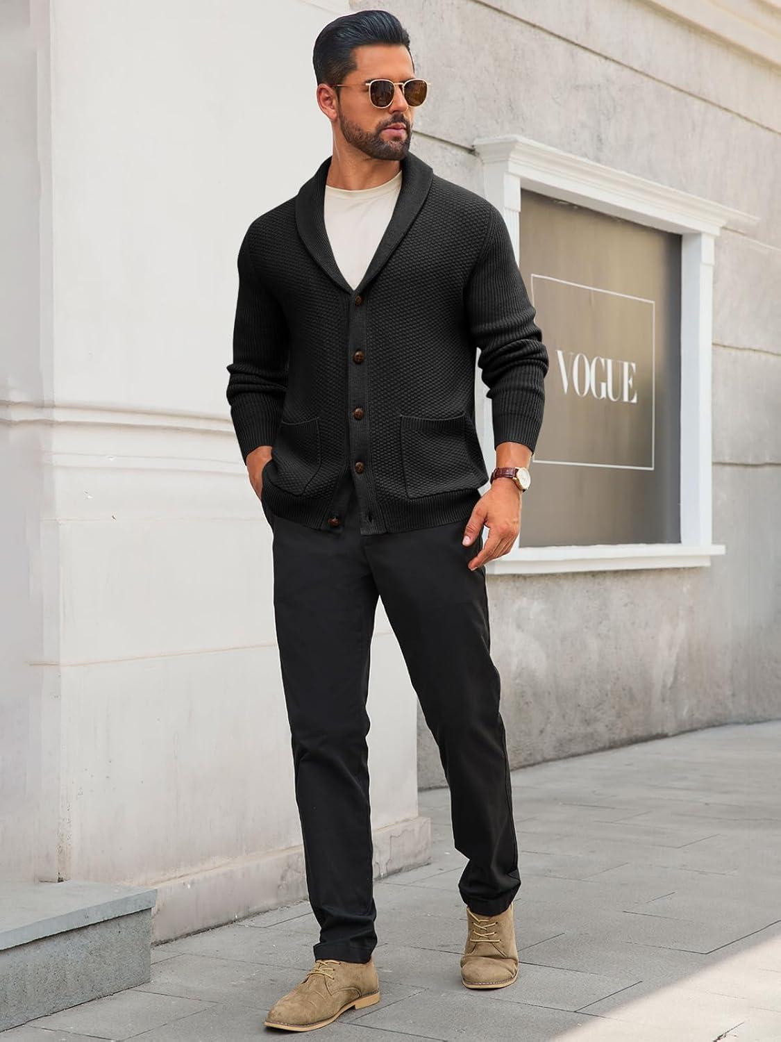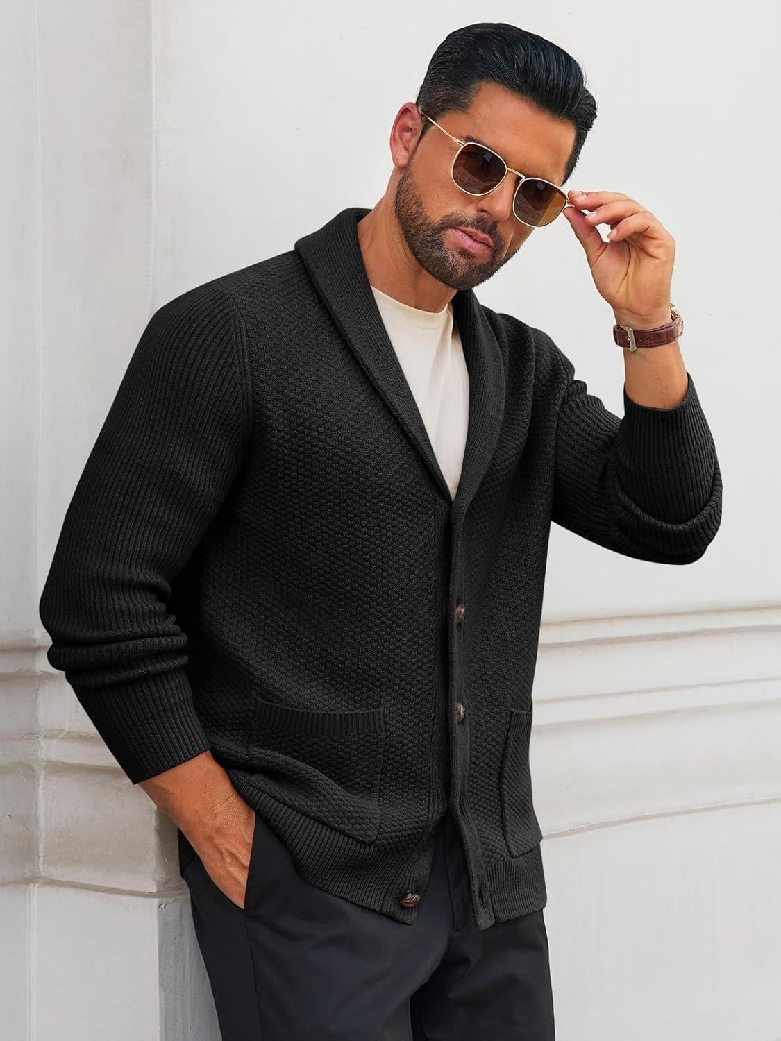 Runcati Mens Shawl Collar Cardigan Sweater Button Down Textured Knit Sweaters Casual Chunky Cardigan with Pockets(Black)