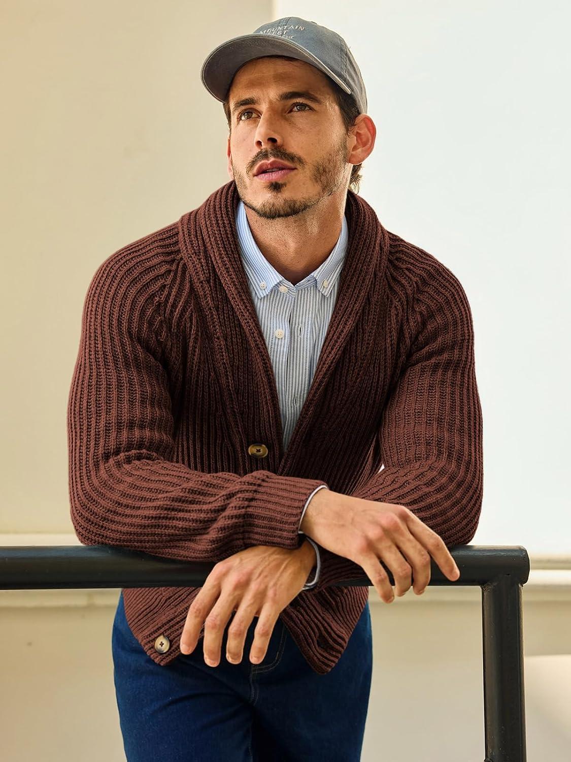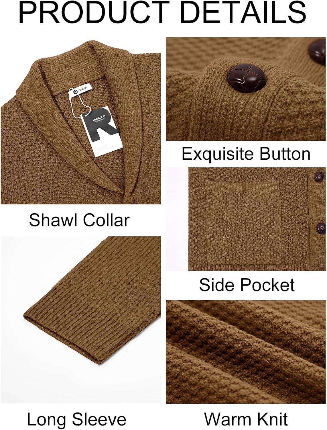 Runcati Mens Shawl Collar Cardigan Sweater Cable Knitted Button Down Sweaters Chunky Fall Winter Outwear(Coffee)