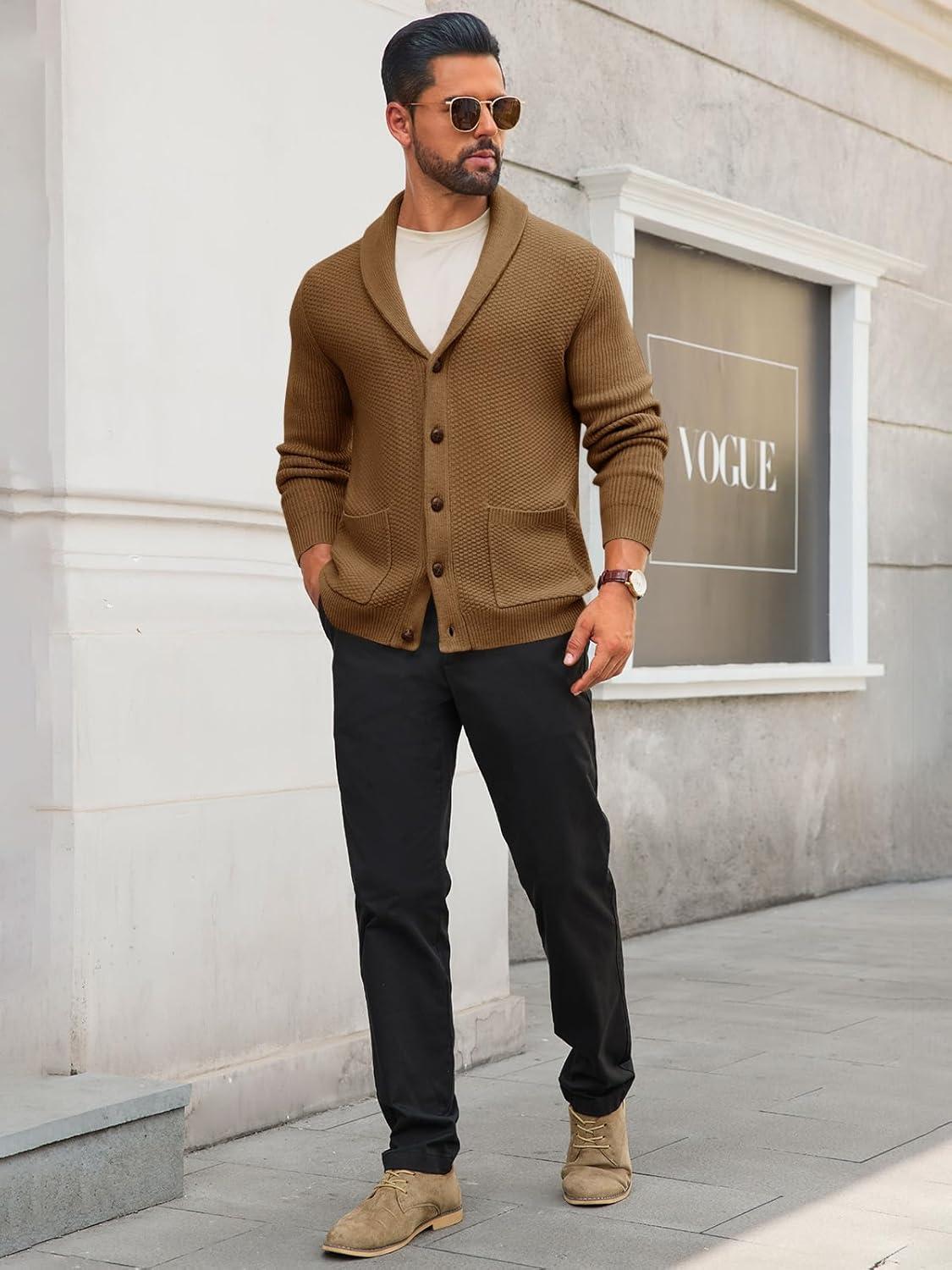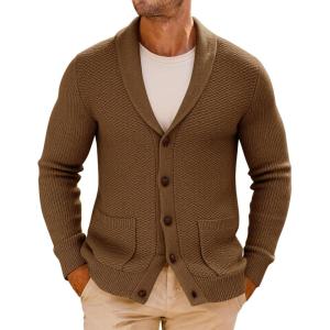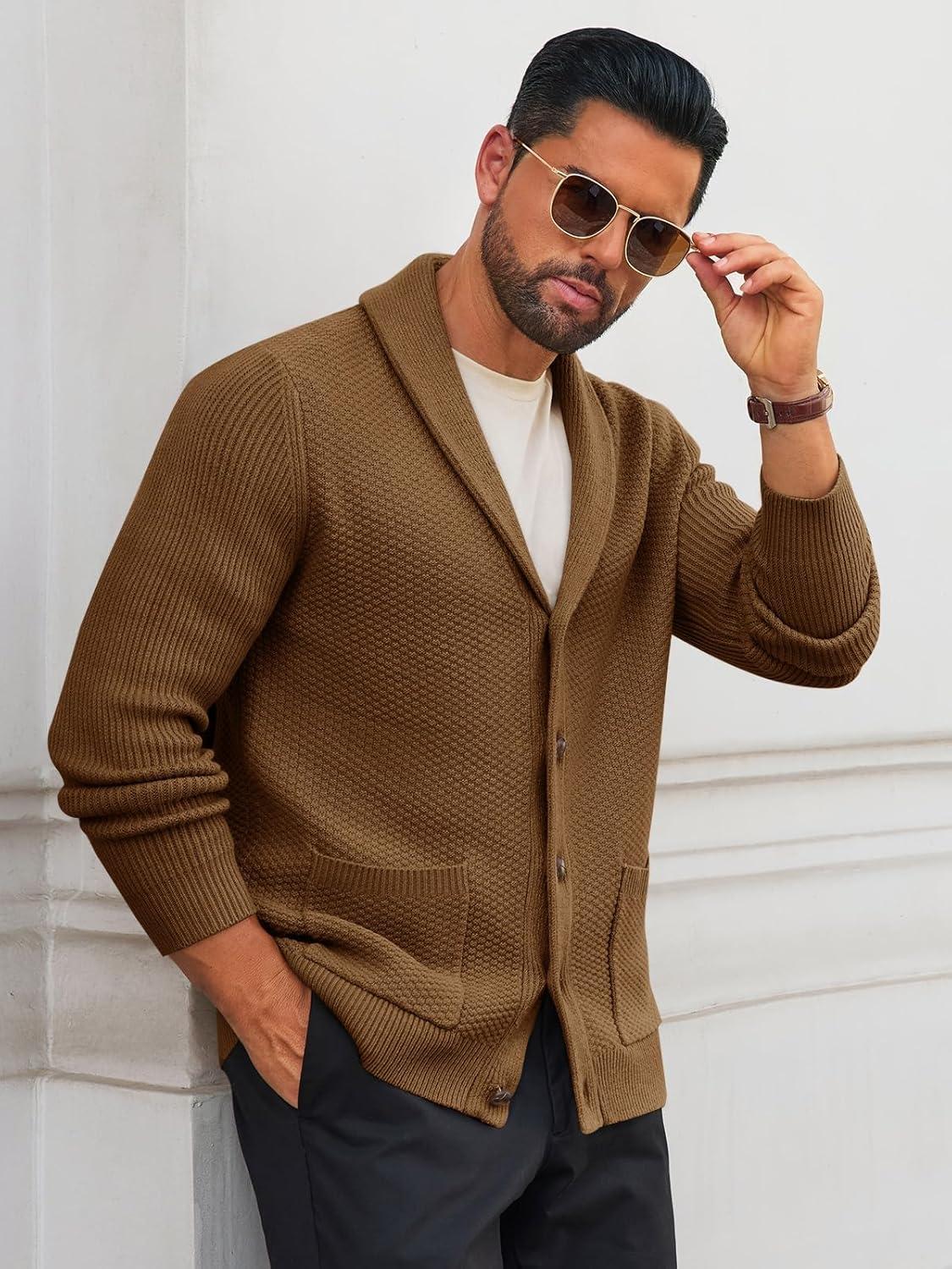 Runcati Mens Shawl Collar Cardigan Sweater Button Down Textured Knit Sweaters Casual Chunky Cardigan with Pockets(Brown)