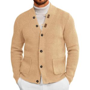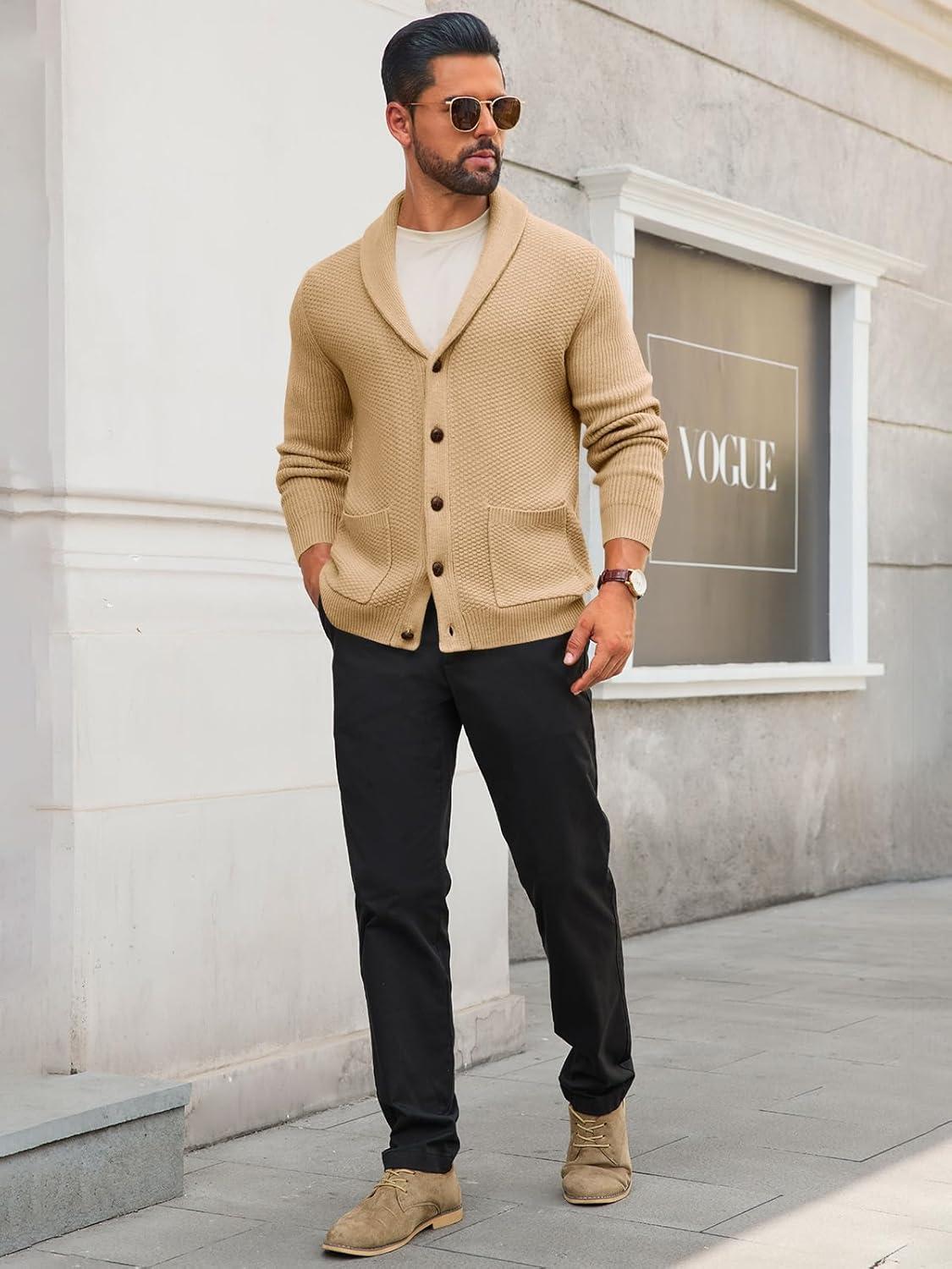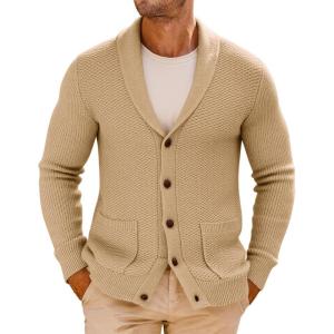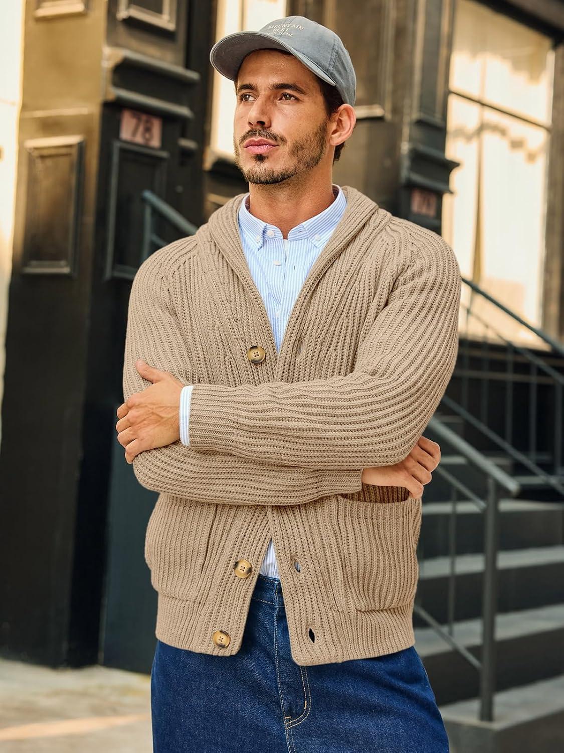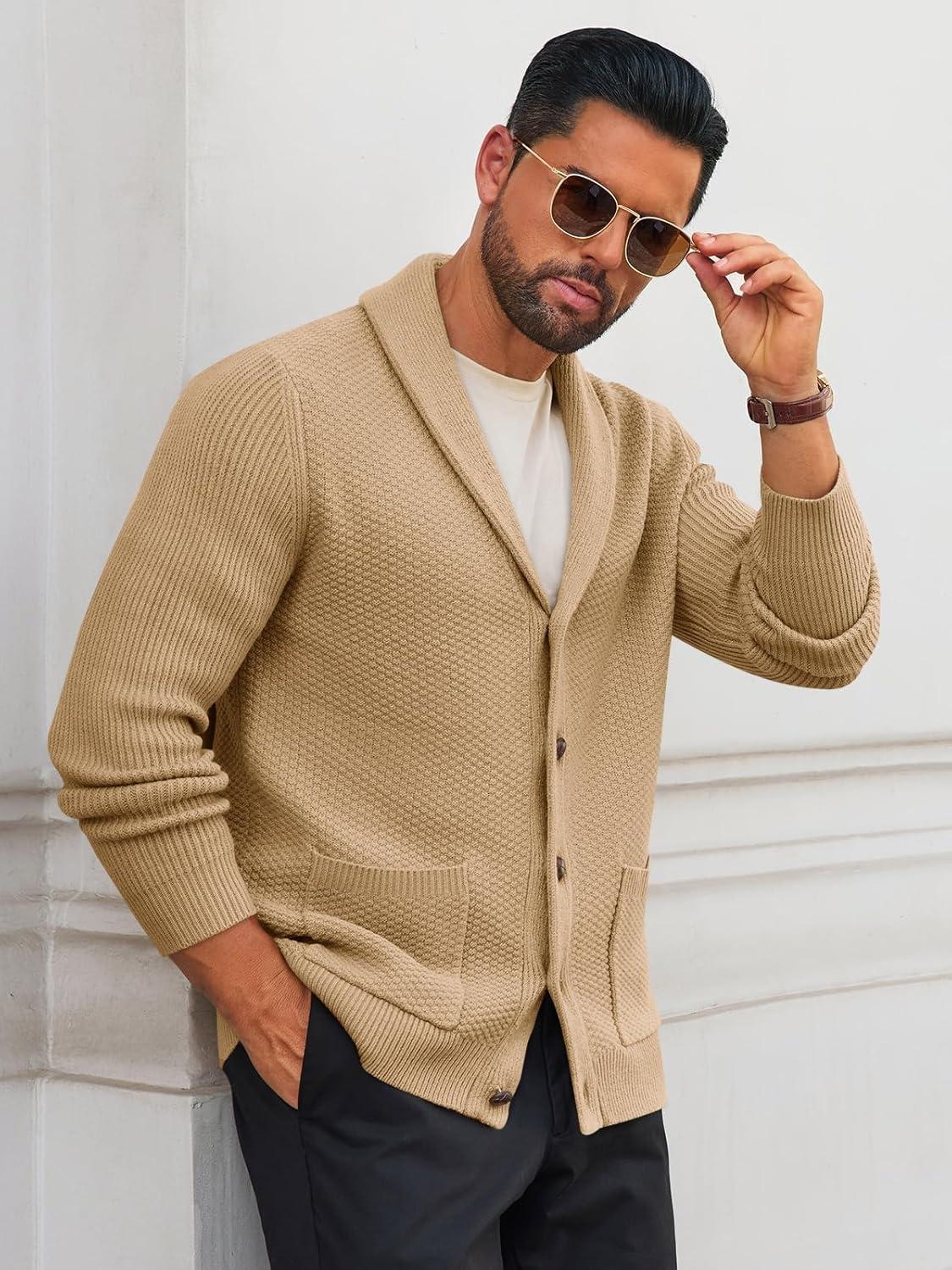 Runcati Mens Shawl Collar Cardigan Sweater Button Down Textured Knit Sweaters Casual Chunky Cardigan with Pockets(Khaki)